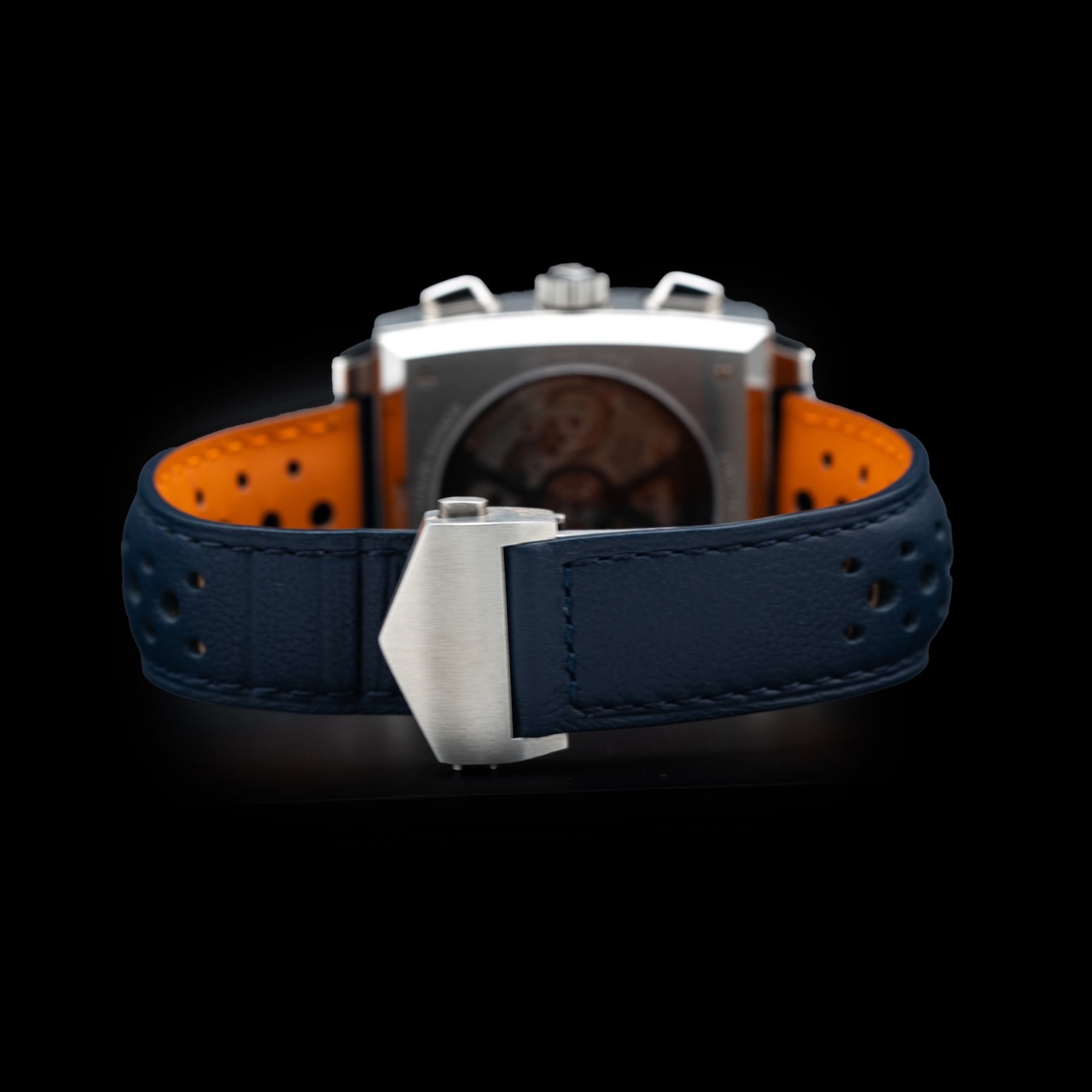 This watch features a 39mm steel case on leather strap. This watch also sports a blue dial. Powered by an automatic movement. Water resistance up to 100 meters.