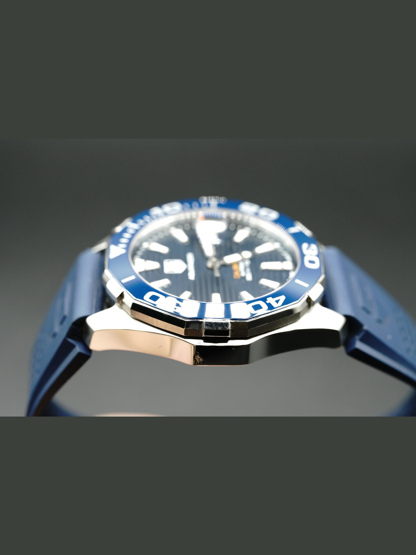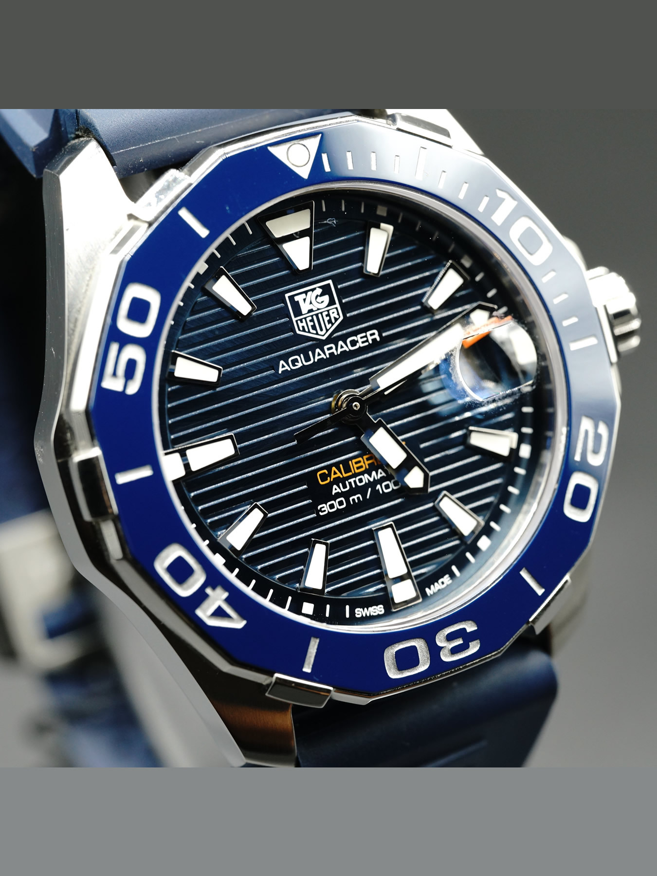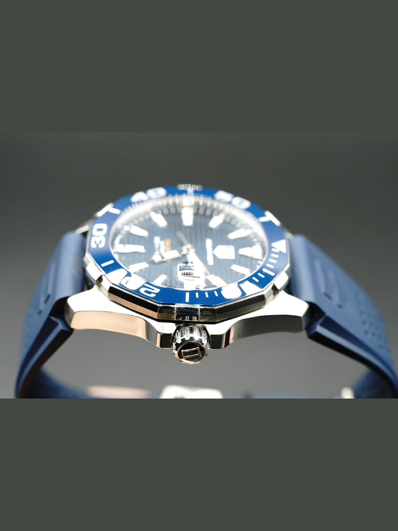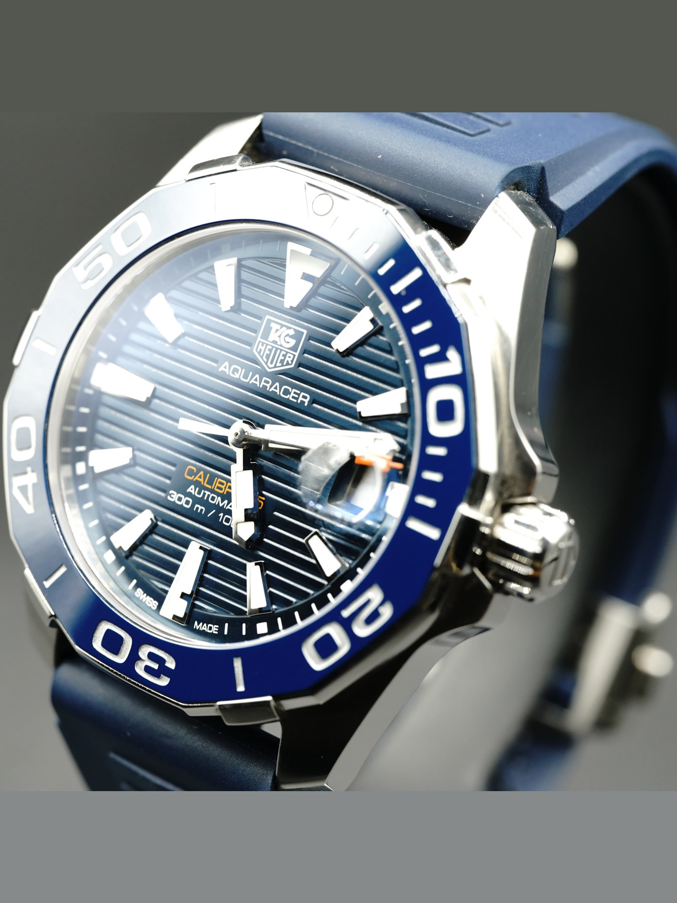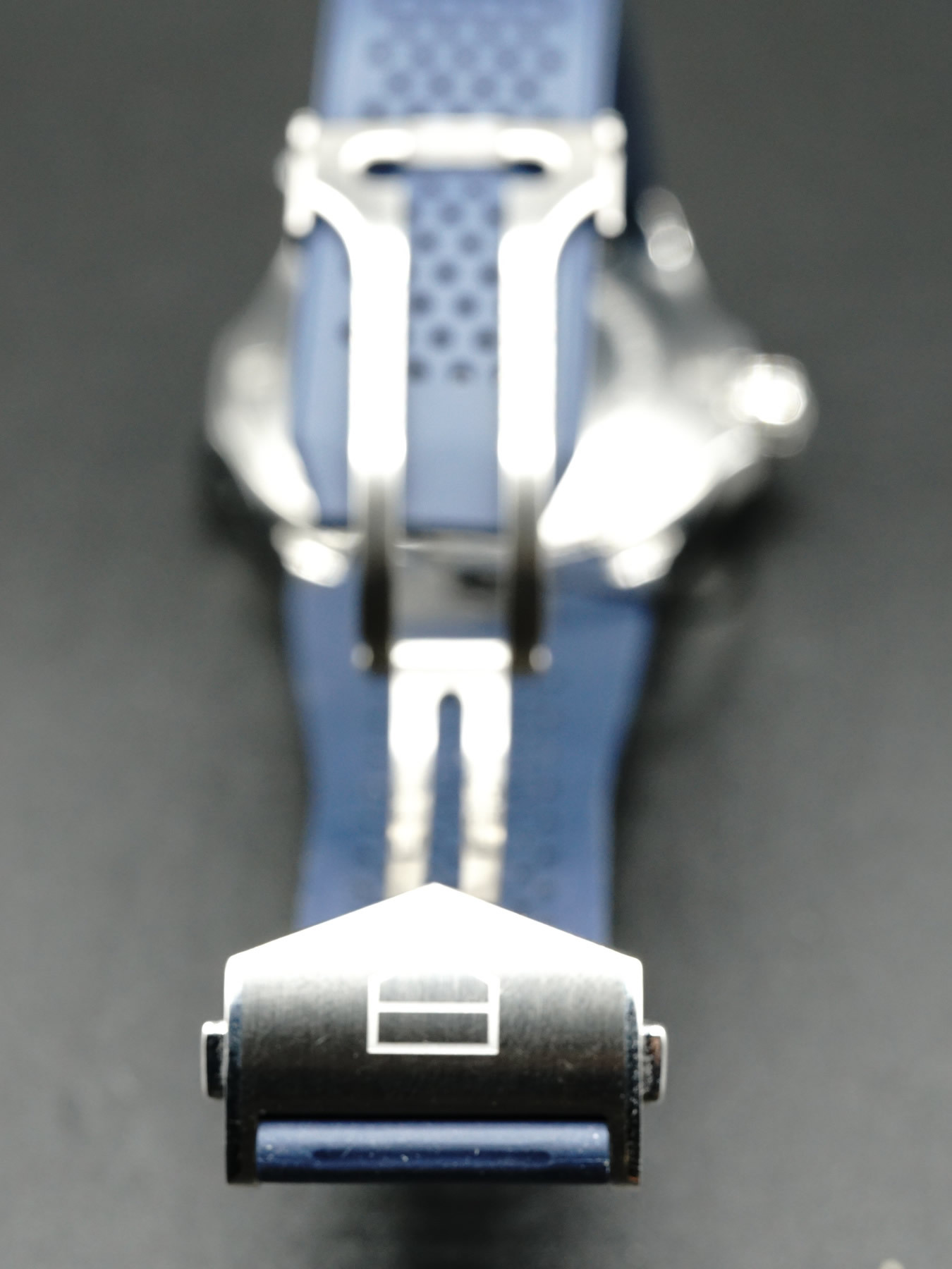 - This timepiece features a 41mm steel case paired with a high quality rubber strap. It showcases a distinctive blue dial and is powered by a precise automatic winding movement. The watch is designed with a water resistance of up to 300m.