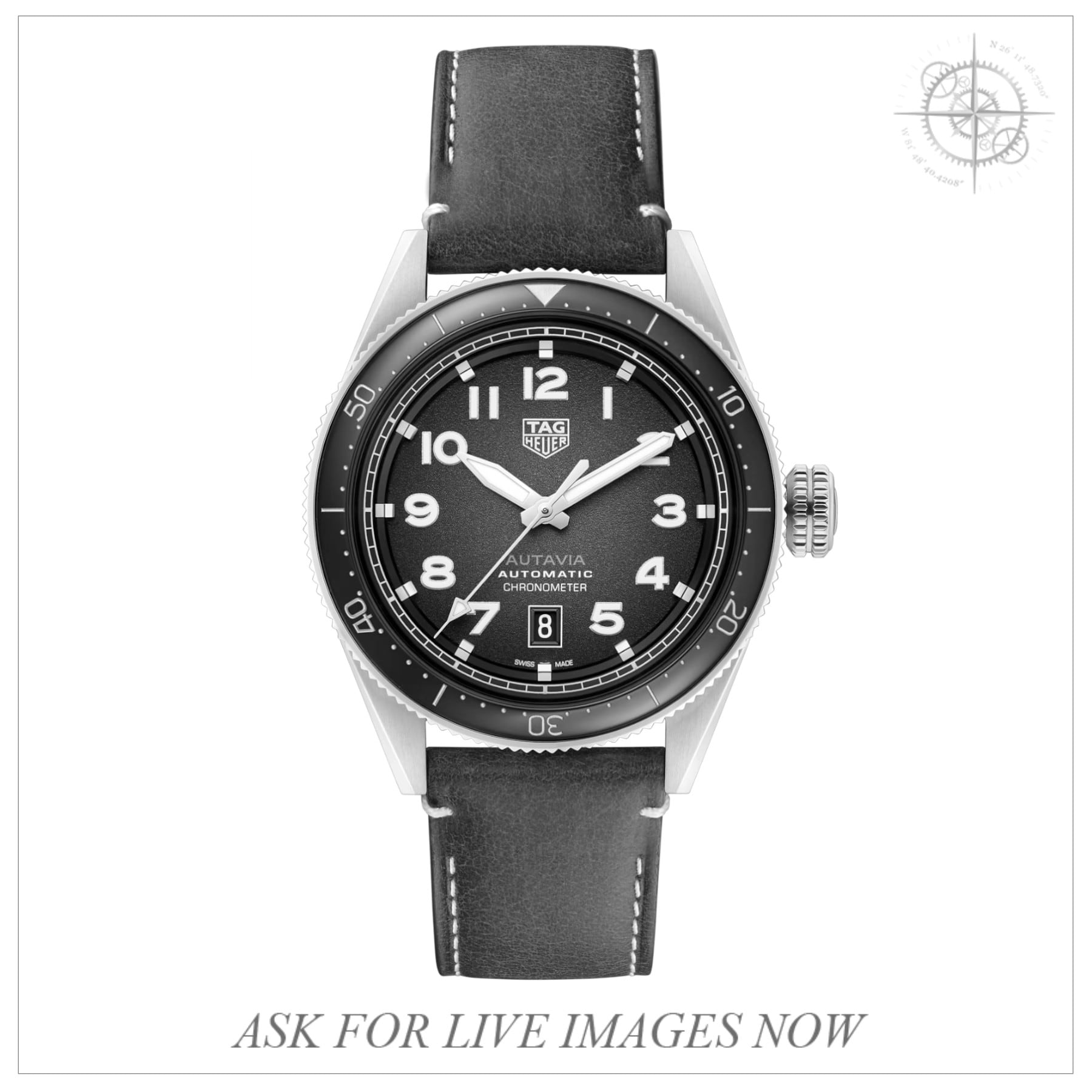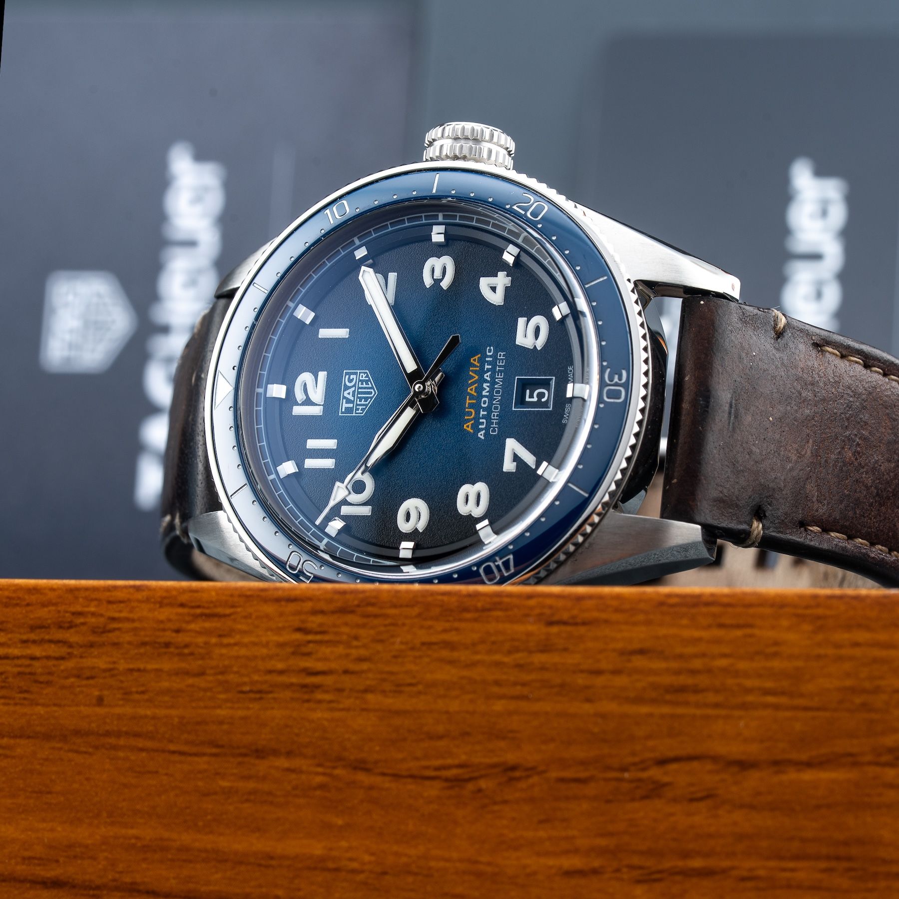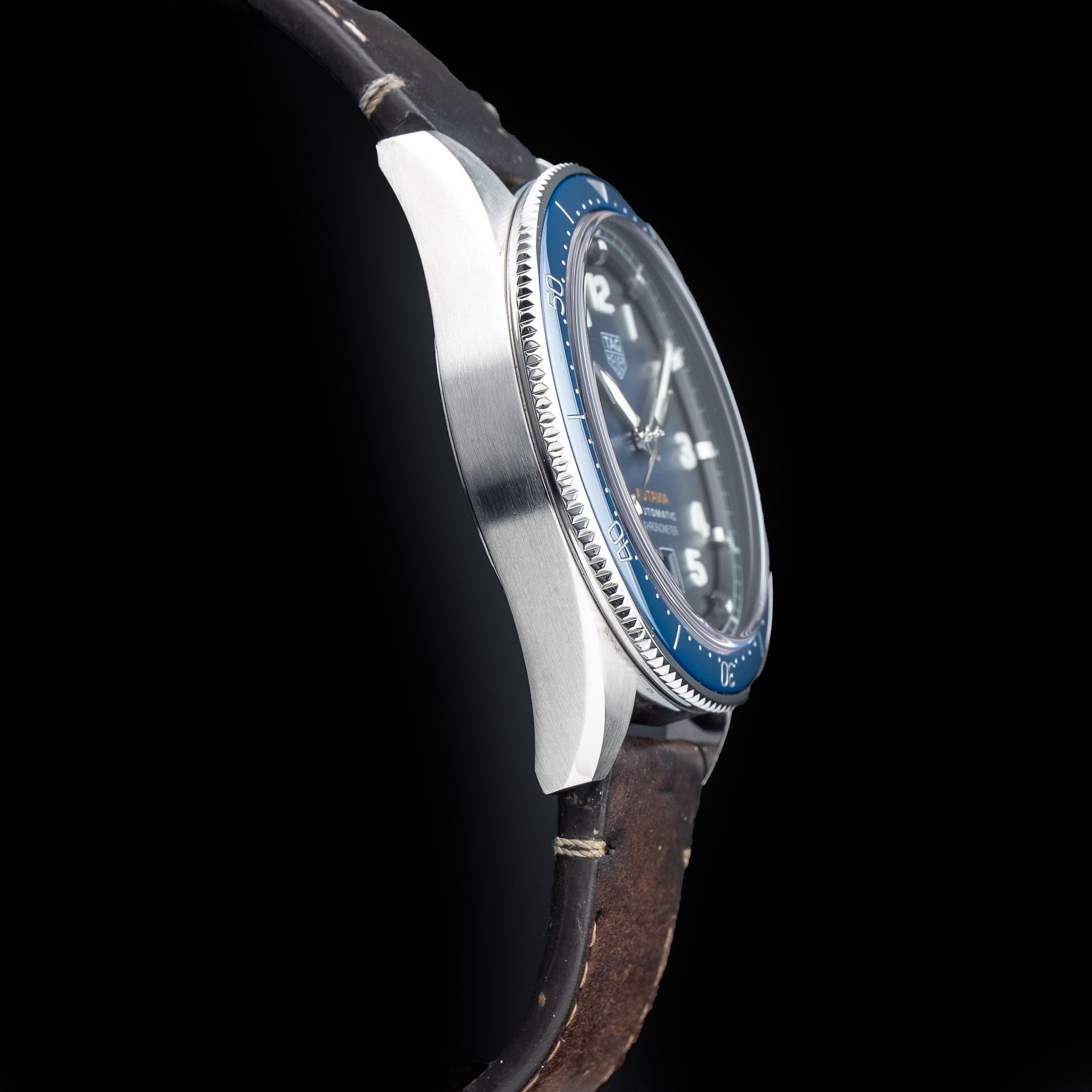 This watch features a 42mm steel case on leather strap. This watch also sports a blue dial. Powered by an automatic movement. Water resistance up to 100 meters.