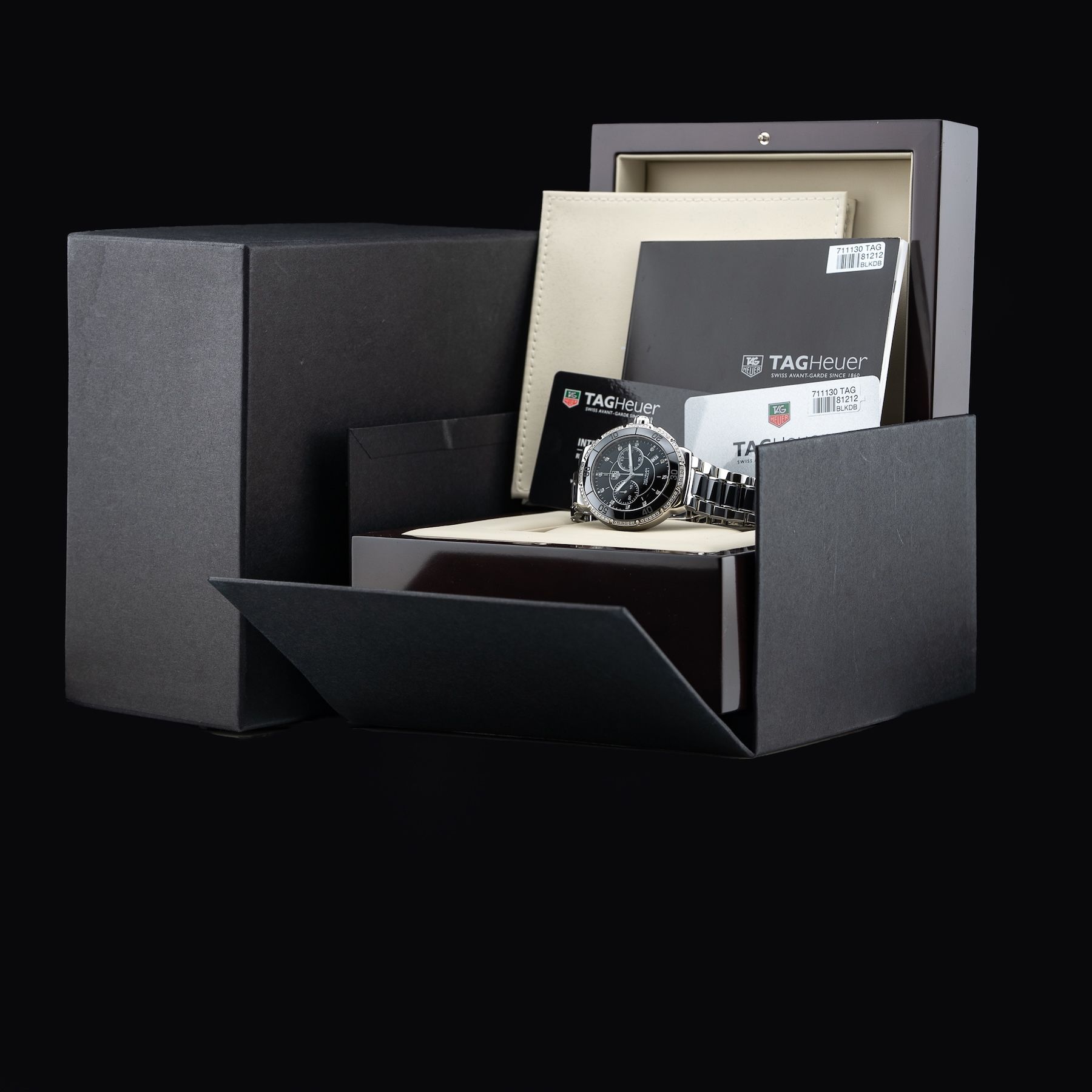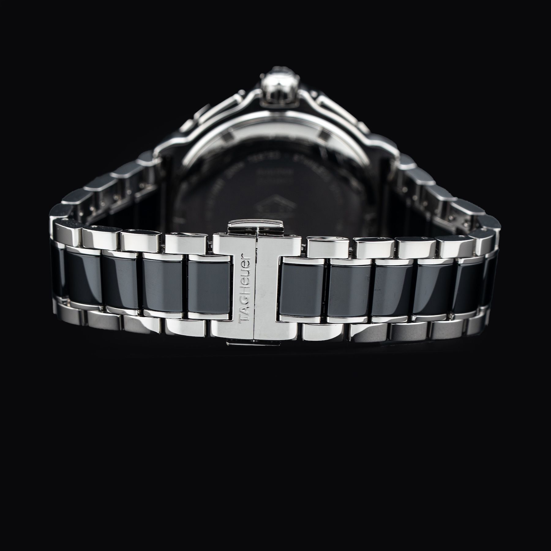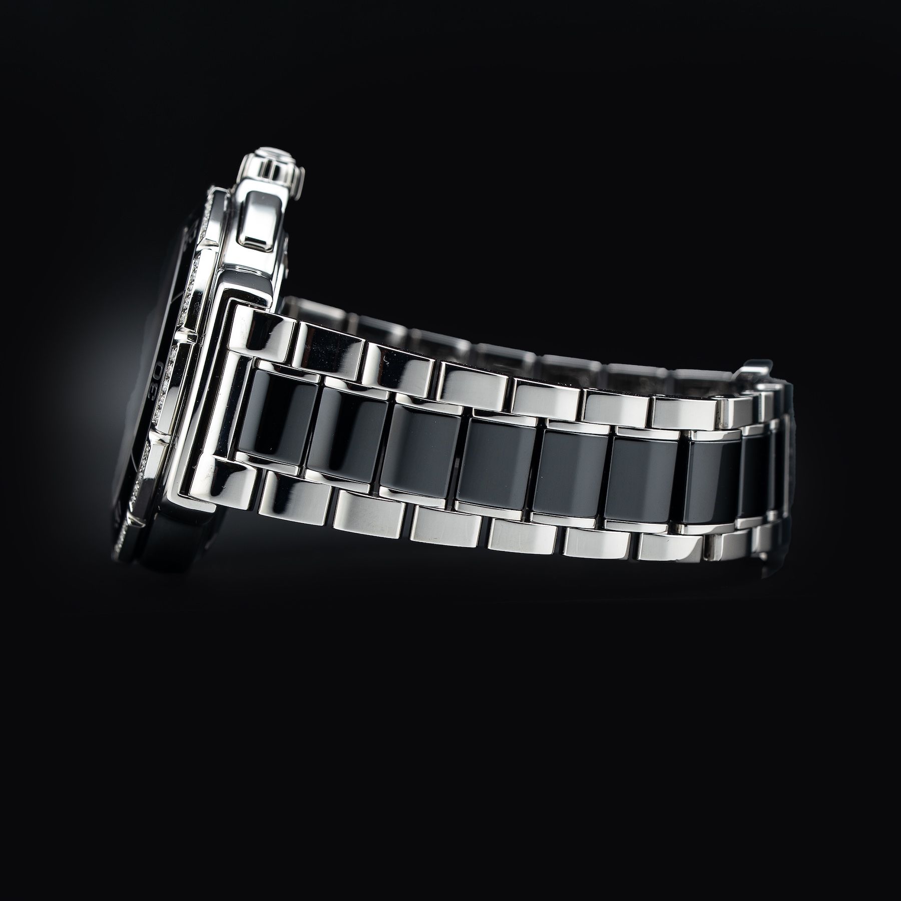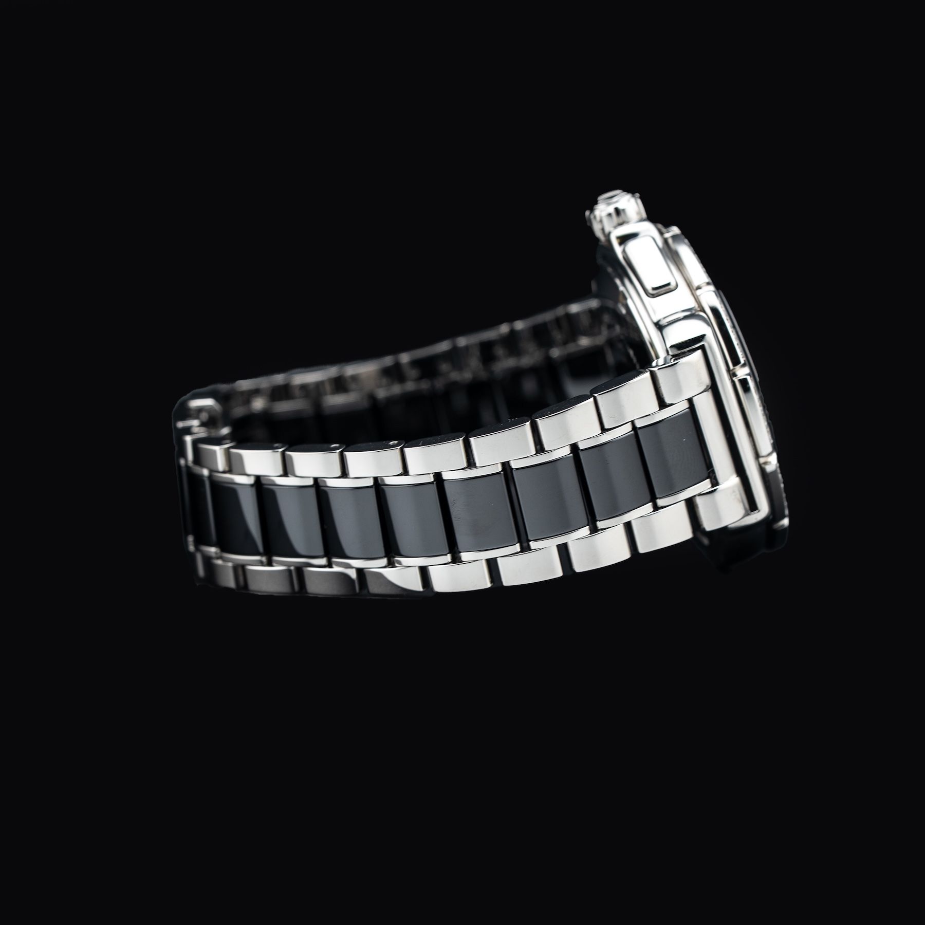 This watch features a 41mm steel & ceramic polished case on steel & ceramic bracelet. This watch also sports a black dial. Powered by a quartz movement. Water resistance up to 200 meters.