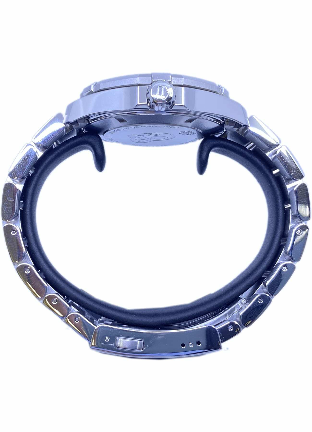 - This timepiece features a 43mm steel case paired with a high quality steel bracelet. It showcases a distinctive black dial and is powered by a precise automatic winding movement. The watch is designed with a water resistance of up to 300m.