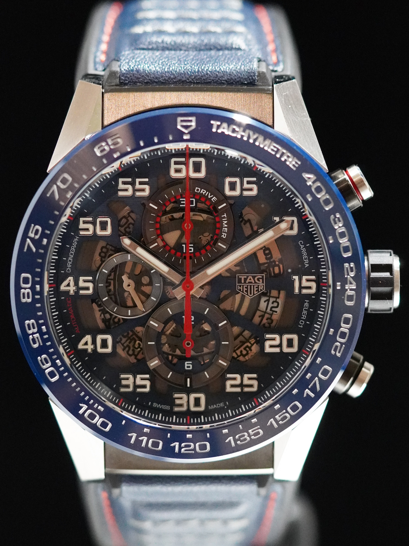 This watch features a 45mm steel case on stel strap. This watch also sports a blue dial. Powered by a calibre HEUER01 Automatic movement. Water resistance up to 100 meters.