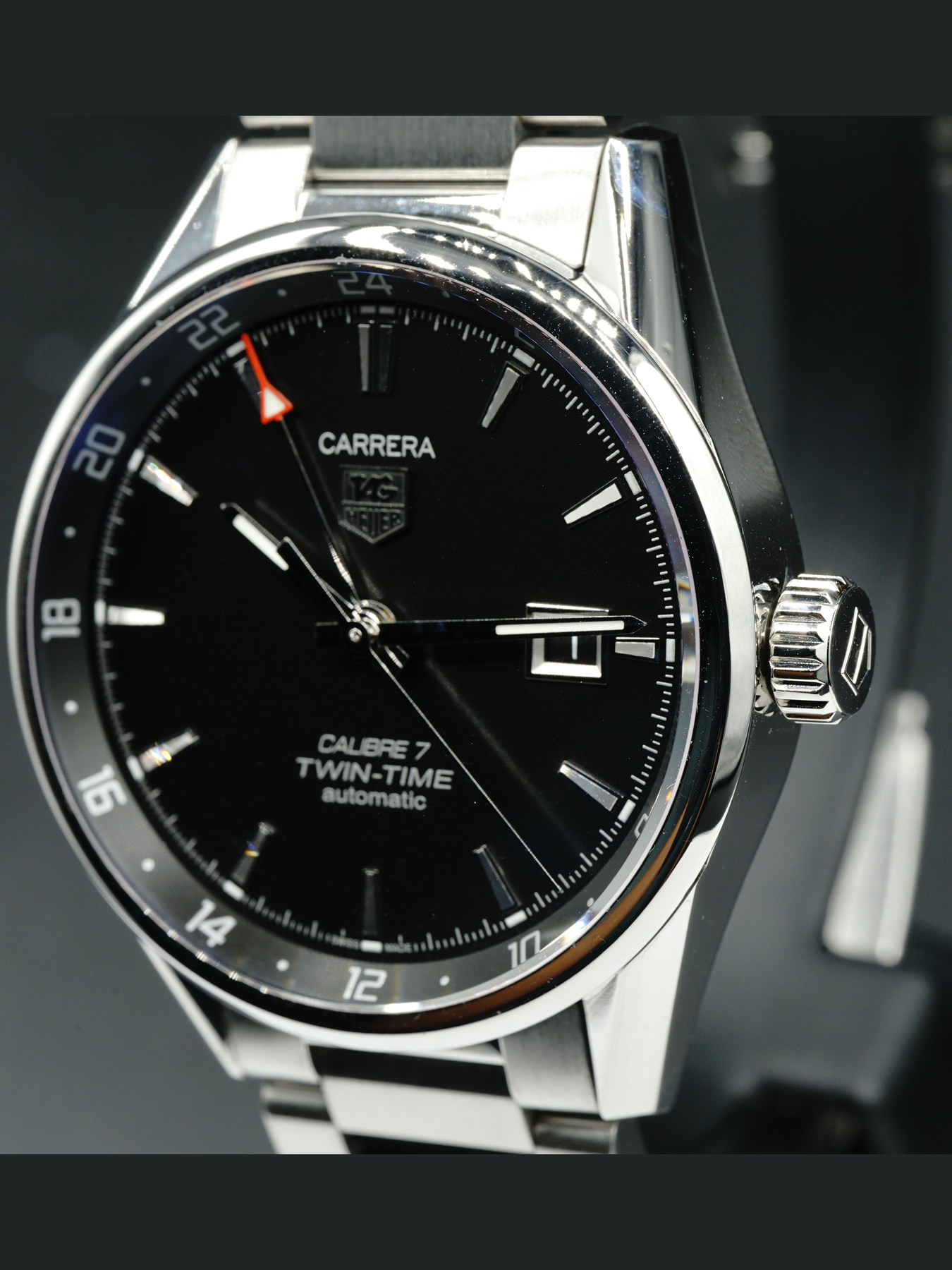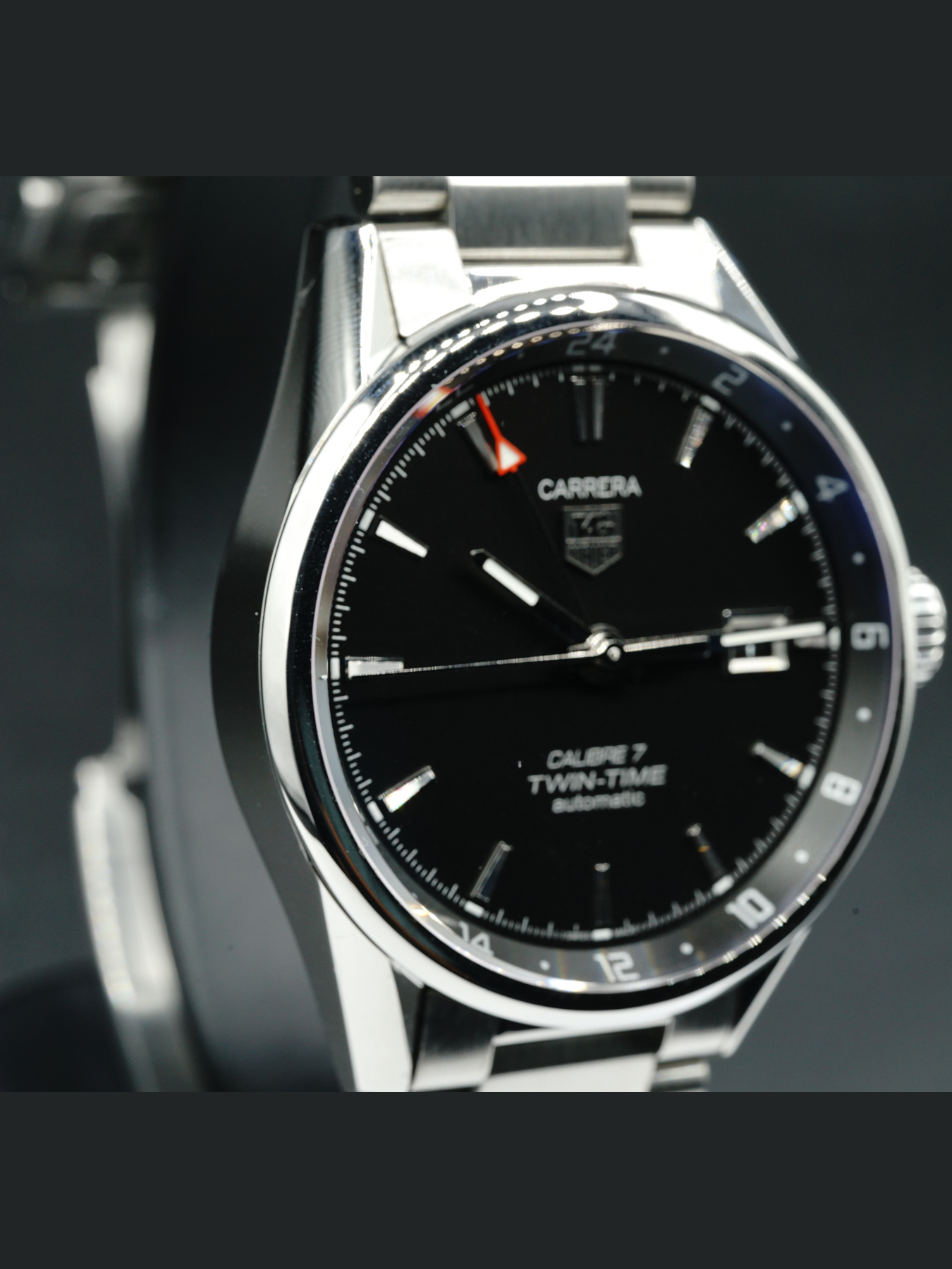 This Tag Heuer Carrera Twin Tim Anthracite Dial is in EXCELLENT condition. This watch features a stainless steel case with a stainless steel bracelet. Fixed stainless steel bezel. Anthracite dial with luminous silver-toned hands and index hour markers. This watch includes its original box and papers.