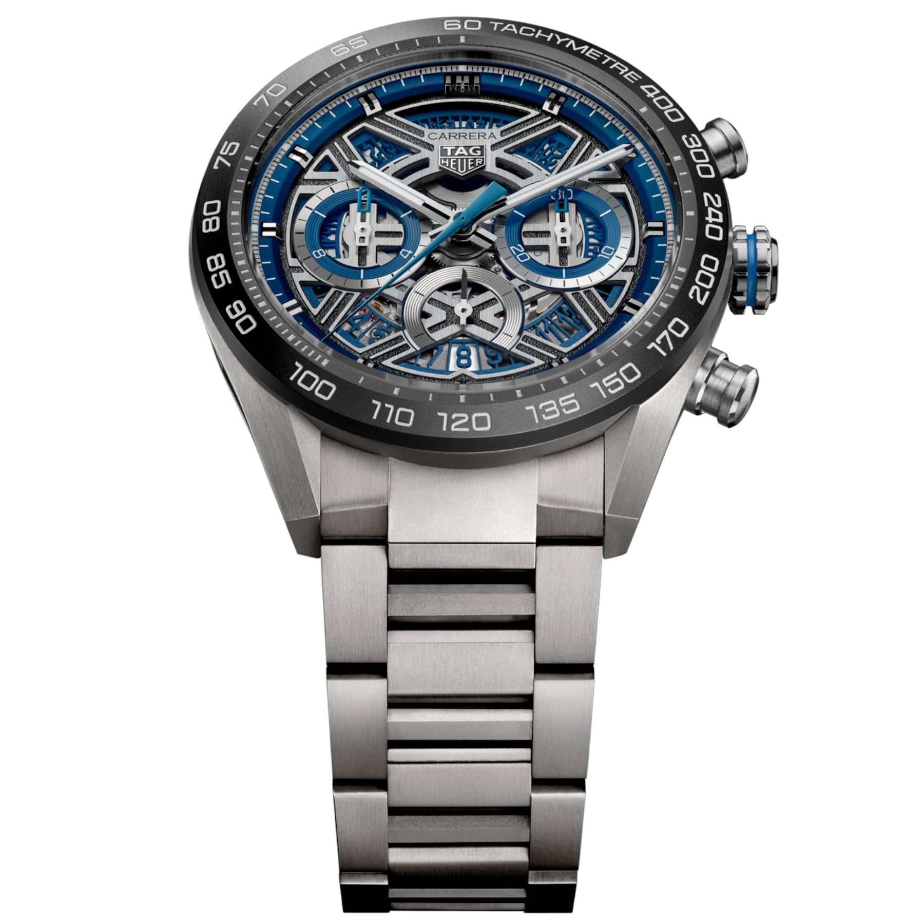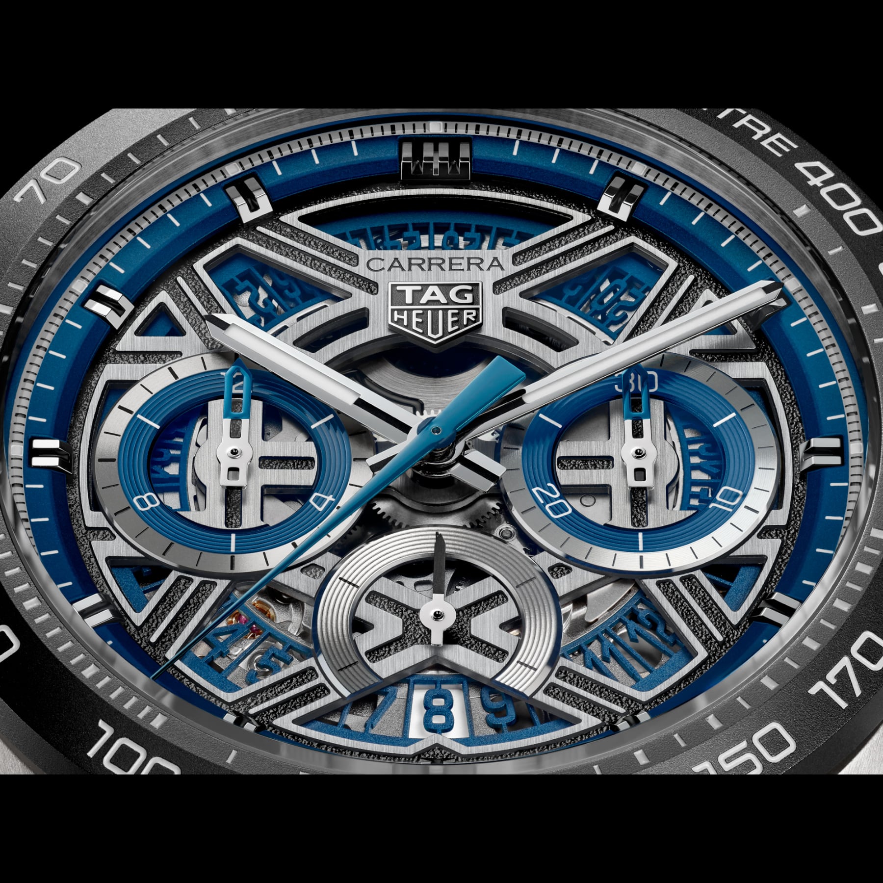 The openworked dial captures the essence of speed and innovation, framed by a bold blue flange and contrasting blue accents across the counters. Rhodium-plated hands and indexes with white Super-LumiNova® enhance clarity at speed, while the 6 o’clock date completes a design engineered for performance.
