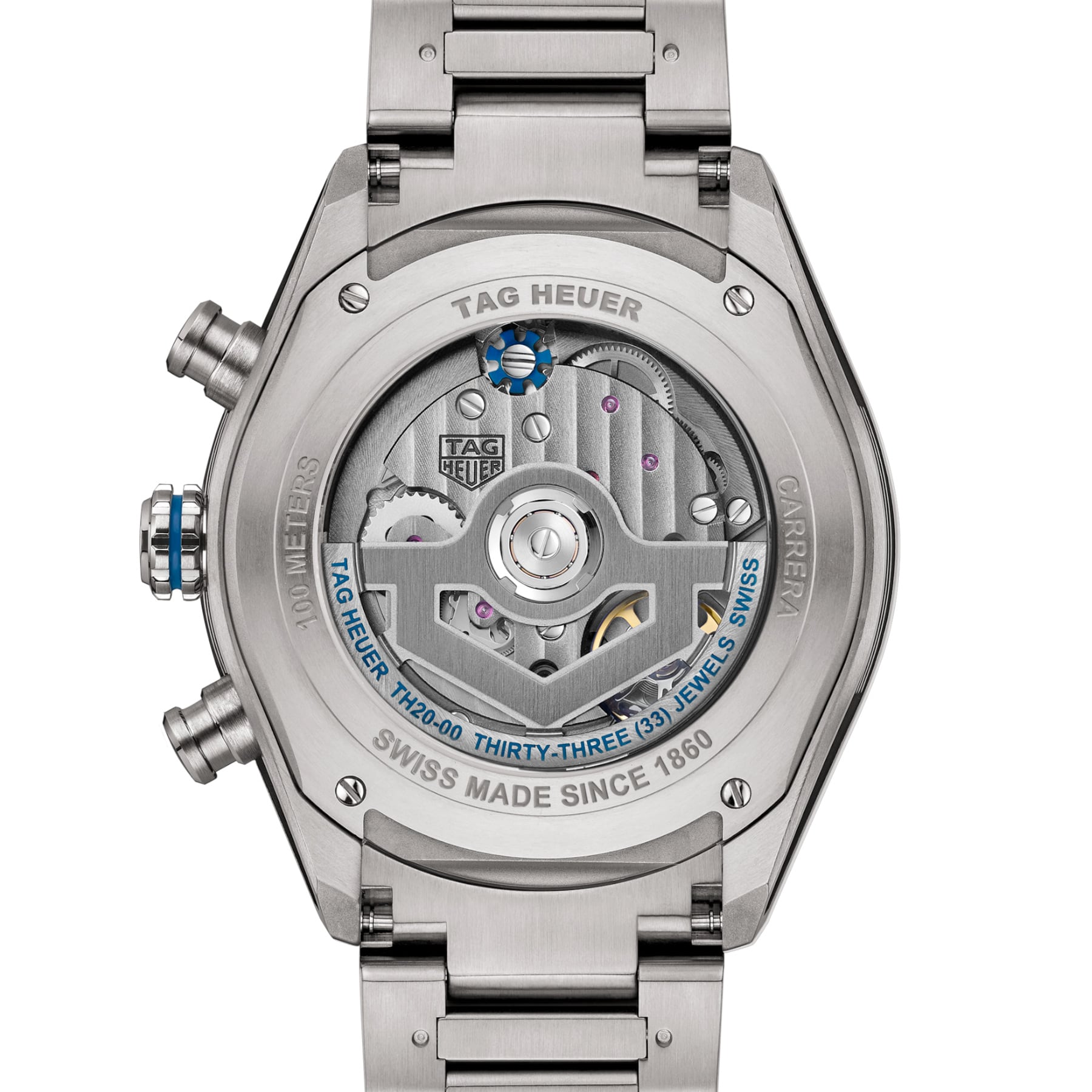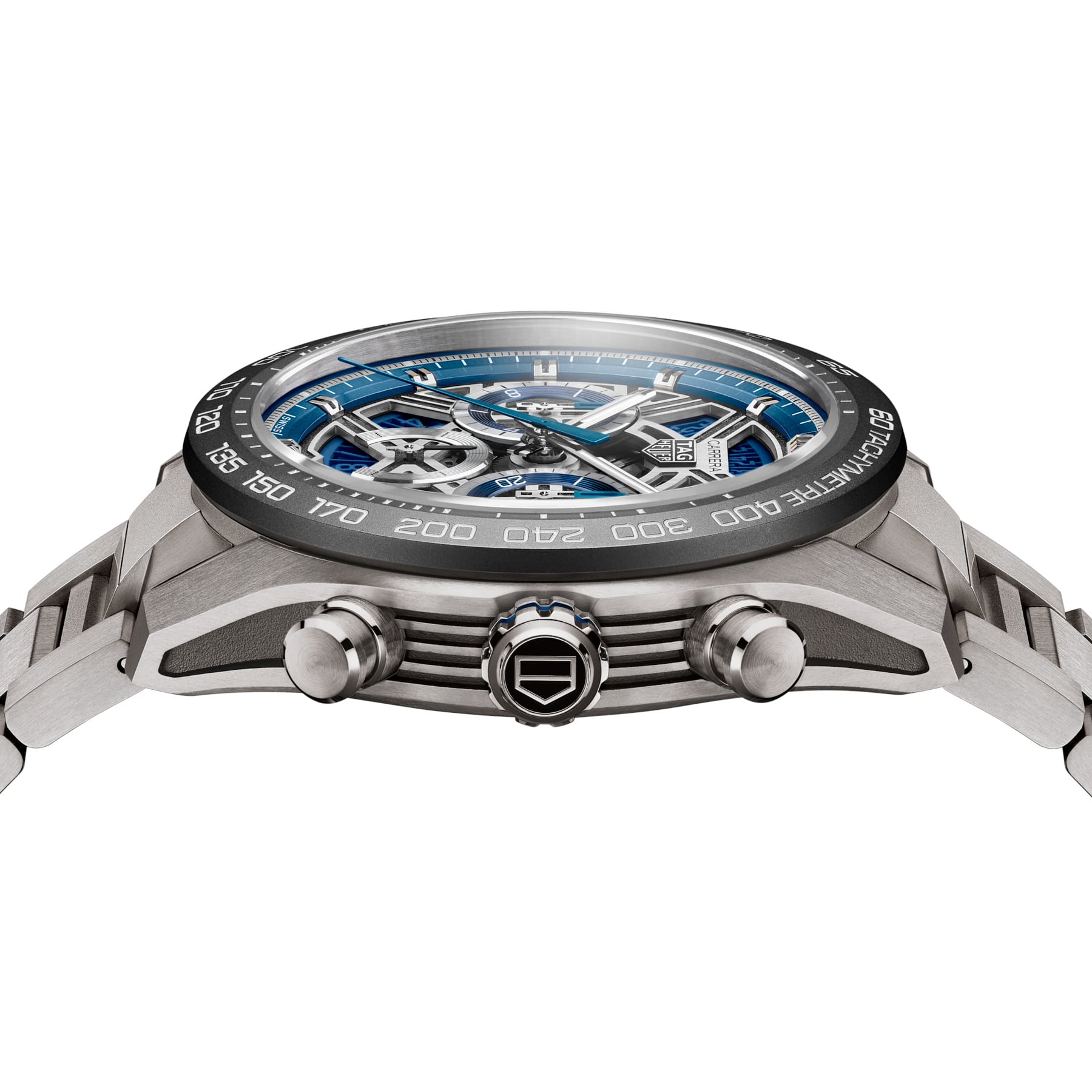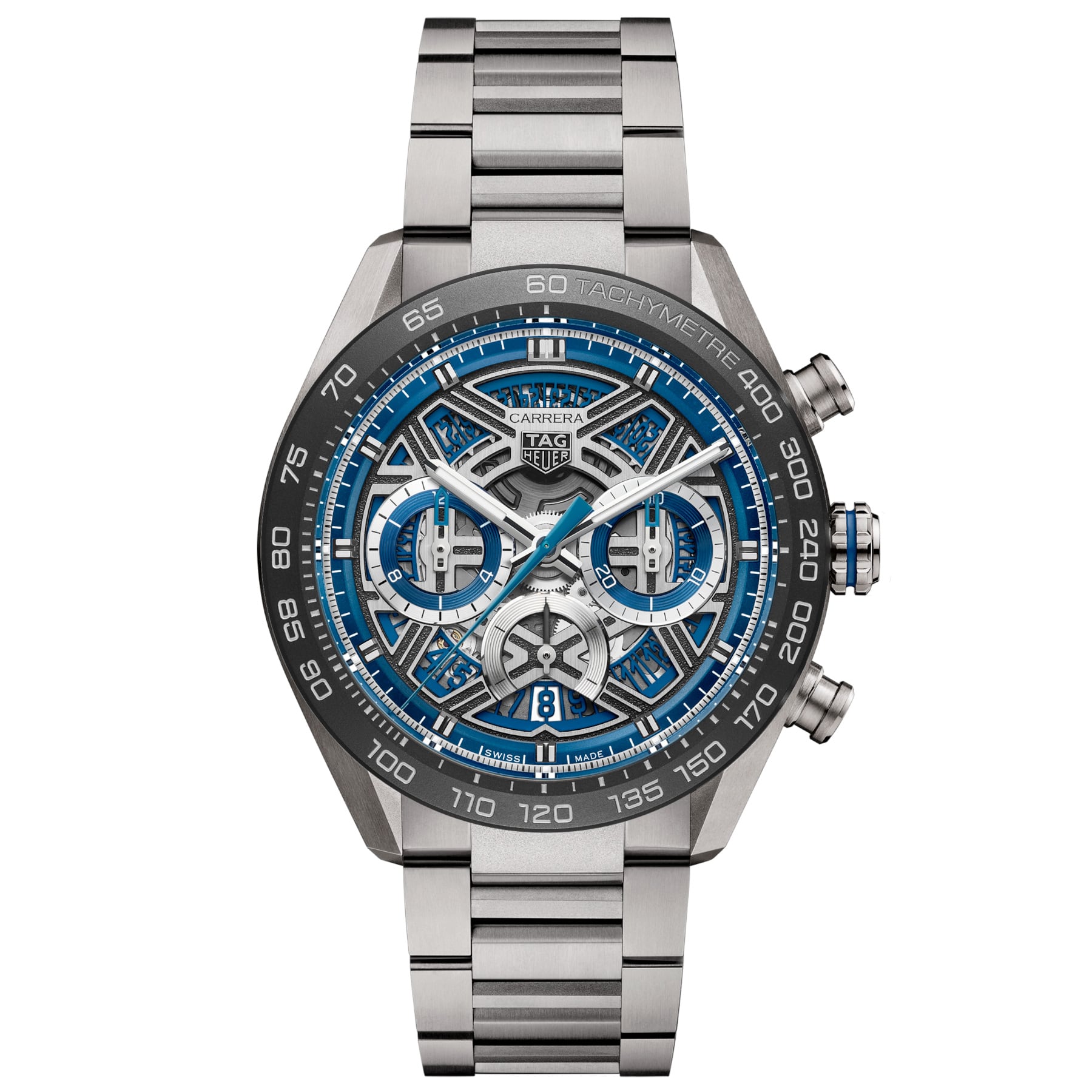 The grade 2 titanium case combines sandblasted and polished surfaces for optimal resistance with minimal weight. The black ceramic tachymeter bezel adds a striking contrast while ensuring lasting durability, and the in-house automatic Calibre TH20-00 offers 80 hours of power reserve.