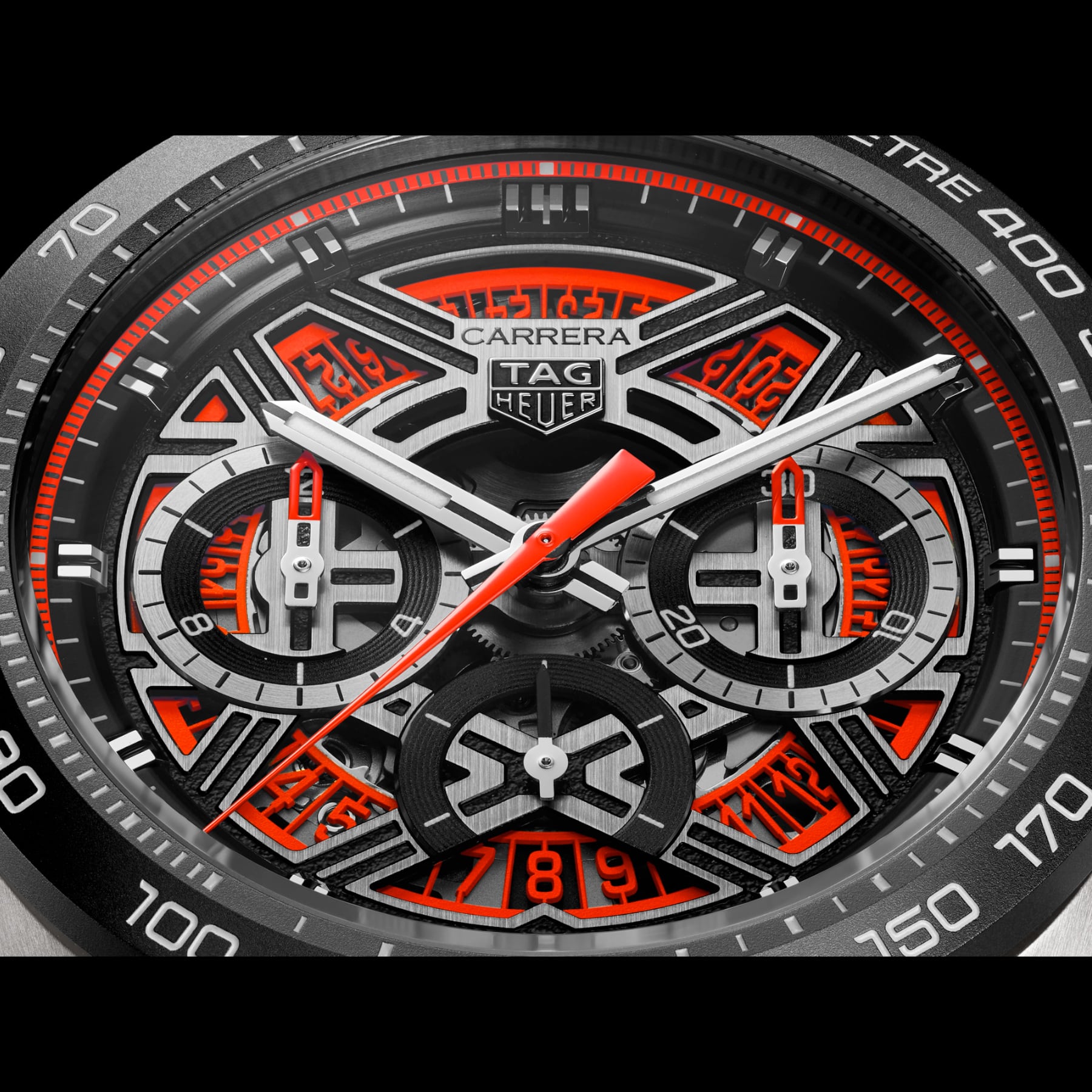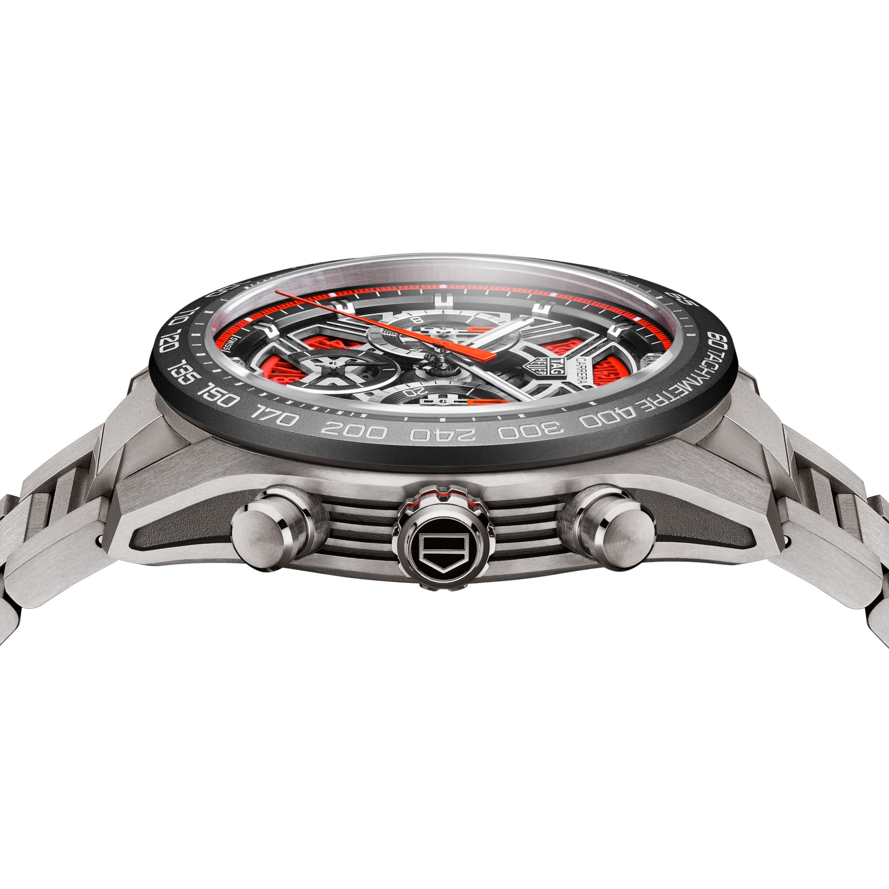 The openworked dial captures the essence of speed and innovation, energized by a vivid red flange and matching counter accents. Rhodium-plated hands and applied indexes with white Super-LumiNova® deliver instantaneous clarity, while the date window at 6 o’clock maintains readability when seconds matter most.