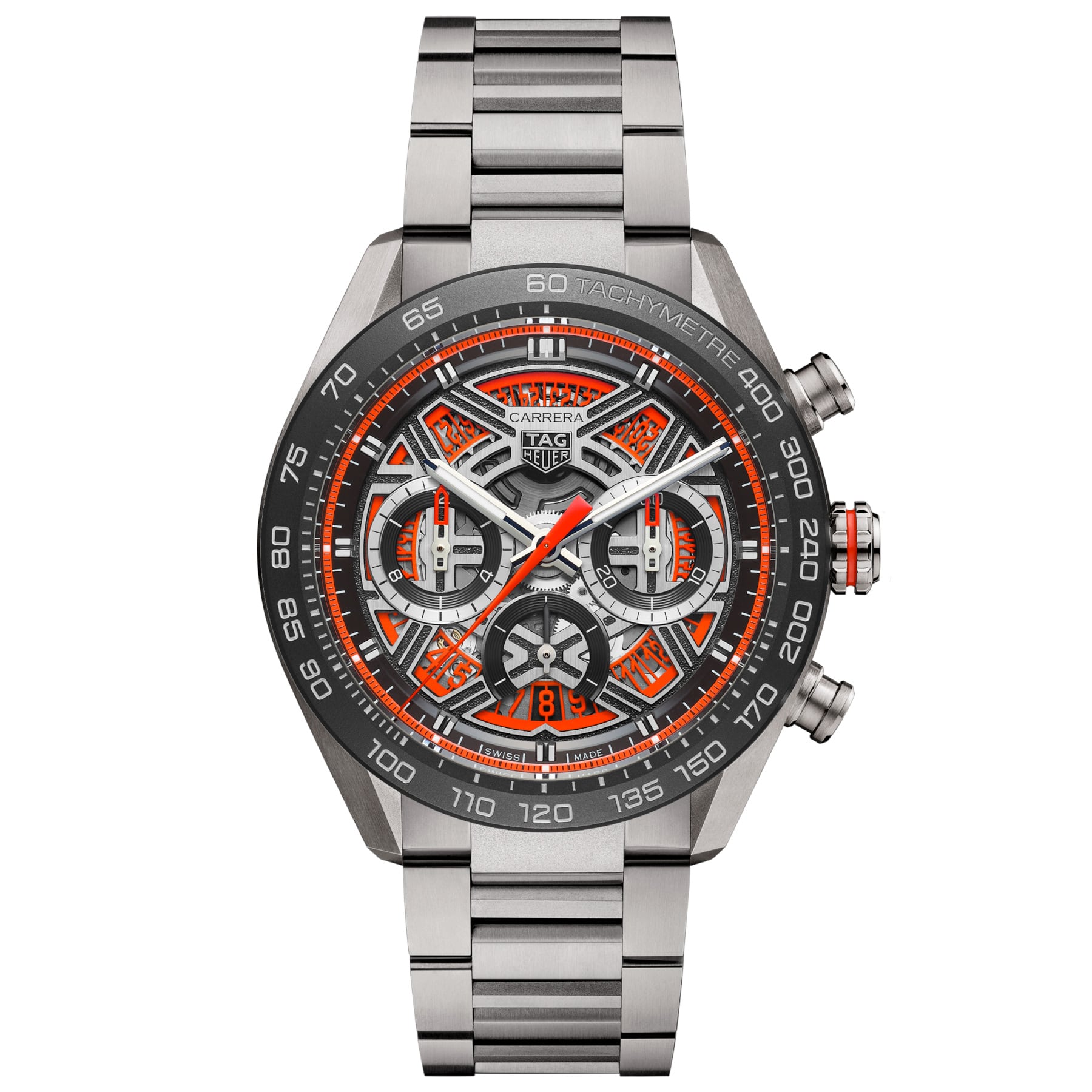 The 44mm grade 2 titanium case pairs fine-brushed surfaces with a black ceramic tachymeter bezel built for precision at speed. Inside, the in-house automatic Calibre TH20-00 delivers long-lasting autonomy with an 80-hour power reserve.