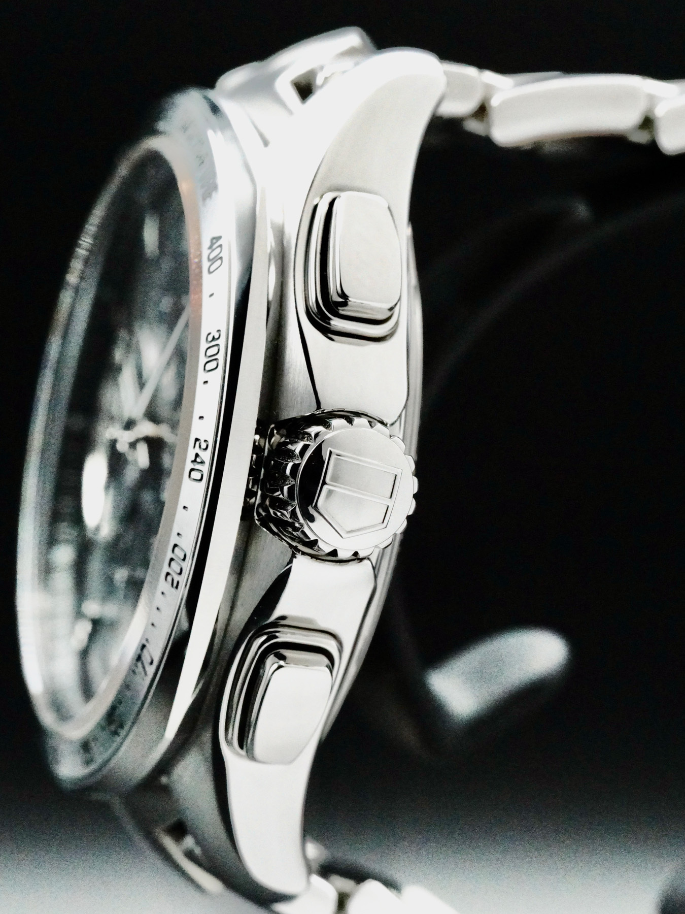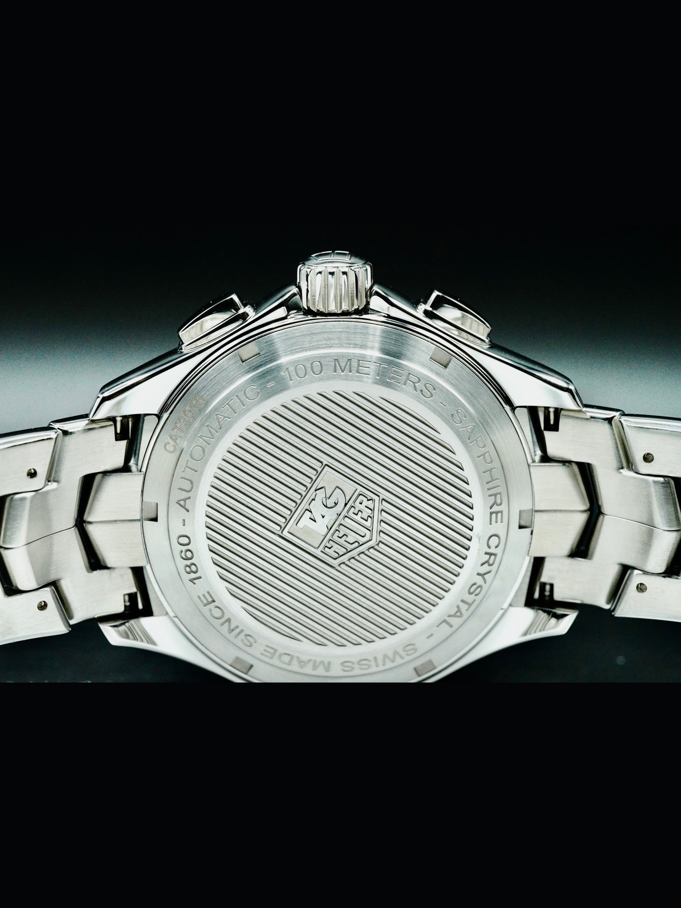This watch features a 43 mm Steel Fine-Brushed/Polished case on bracelet. This watch also sports a black dial. Powered by an automatic chronograph movement. Water resistance up to 100 meters.