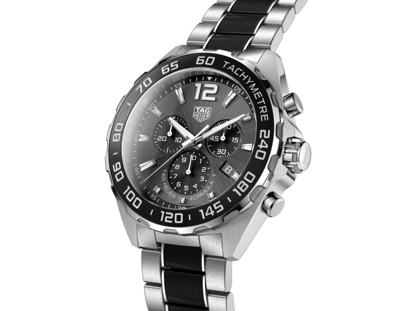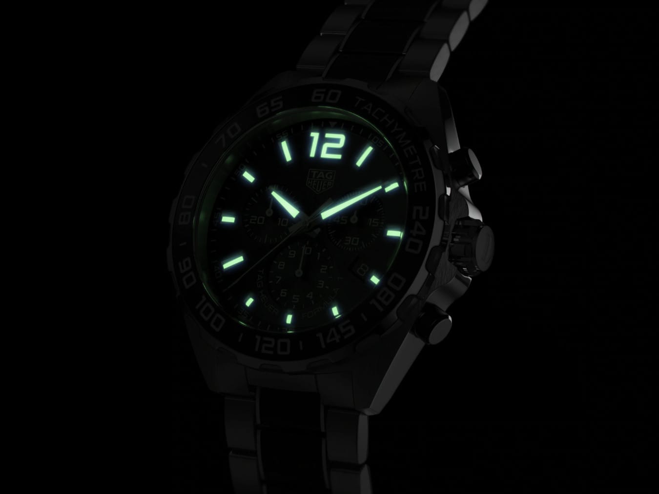 Silver grey dial with luminescent markers, fixed ceramic bezel with tachymeter scale, 200-meter water resistance: a precision-driven chronograph inspired by TAG Heuer’s ongoing commitment to Formula One racing.