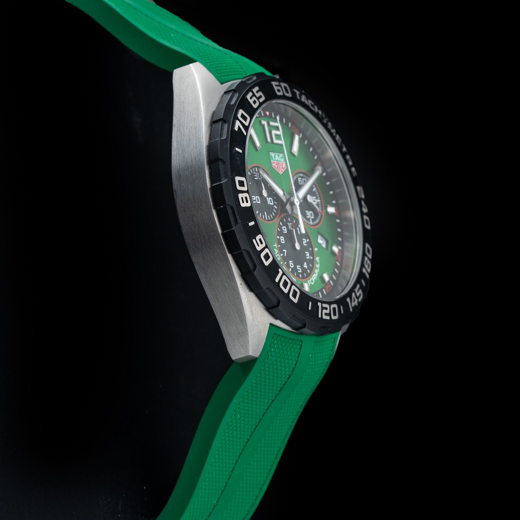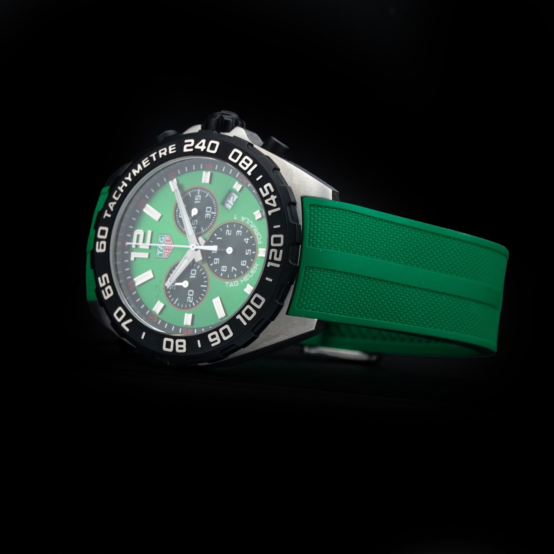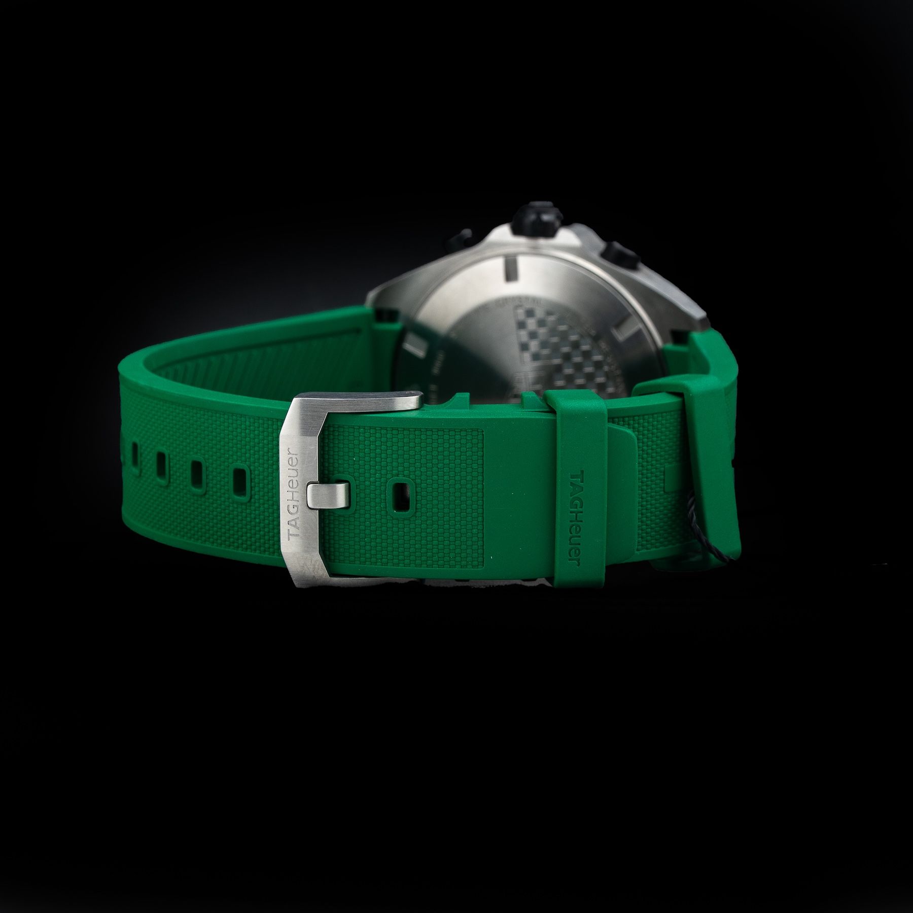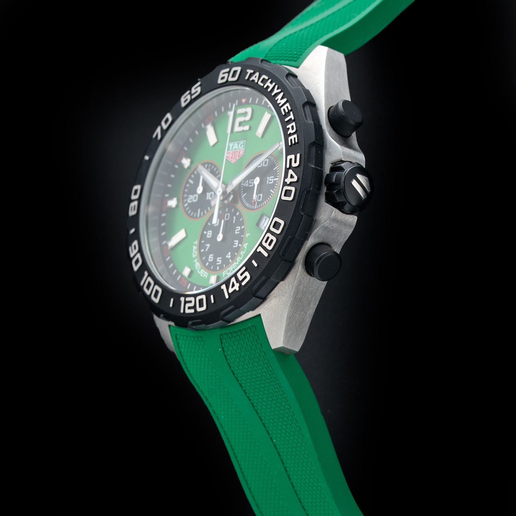 This watch features a 43mm steel case on rubber strap. This watch also sports a green dial. Powered by a quartz movement. Water resistance up to 200 meters.