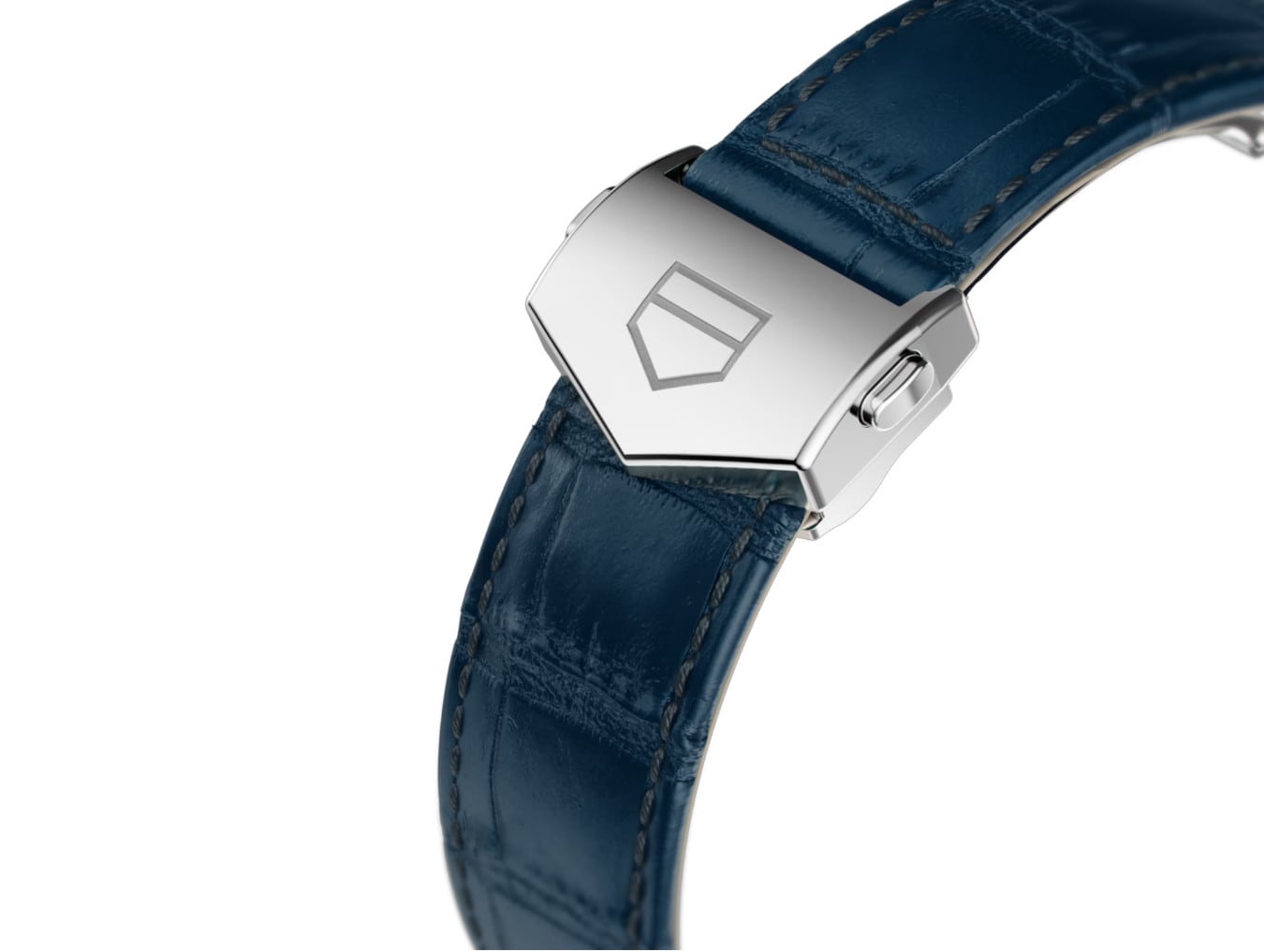 The two-subdial chronograph with shimmering blue dial is an unmistakable and timeless icon of cool, stylish yet rebellious, and supercharged for performance. The racing strap in blue alligator is as sexy today as it was on Steve McQueen’s wrist in the 1970s.