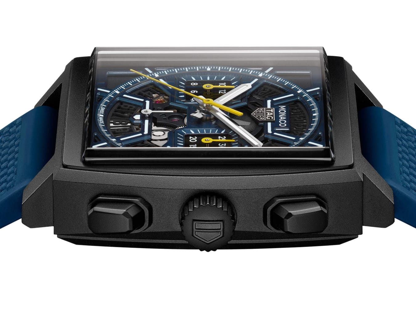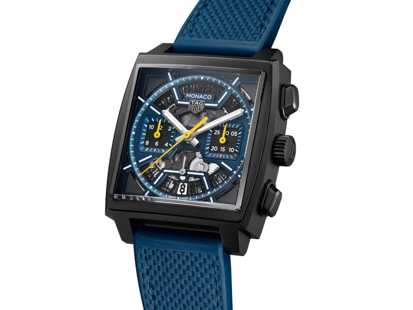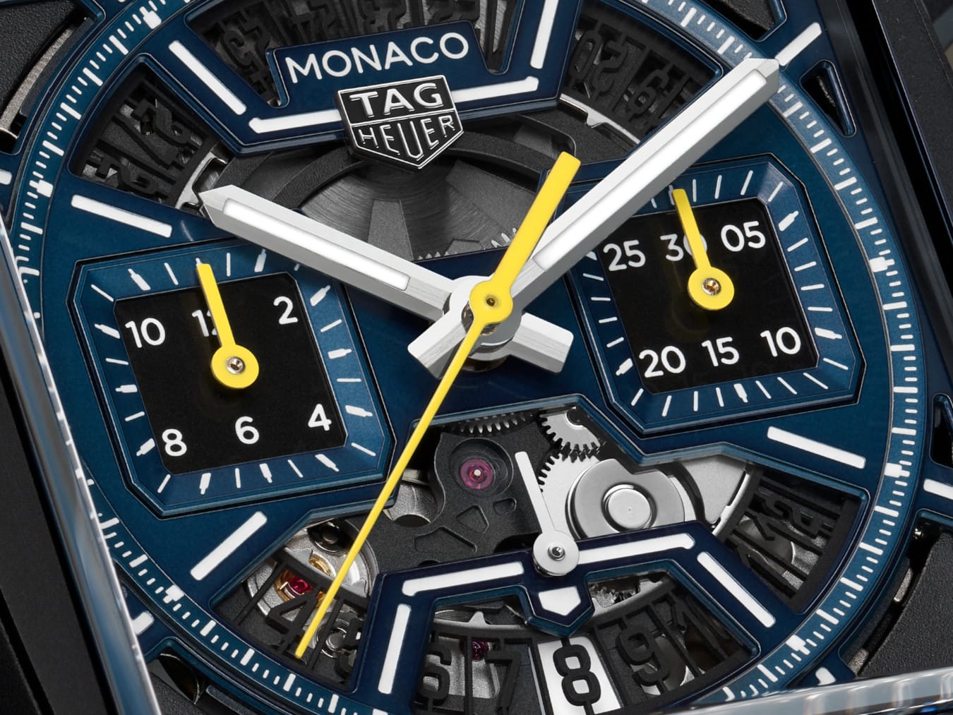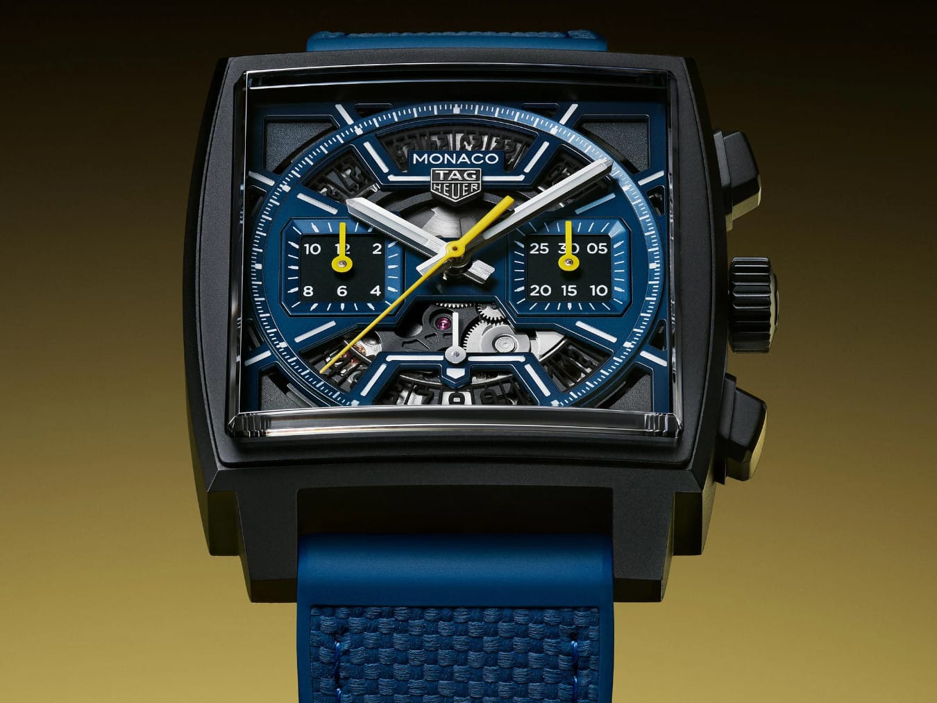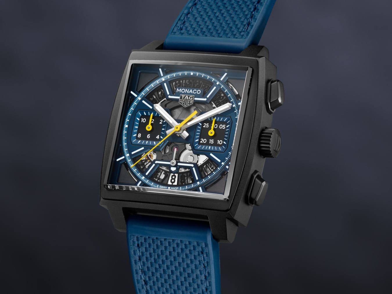Embrace the thrill of the race with this dark blue TAG Heuer Monaco. A modern reinterpretation of an iconic design, this timepiece combines a bold blue and yellow palette with a contemporary skeleton dial—A fiercely charismatic icon.