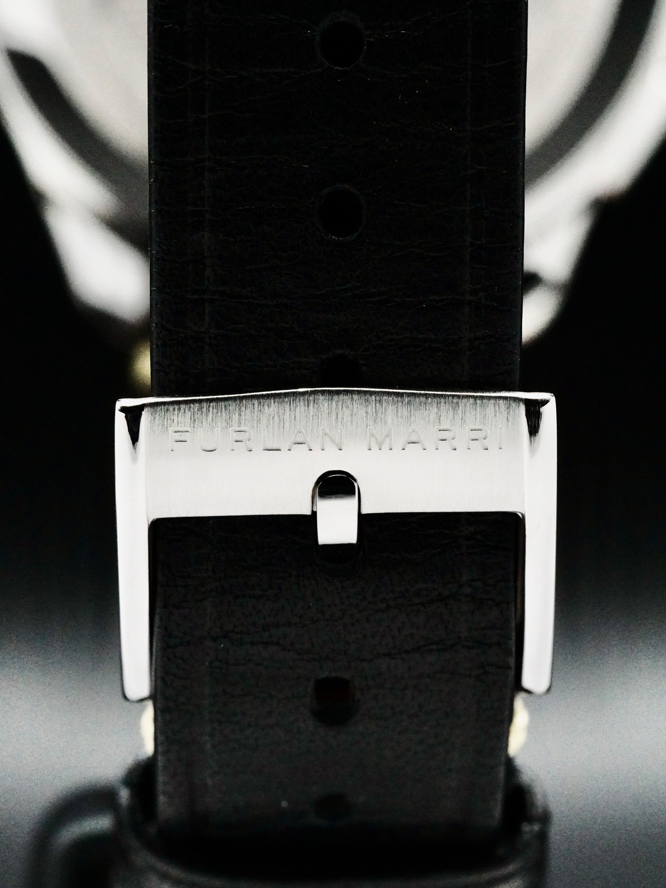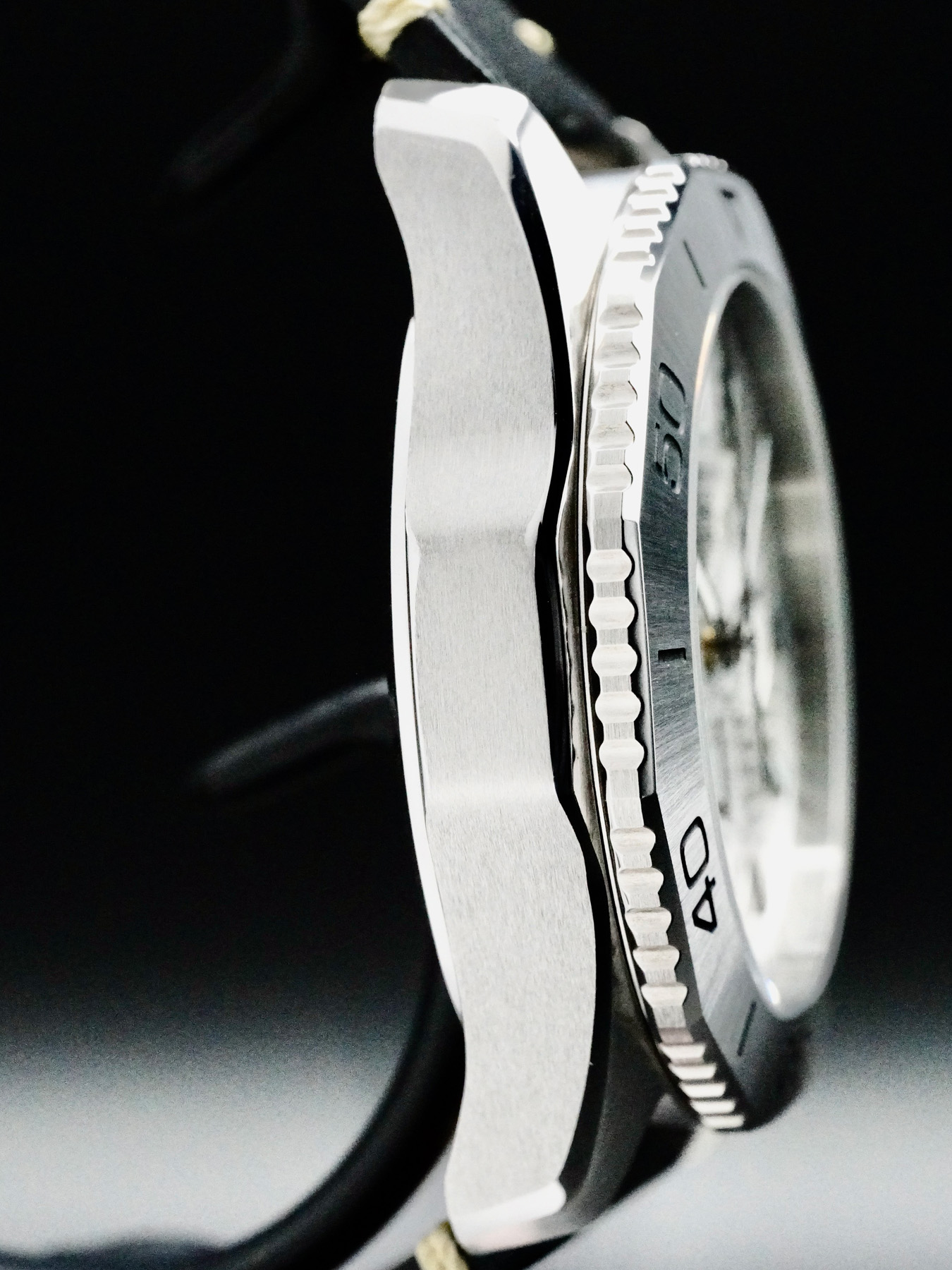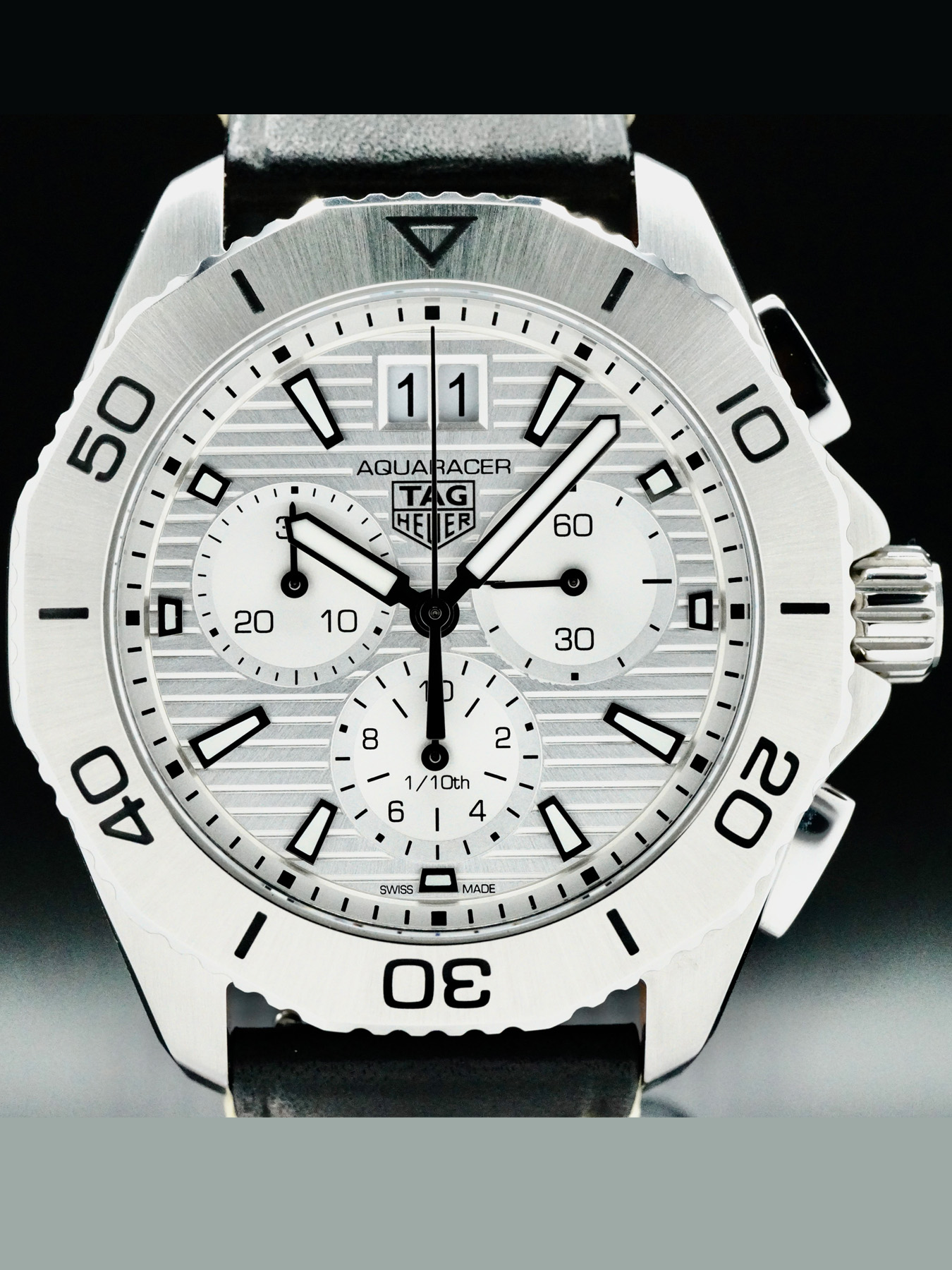 This watch features a 40mm stainless steel case with a solid case back on a black leather aftermarket strap. This watch also sports a silver dial with luminous hands and index dial markers covered by sapphire crystal.