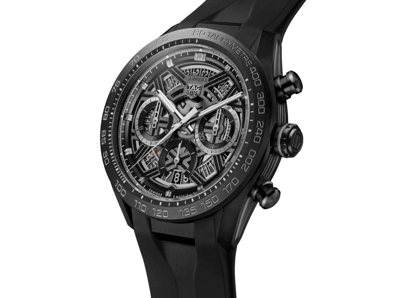 The skeletonized dial, with black finishing and a grained black details, matches the black flange and contrasts with the bright Super-LumiNova® applied hands.