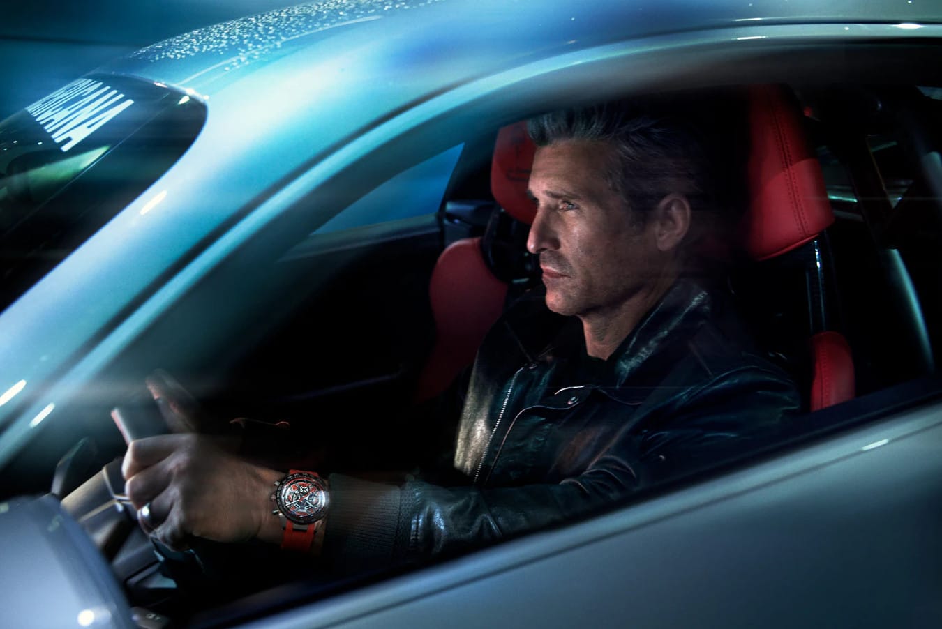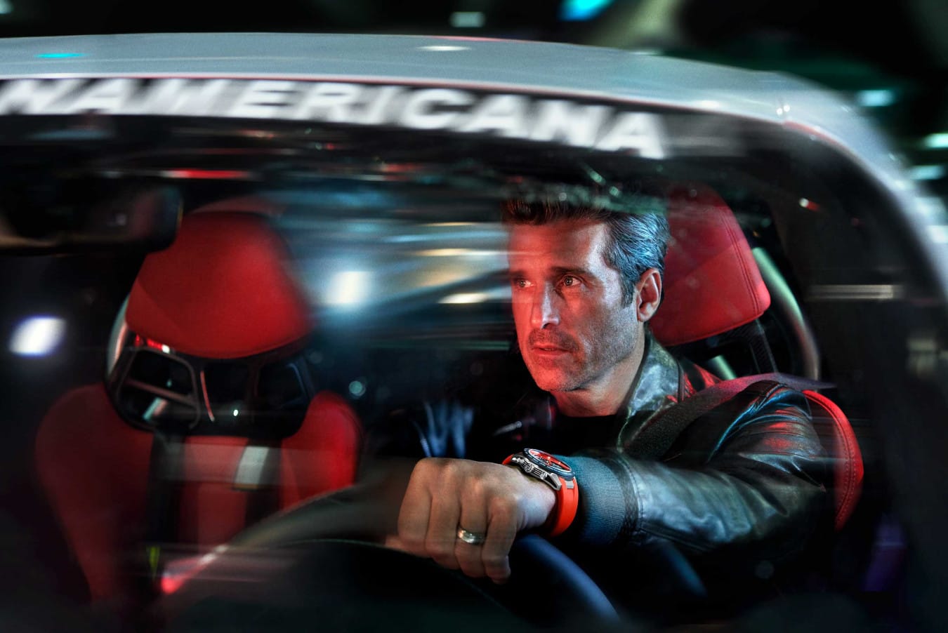 Encased in Titanium grade 2 with a black PVD grained hollowed side, this 44mm chronograph features a black sandblasted ceramic bezel, resilient on and off the track.