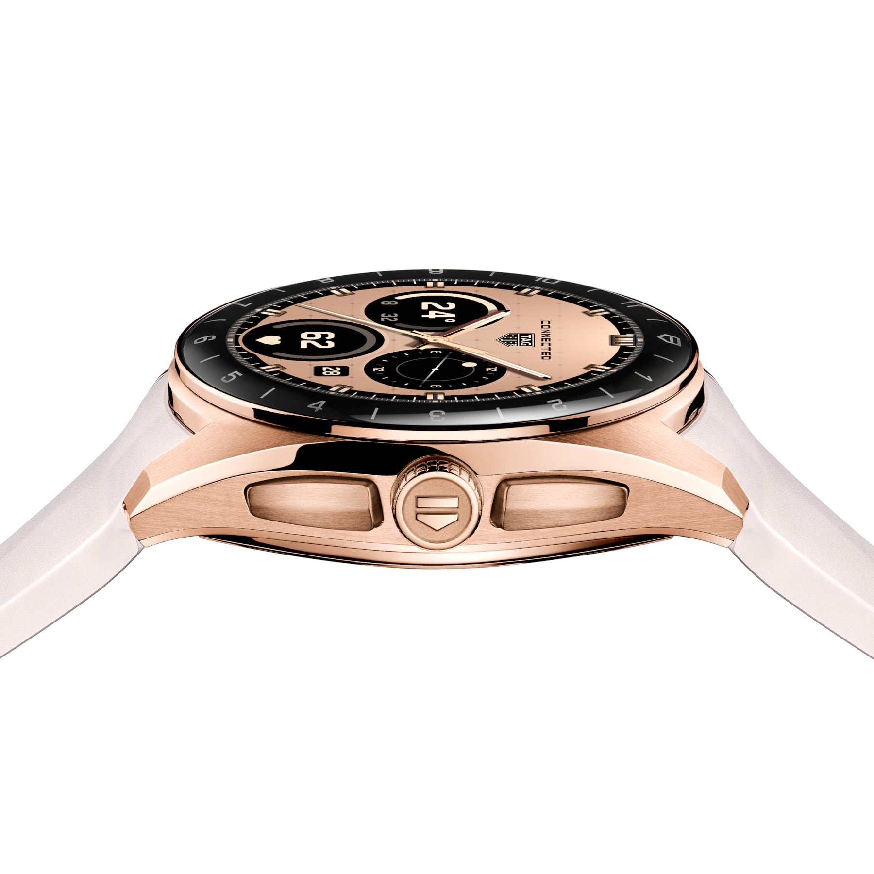 Elegance meets innovation in the TAG Heuer Connected Calibre E5. This 40mm model, features a refined steel case coated with rose gold colored PVD and the Maison's first in-house connected experience, complete with advanced fitness tracking. Experience functional design and timeless style, perfectly balanced.