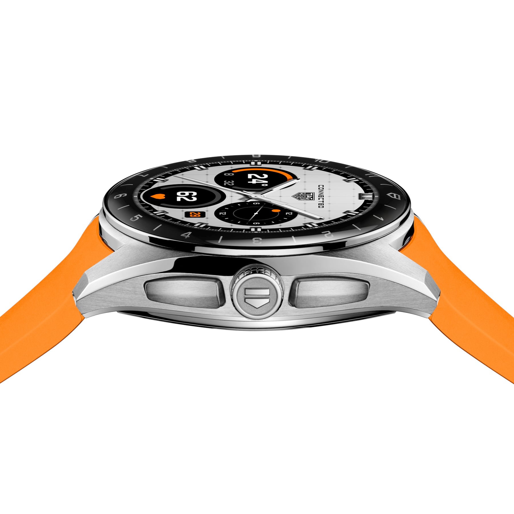 This 40mm connected watch features a finely brushed and polished steel case, a domed sapphire crystal with subtle grey and silver markings, and integrated steel pushers. The sleek design is further enhanced by the vibrant orange rubber strap.
