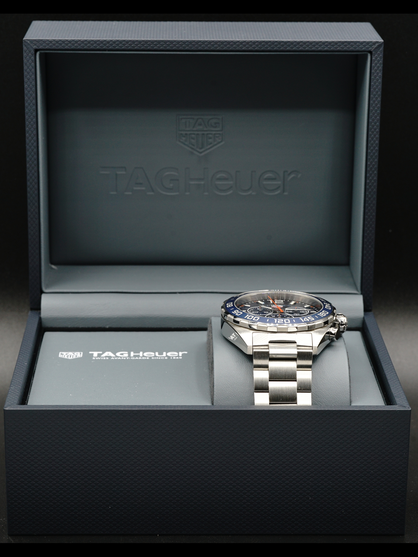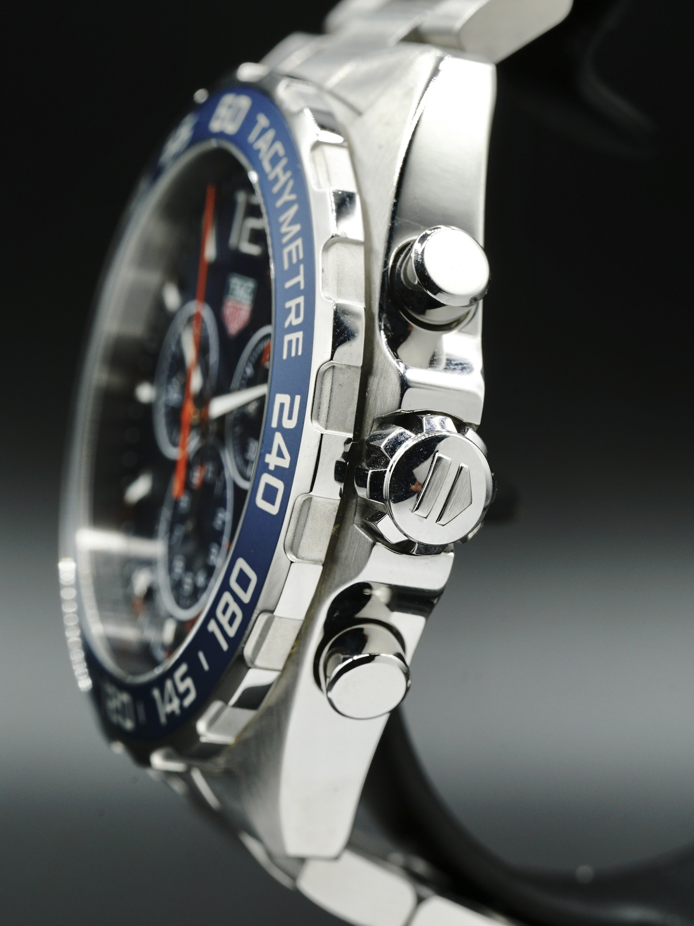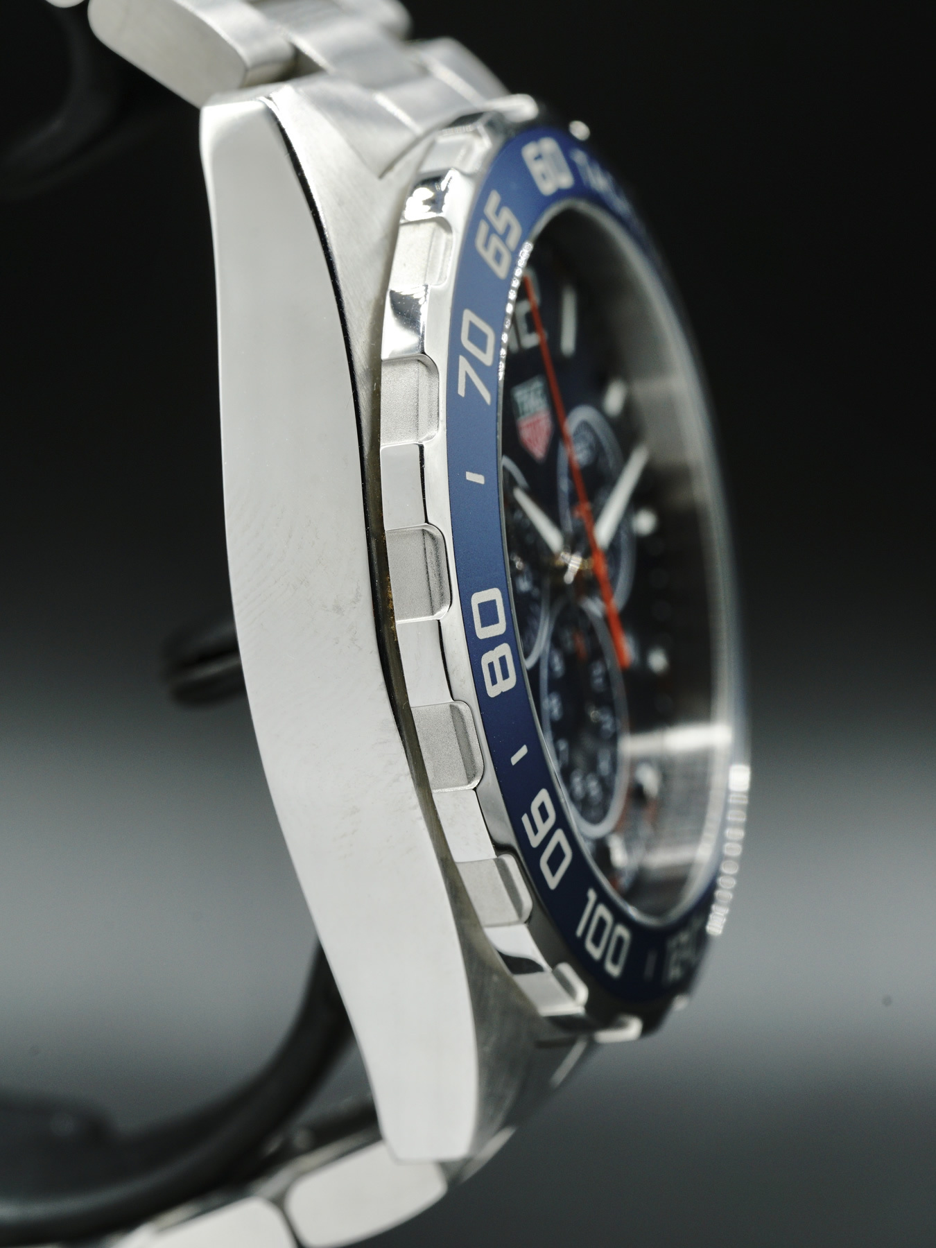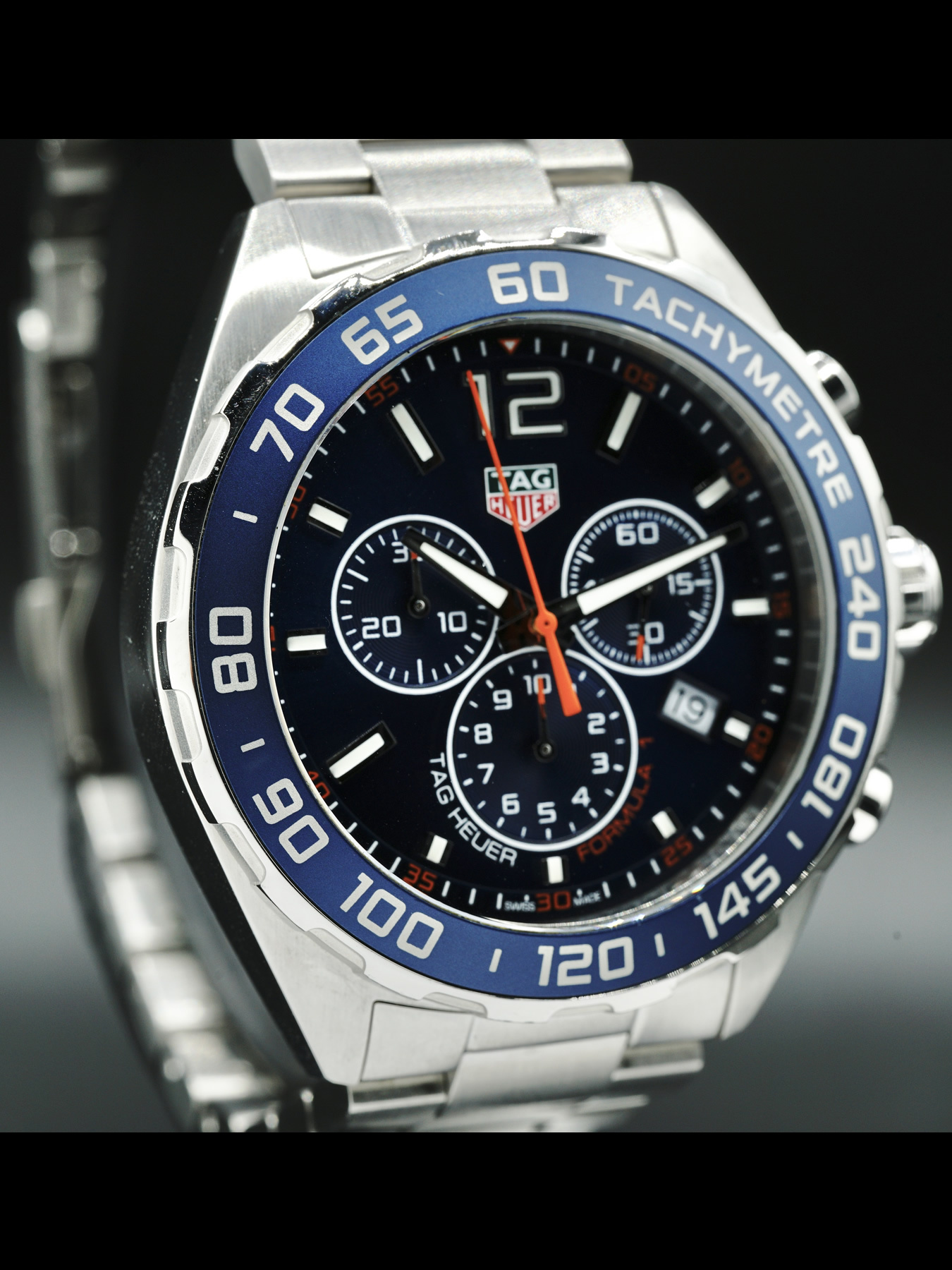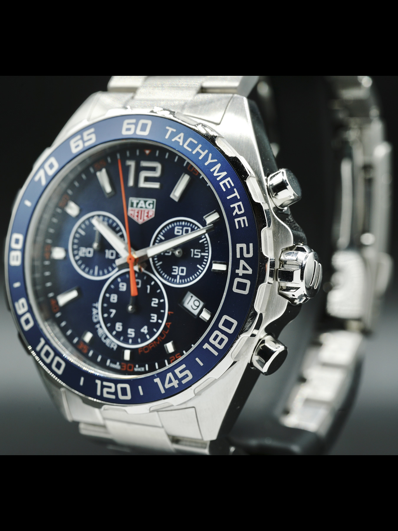 This Tag Heuer Formula 1 Chronograph features a 43mm stainless steel case and silver-tone bezel. This watch sports a blue dial covered by scratch resistant sapphire crystal.