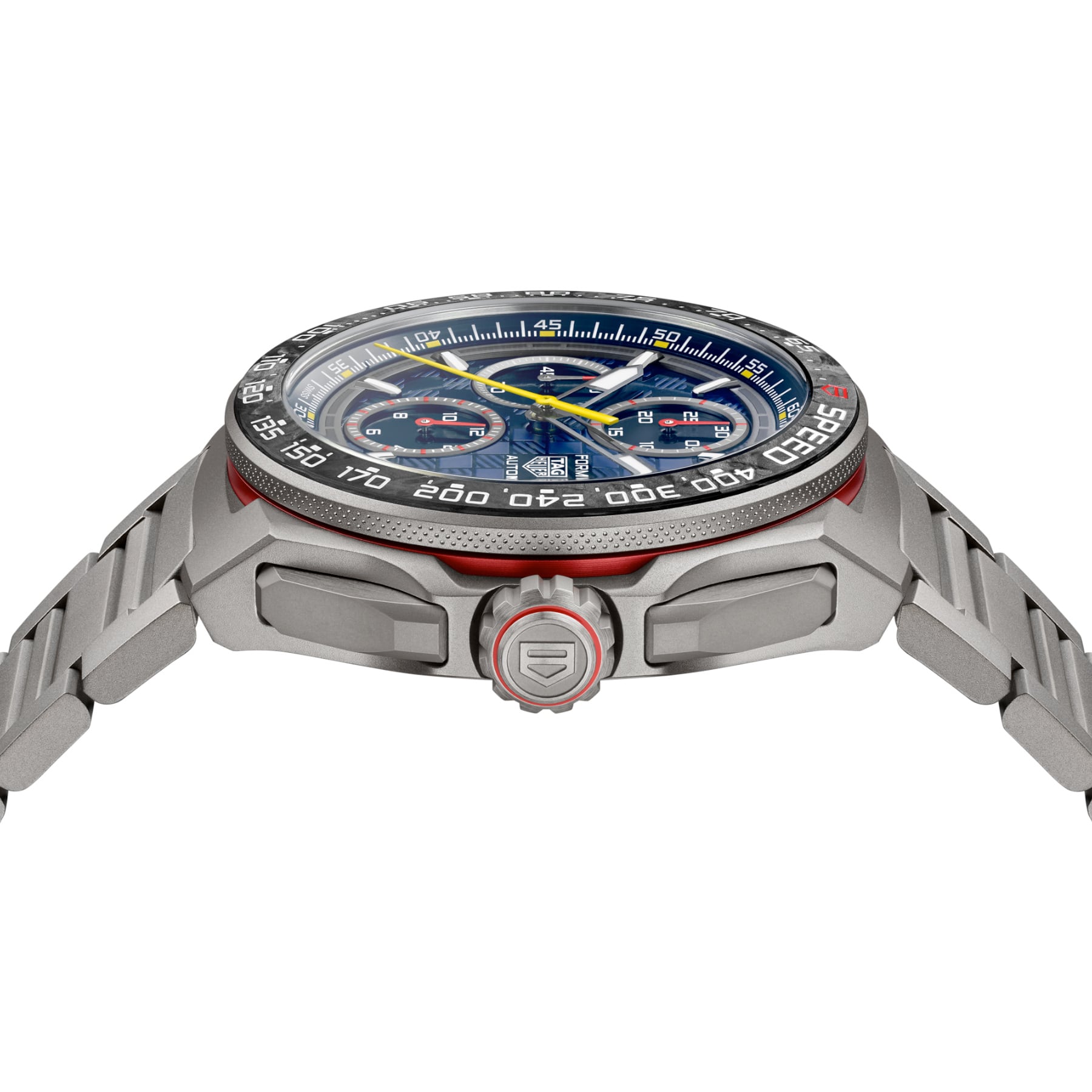 Crafted in ultra-lightweight titanium, this TAG Heuer Formula 1 Chronograph celebrates the adrenaline-fueled partnership between TAG Heuer and Oracle Red Bull Racing. Combining precision, bold design, and endurance-ready performance, this co-branded 44mm timepiece is built for those who thrive on speed.