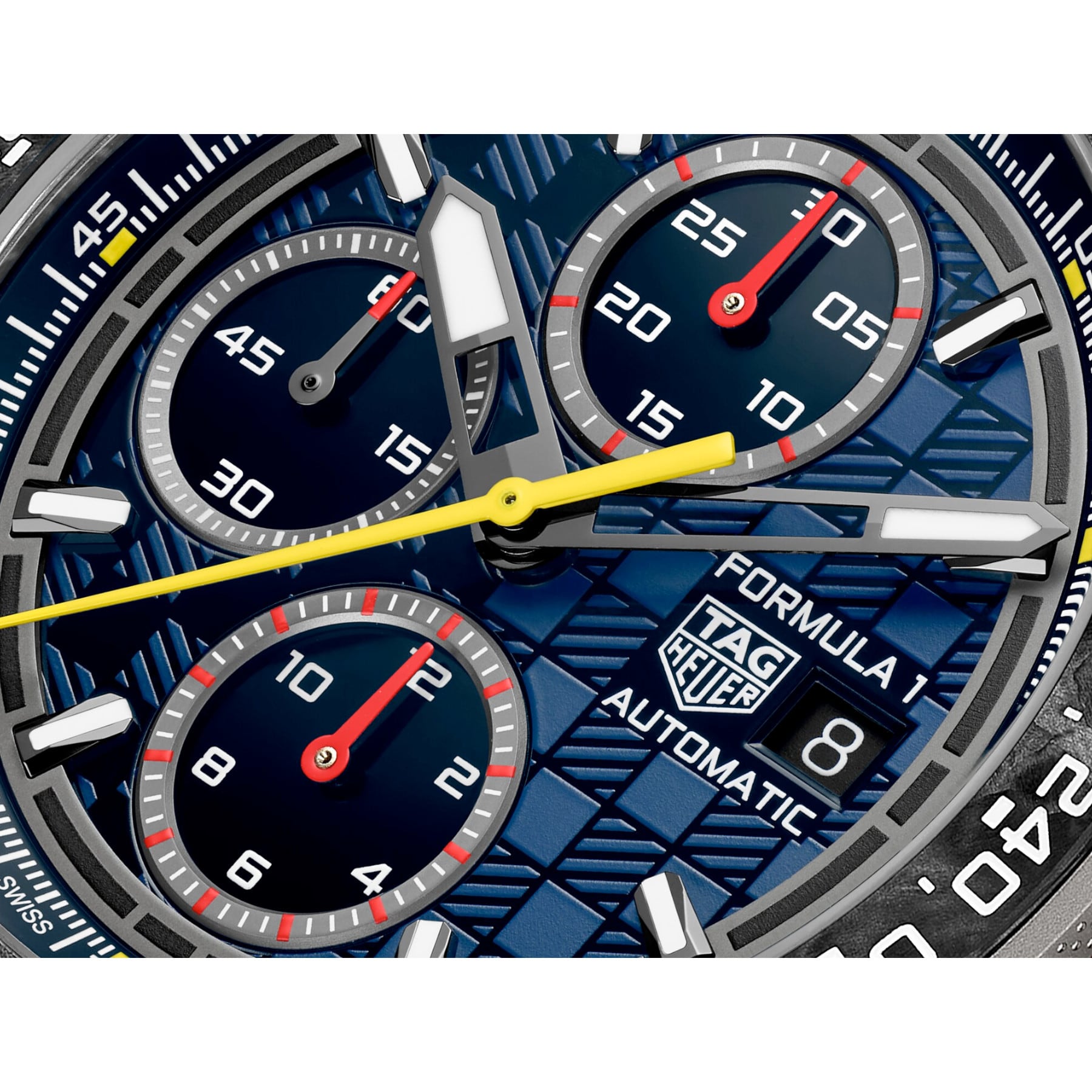 The opalin blue dial features a subtle checkered-flag motif—playing on tone variations to reflect the racing DNA of Oracle Red Bull Racing. Three subdials with red and white highlights ensure legibility, while rhodium-plated hands and Super-LumiNova®-applied indexes keep legibility at the forefront.