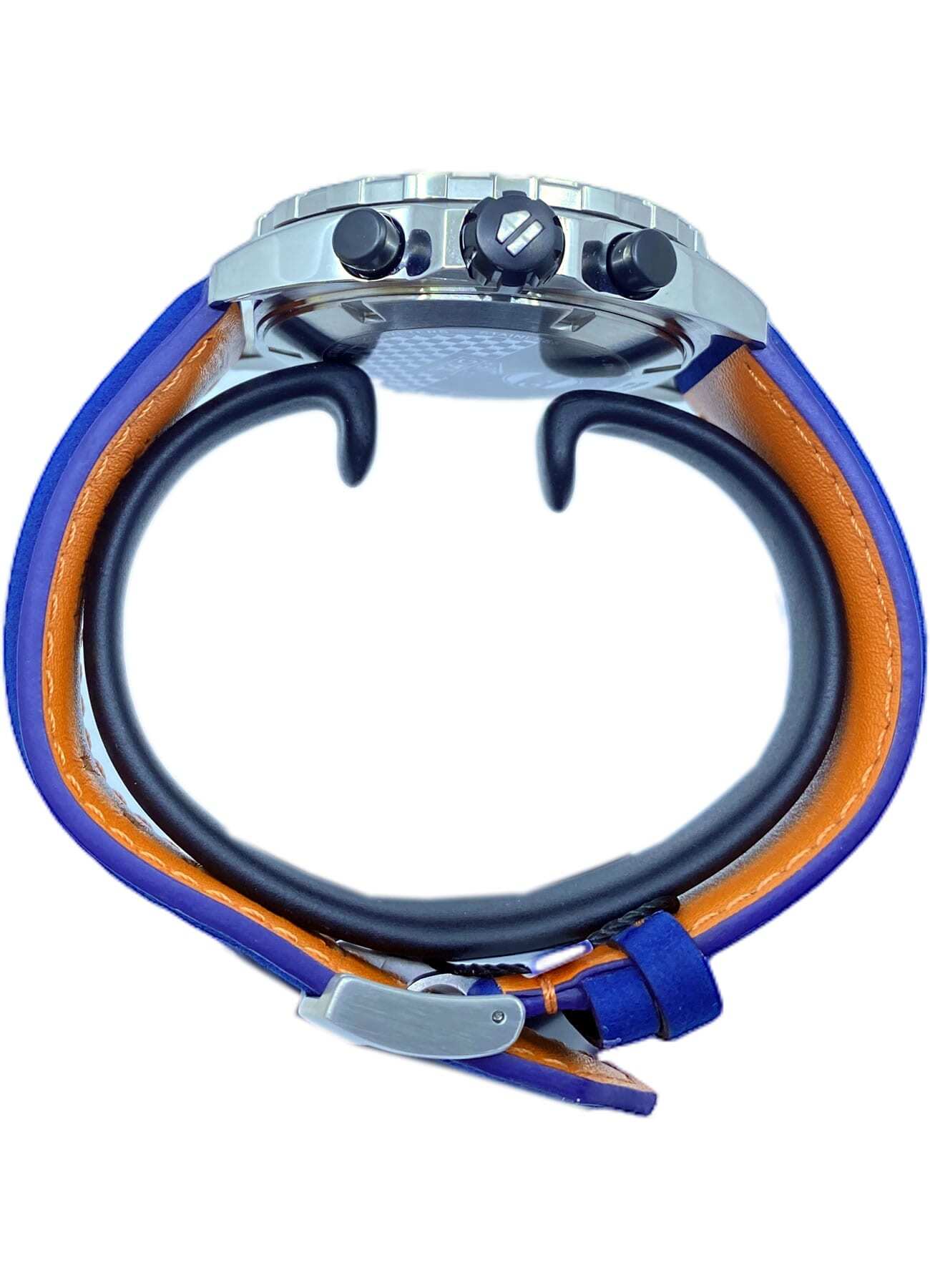 - This timepiece features a 43mm steel case paired with a high quality leather strap. It showcases a distinctive multicolor dial and is powered by a precise quartz winding movement. The watch is designed with a water resistance of up to 200m.