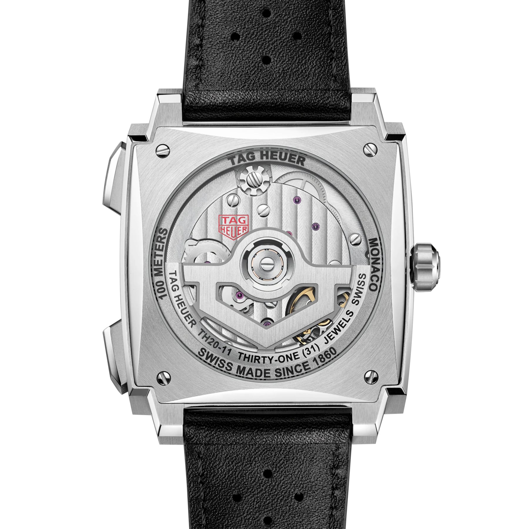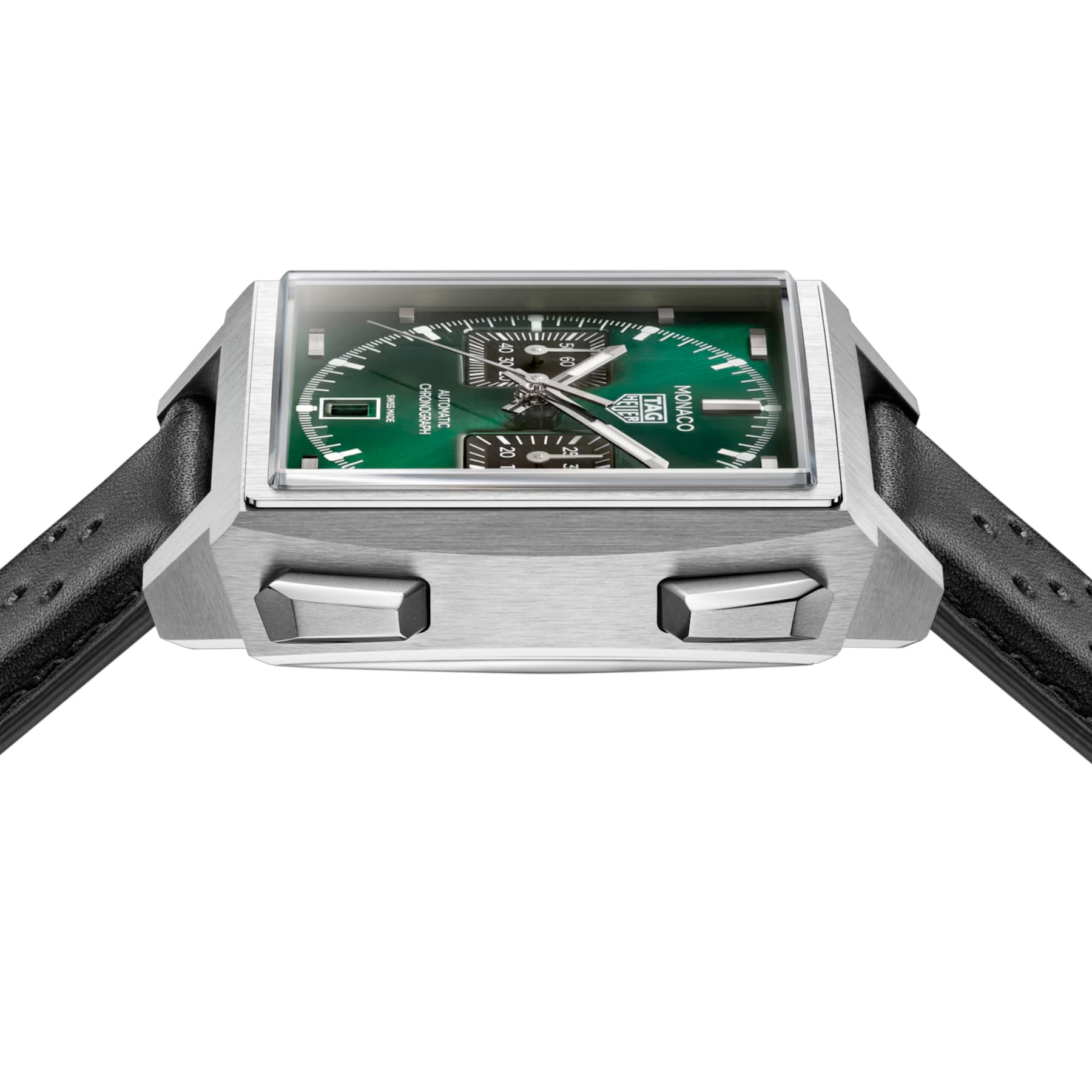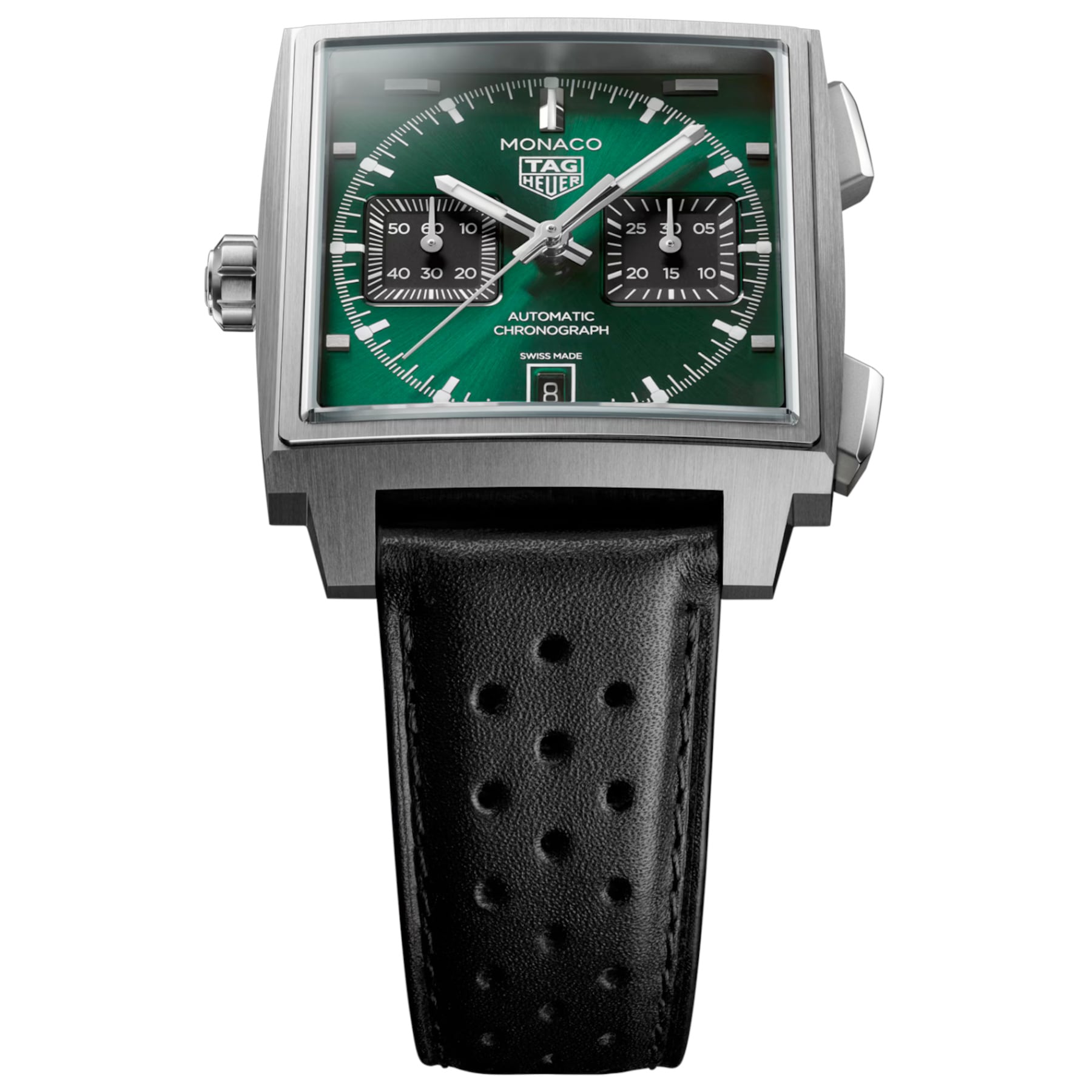 This 39mm TAG Heuer Monaco Chronograph in grade 5 titanium pairs a green sunray-brushed dial with the in-house Calibre TH20-11 offering an 80-hour power reserve. Featuring black opaline counters, luminous rhodium-plated hands, and a black calfskin leather strap, it merges ergonomic design and modern precision behind a sapphire caseback that reveals the watch’s mechanical heart.