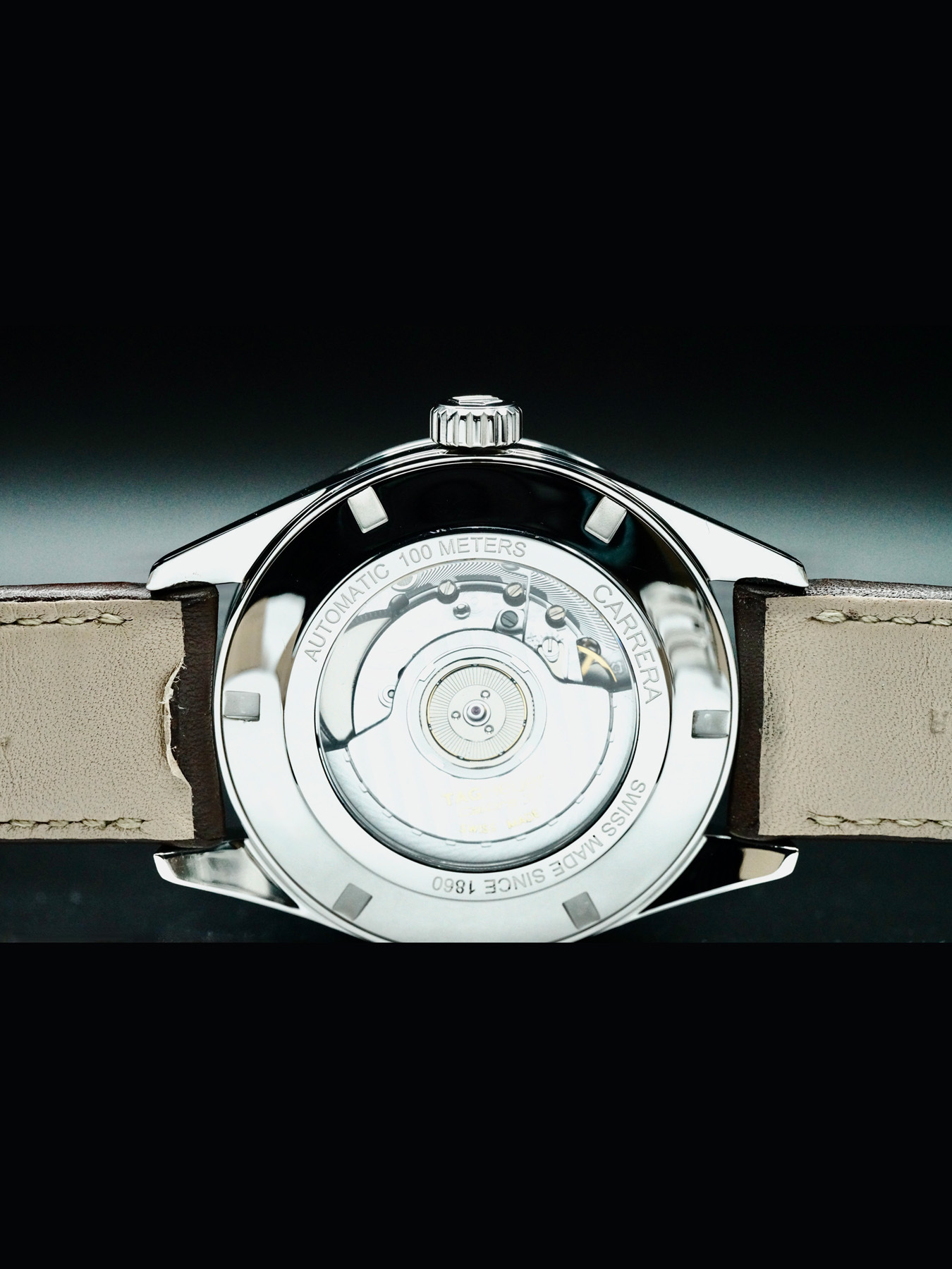This watch features a 41mm steel case on leather strap. This watch also sports a silver dial. Powered by a mechanical automatic movement. Water resistance up to 100 meters.
