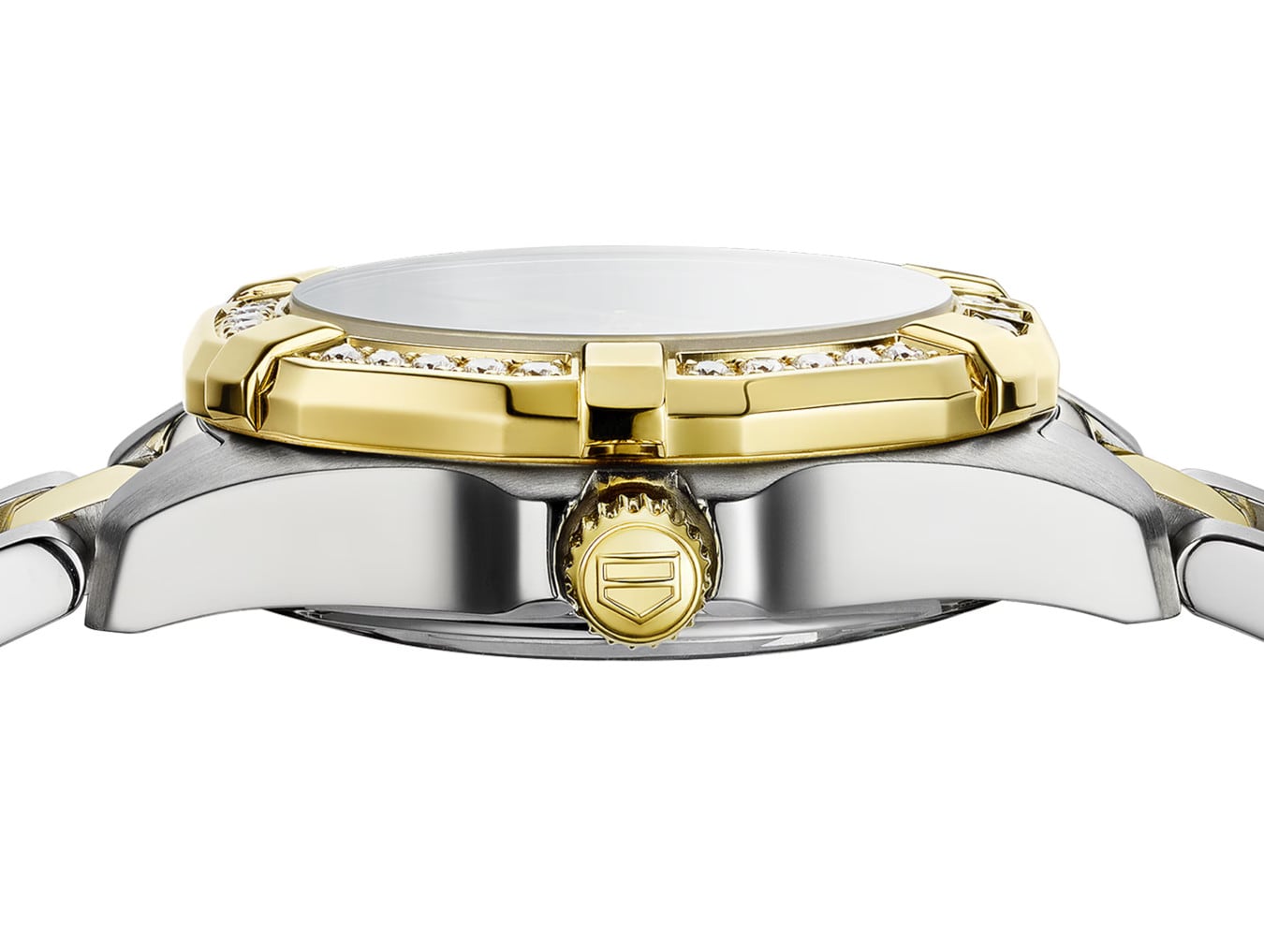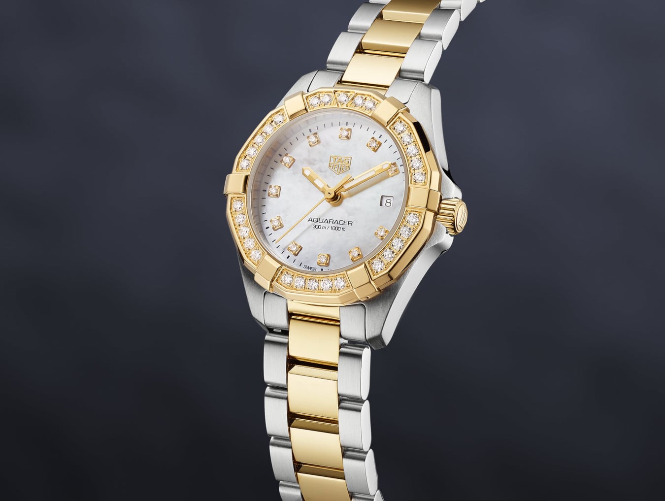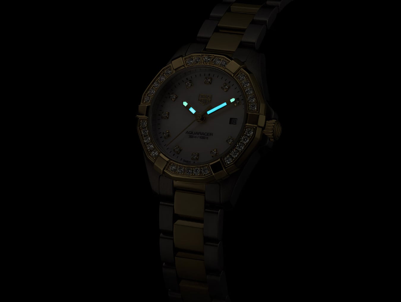 Petite in size (27mm) and plated with gold (2N) and diamonds (0.4358 CT), yet also richly endowed with sports pedigree. Water resistance to 300 meters, diving extendible bracelet and luminescent hands for enhanced readability.
