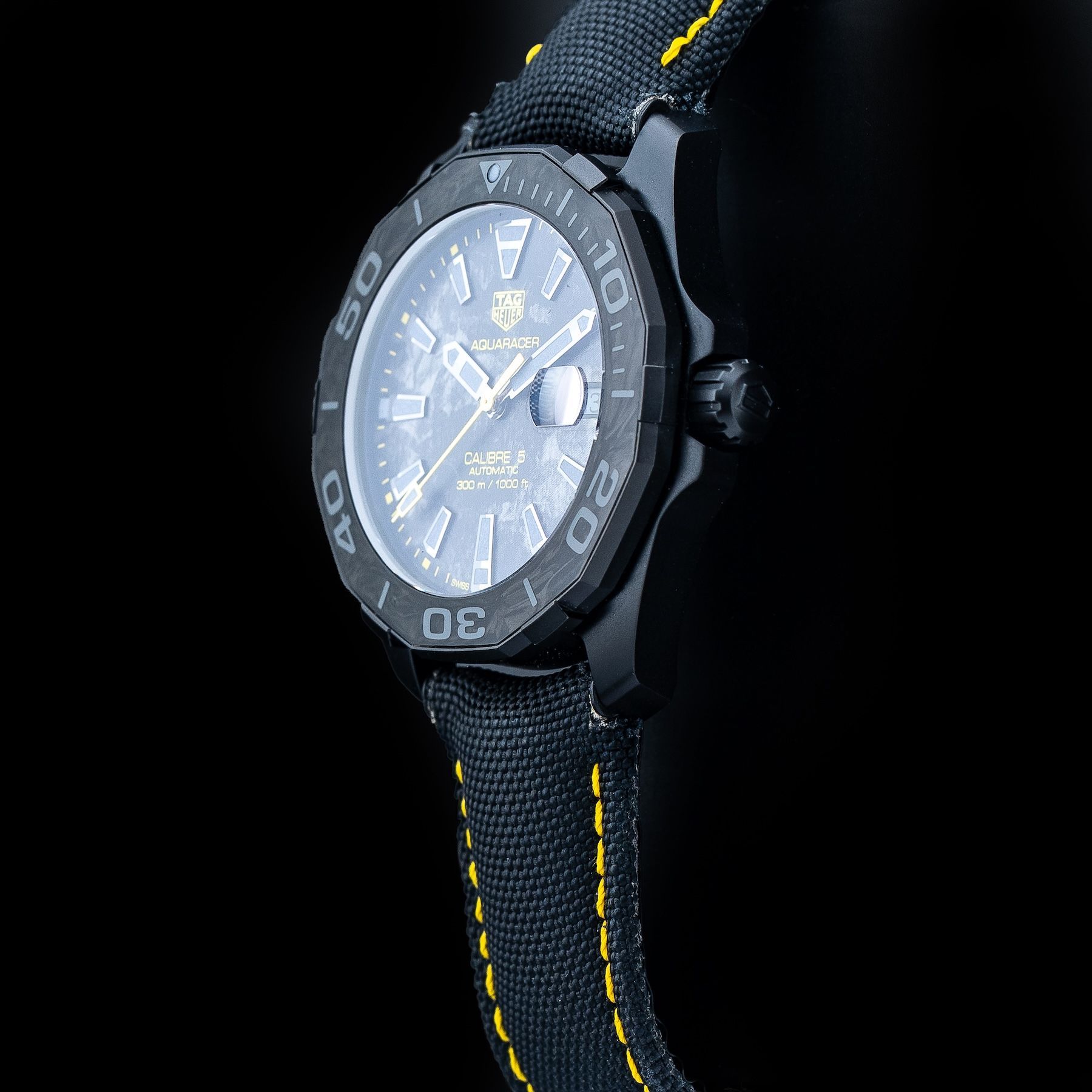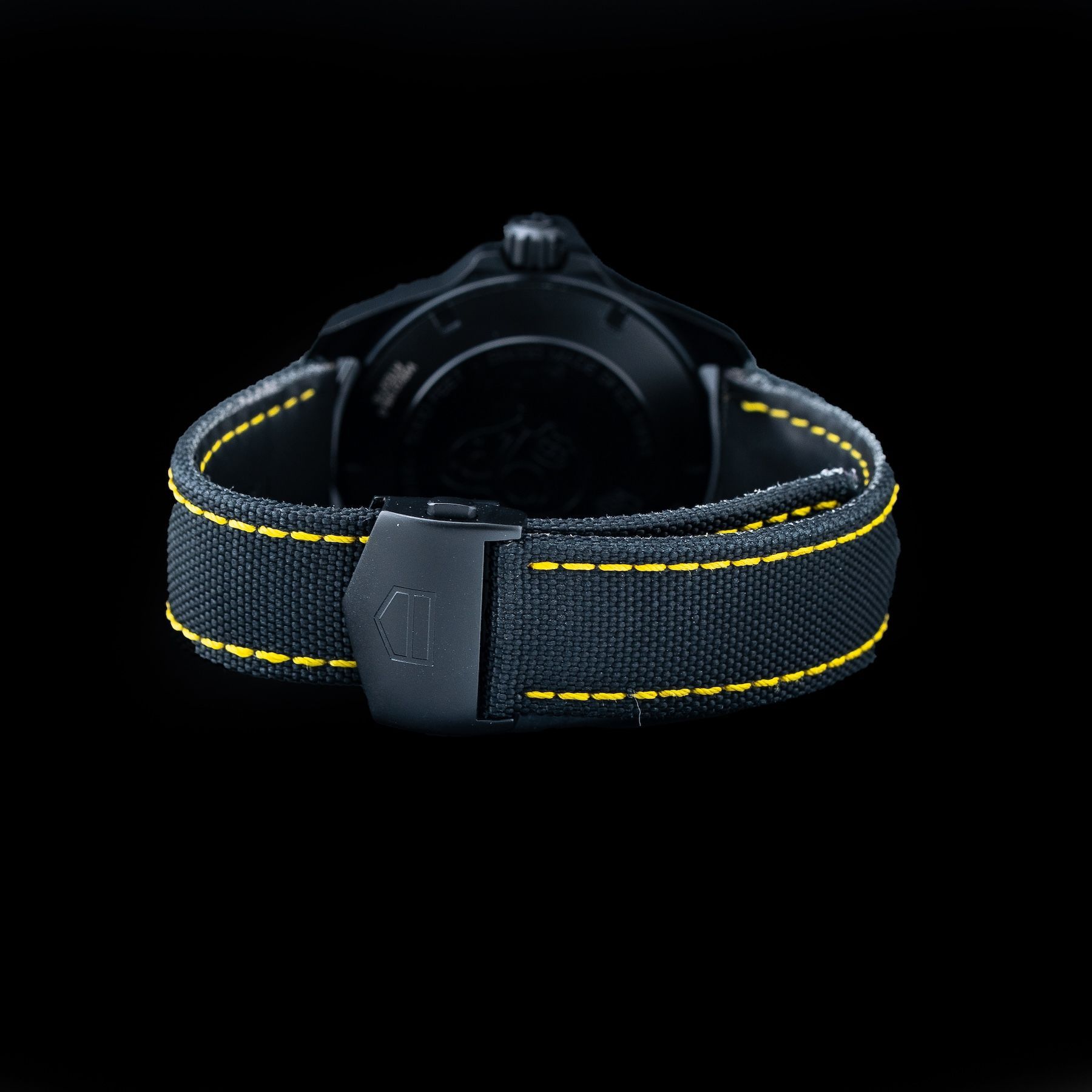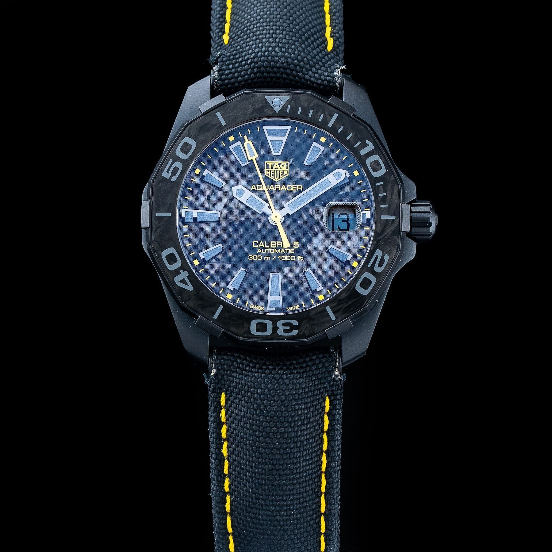 This watch features a 41mm Titanium PVD & Carbon PVD case on NYLON strap. This watch also sports a Carbon dial. Powered by a calibre 5 automatic movement. Water resistance up to 300 meters.
