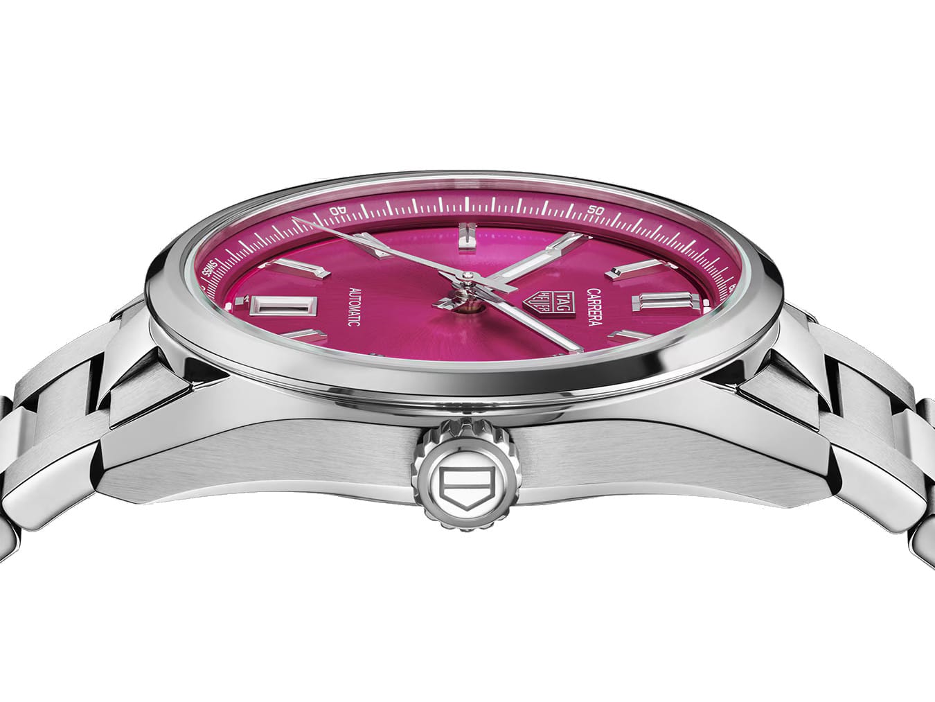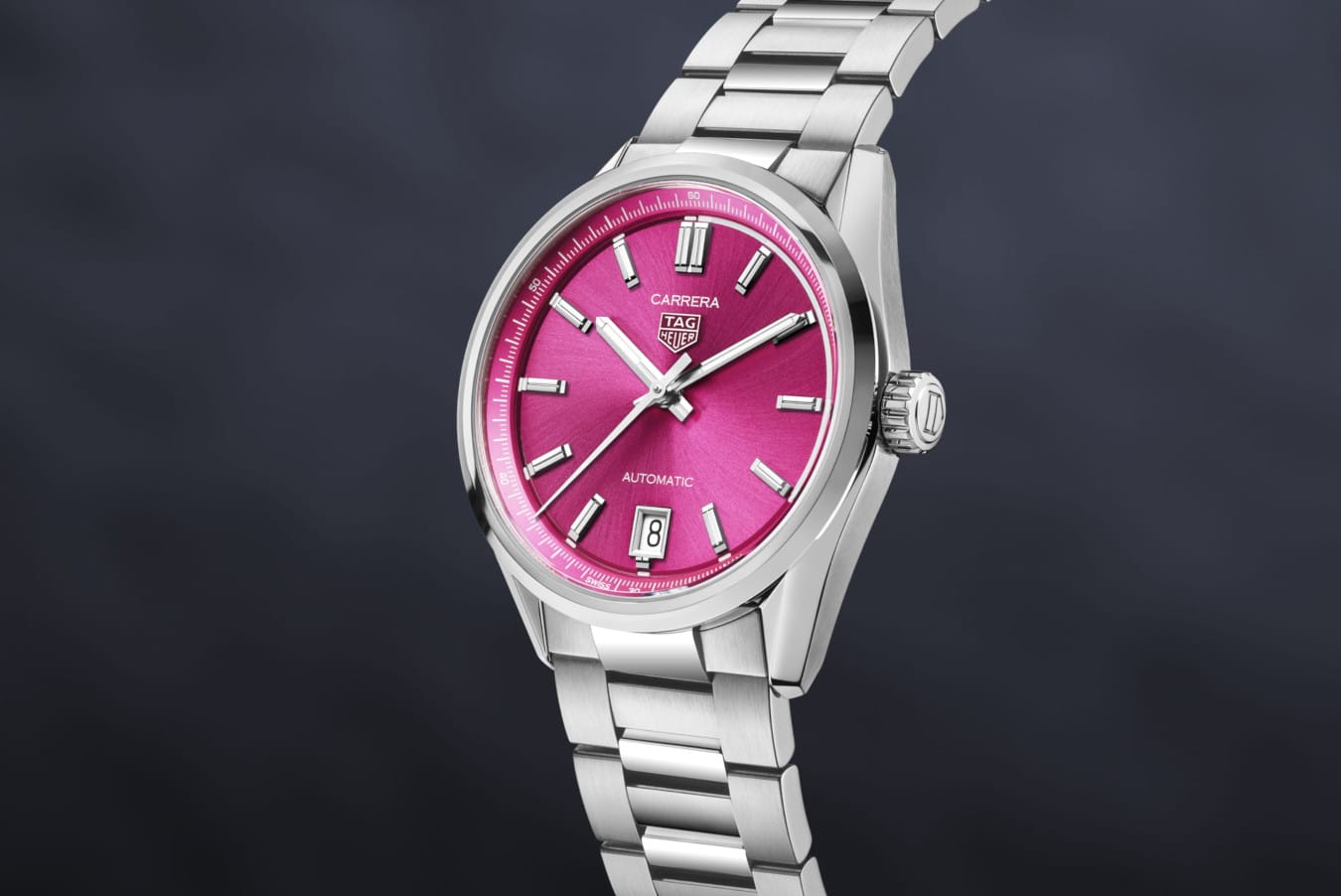 - This timepiece features a 36mm steel case paired with a high quality steel bracelet. It showcases a distinctive pink dial and is powered by a precise automatic winding movement. The watch is designed with a water resistance of up to 50m.