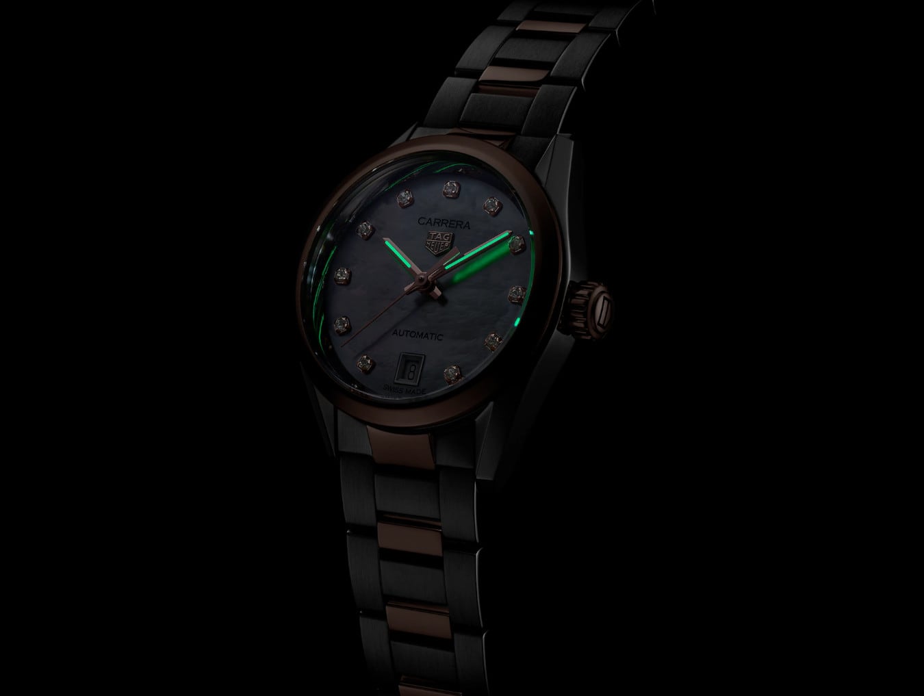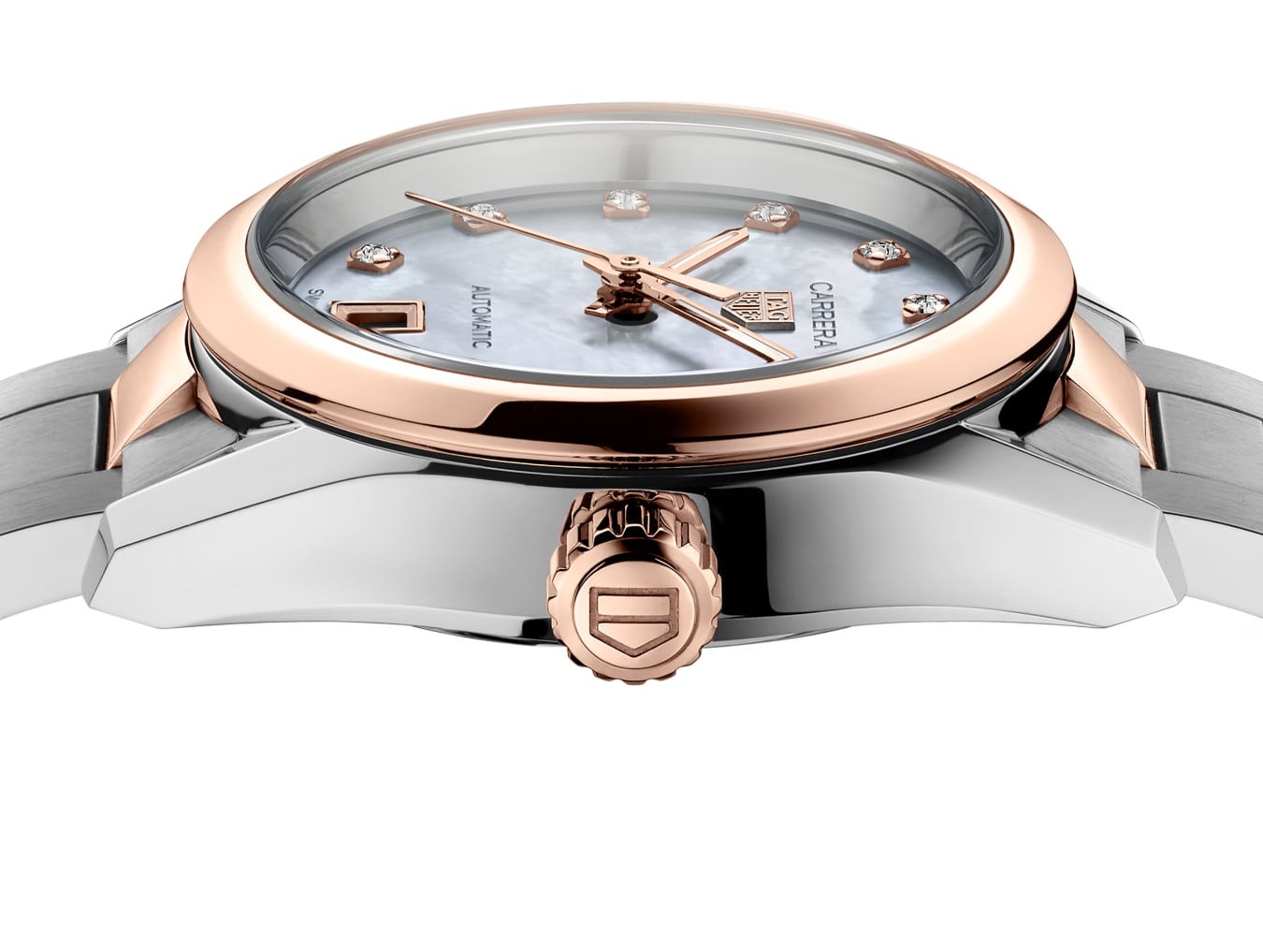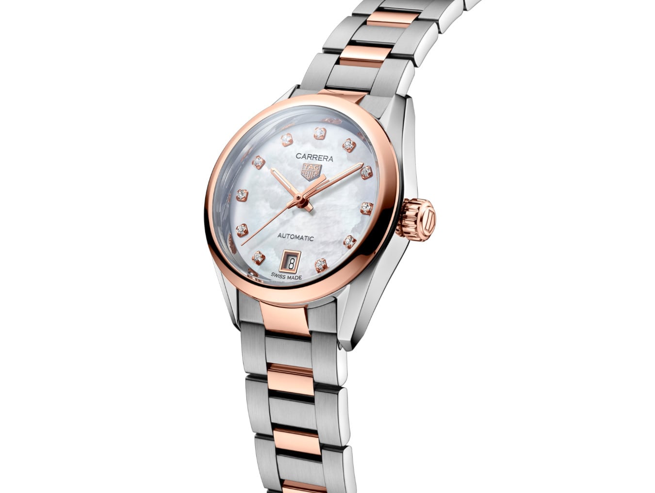 This emblematic and stylish version of the iconic TAG Heuer Carrera blends 18K 5N solid rose gold and steel with 11 1.30mm diamonds (0.088ct). On the refined mother of pearl dial: a date display at 6 o’clock, and Super-Luminova® filled hands and indexes.