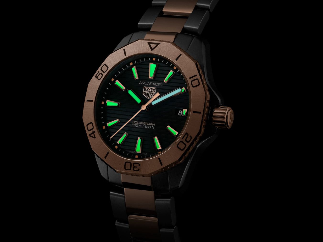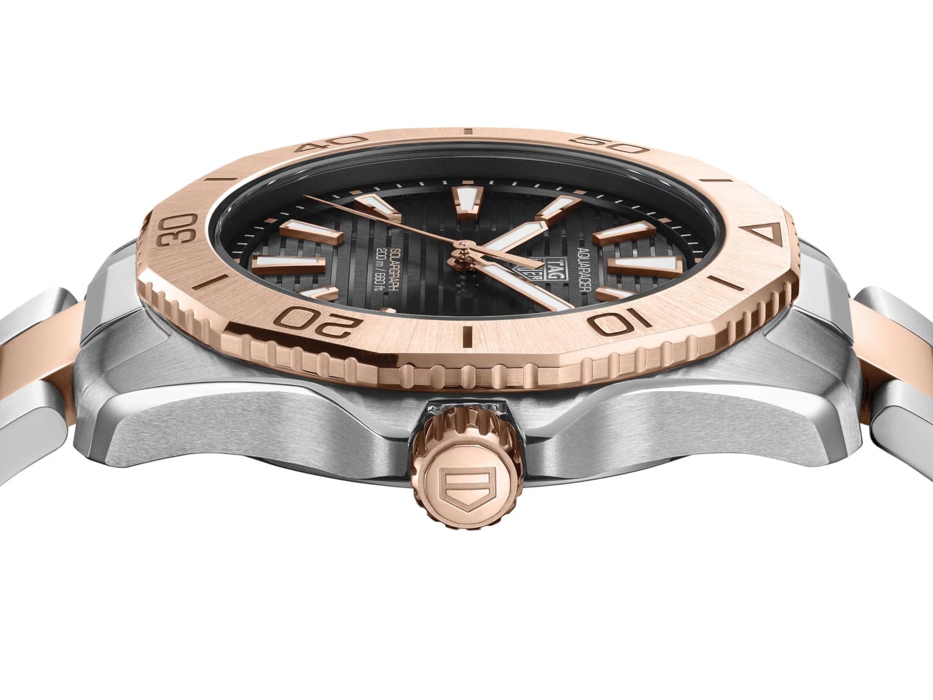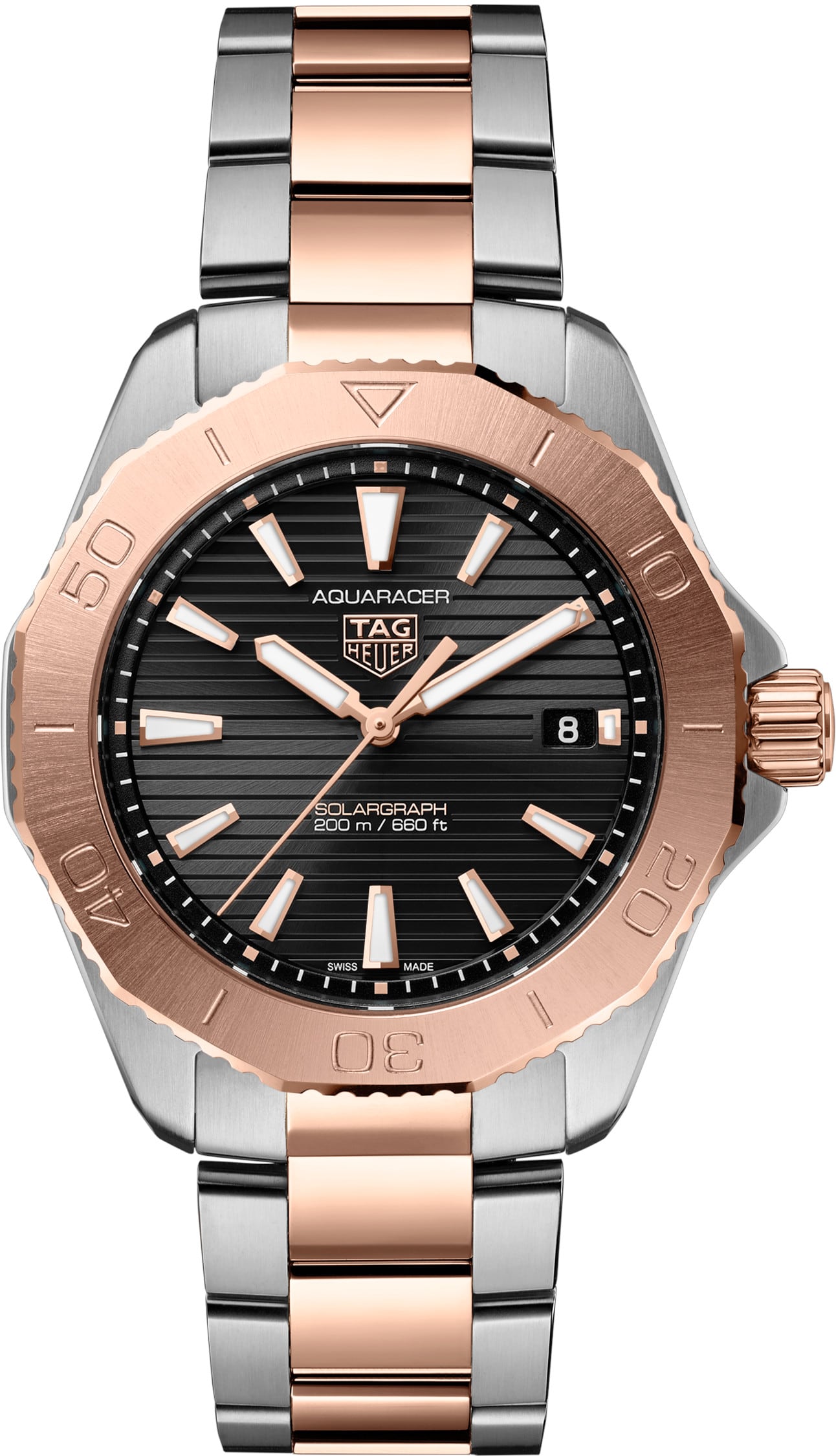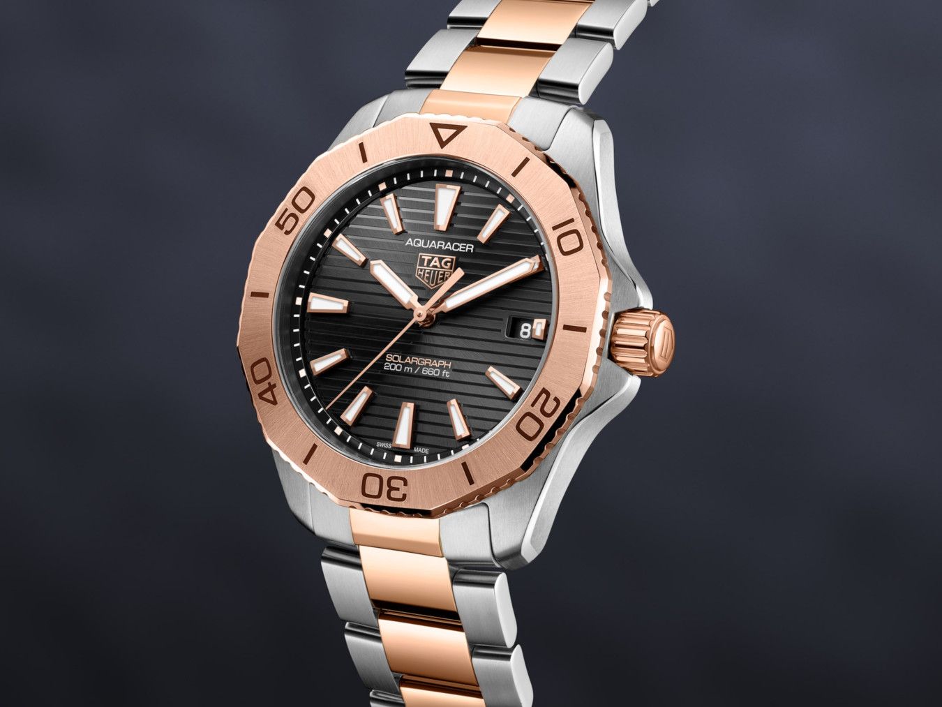 Embodying elegance and endurance, the TAG Heuer Aquaracer Professional 200 Solargraph Two-Tone with 18K 5N rose gold plated steel elements combines cutting-edge Solargraph technology with refined design elements. This 40mm timepiece is made for the adventurous, offering a perfect fusion of luxury and practicality.