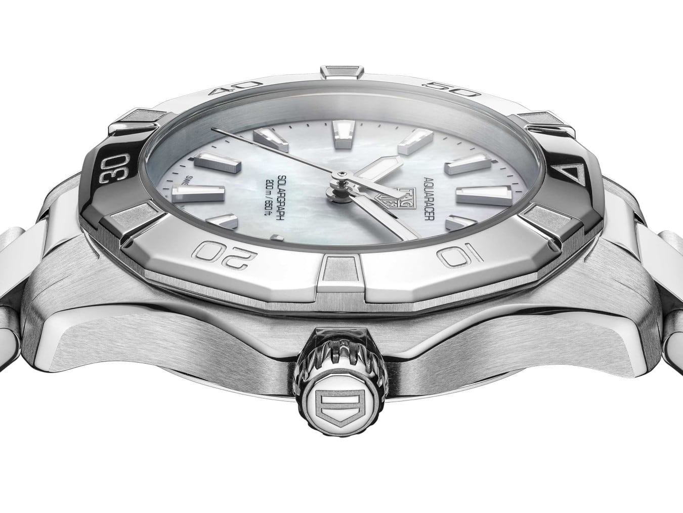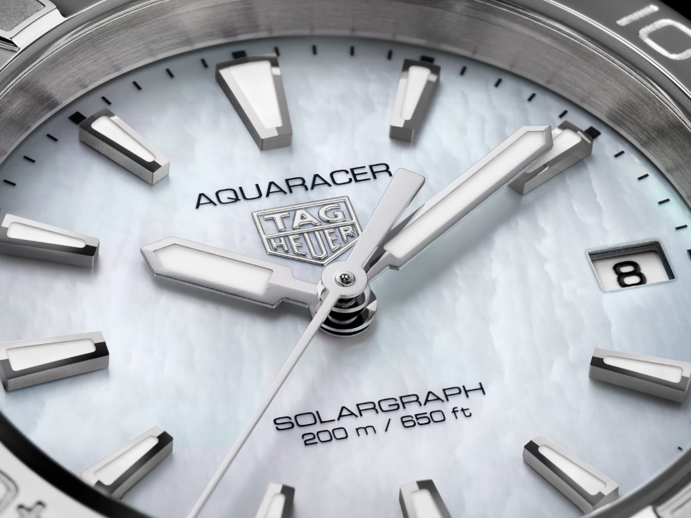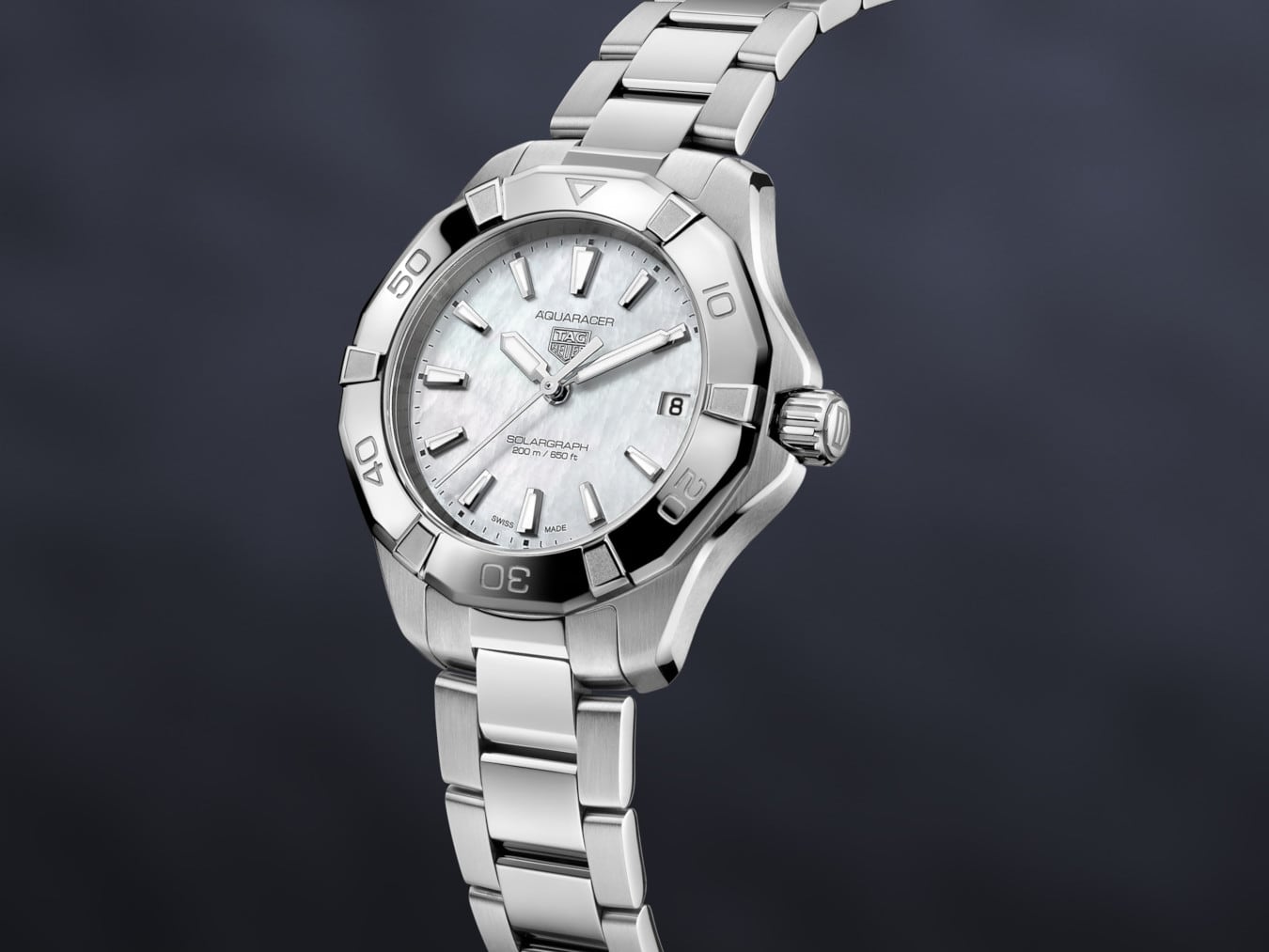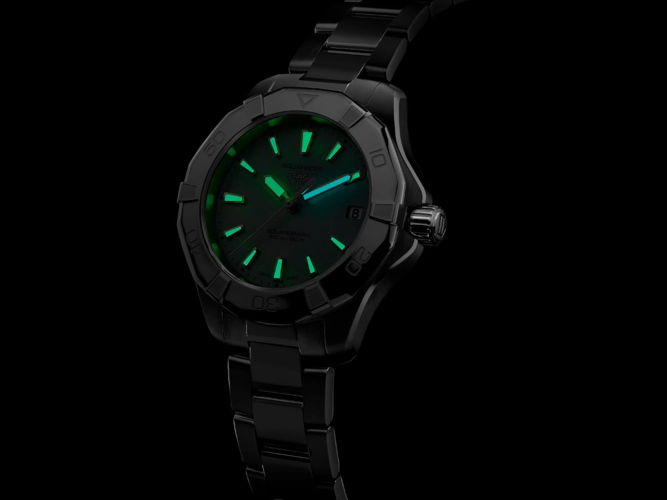 Immerse yourself in the celestial allure of the northern lights with this TAG Heuer Aquaracer, equipped with our Solargraph movement. Designed as an elegant yet resilient timepiece for the modern explorer, this sumptuous 34 mm watch is your go-to companion for rugged adventures and urban sophistication.