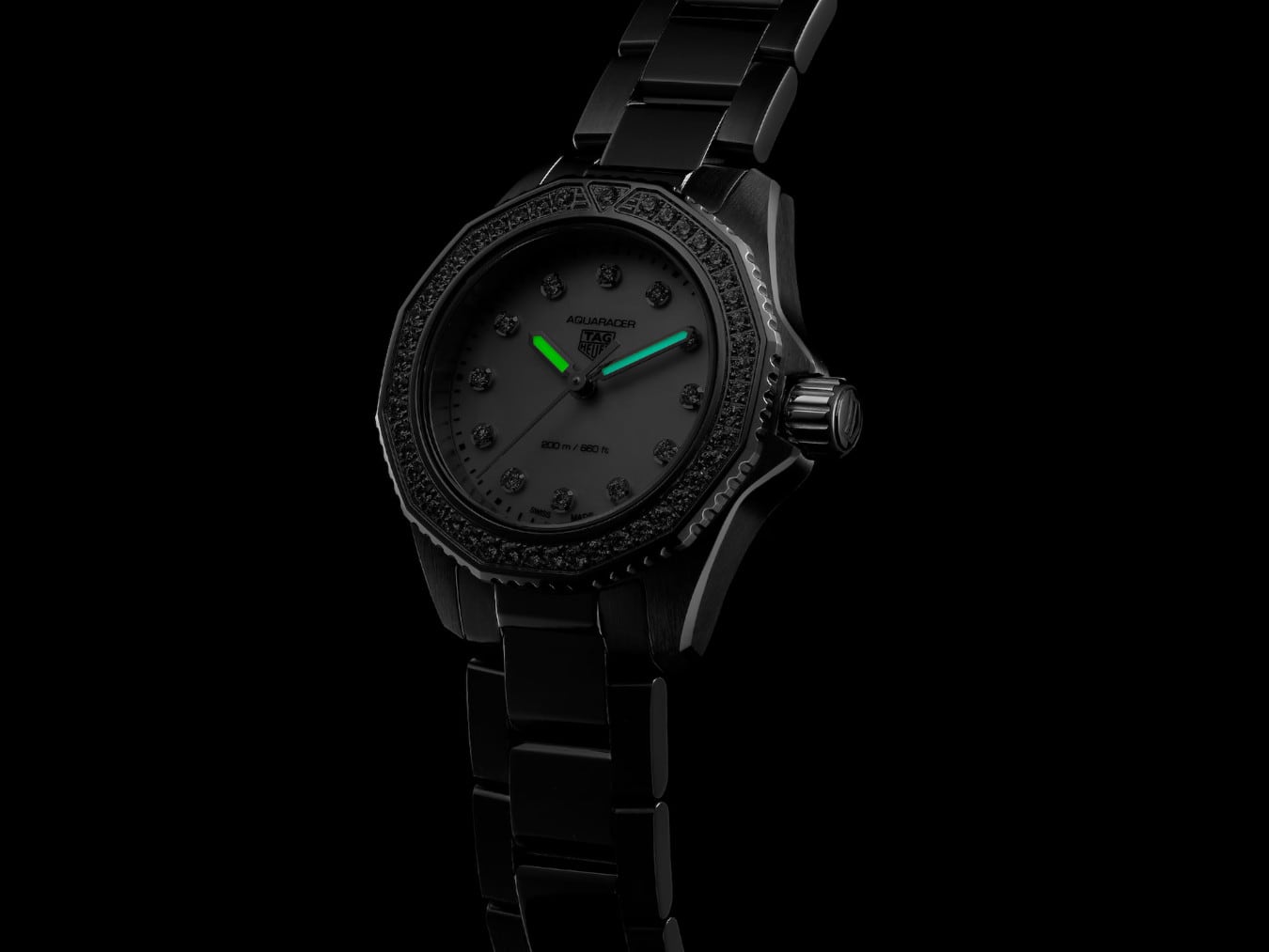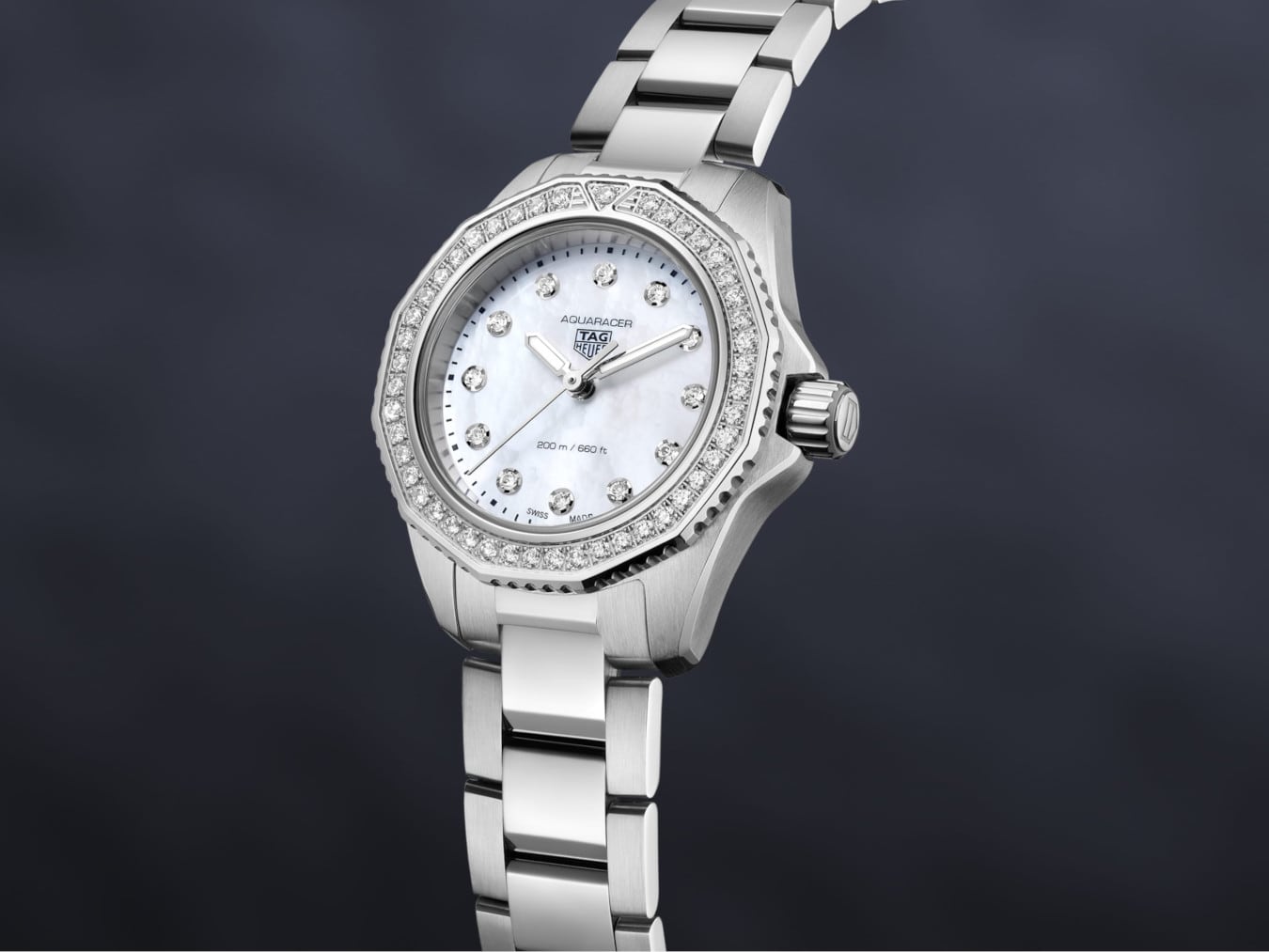 Decked out with a VS diamond-set bezel and dial, this TAG Heuer Aquaracer combines absolute elegance with extreme robustness. With a 30mm steel case and reliable quartz movement, this versatile tool watch is the perfect everyday companion.