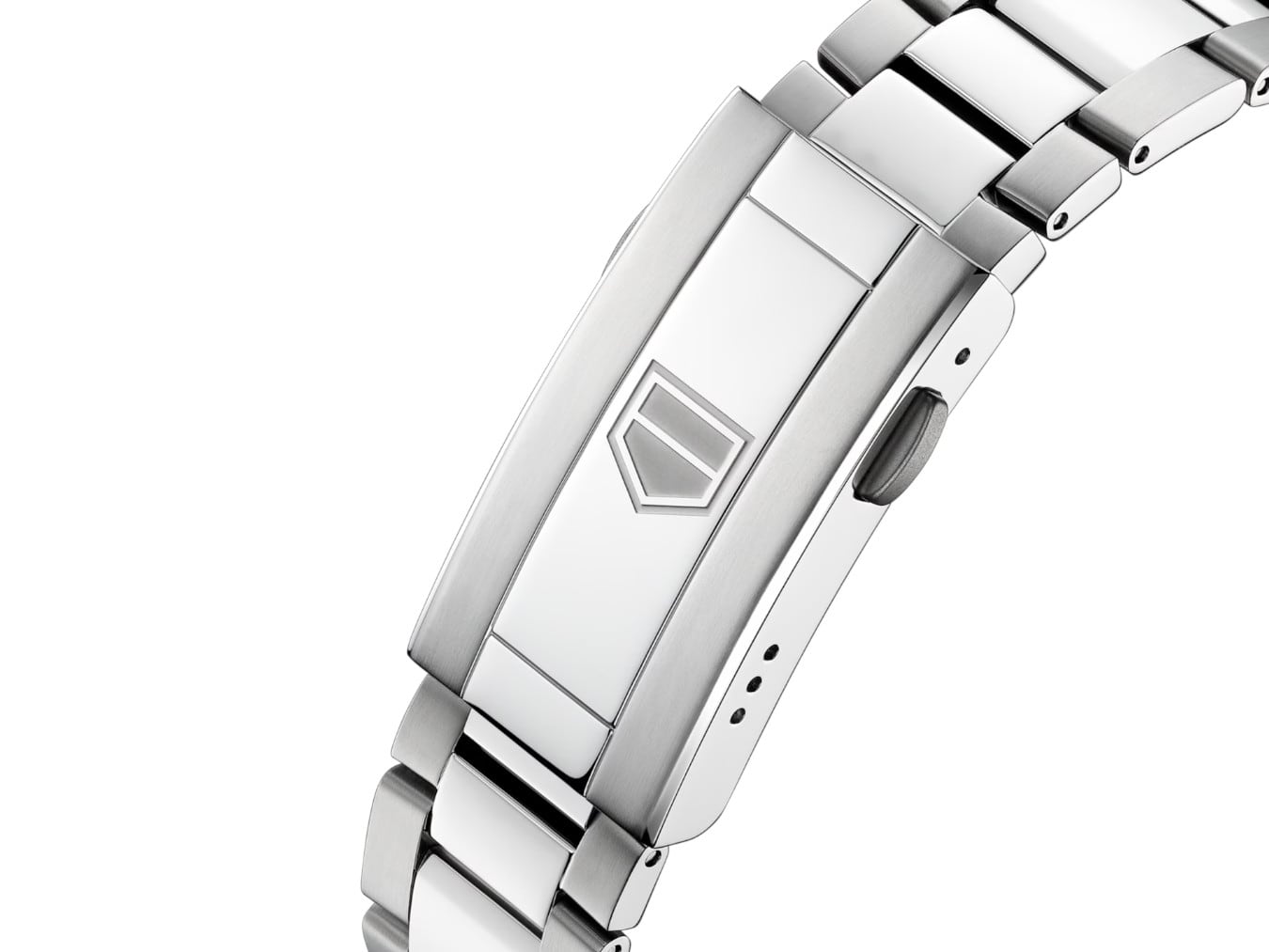 Highly functional and easy to adjust, the sleek yet robust steel bracelet has double safety-push buttons with an extension link for maximum comfort.