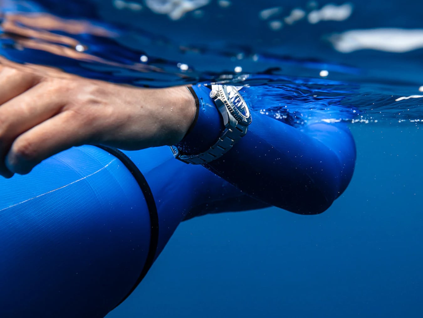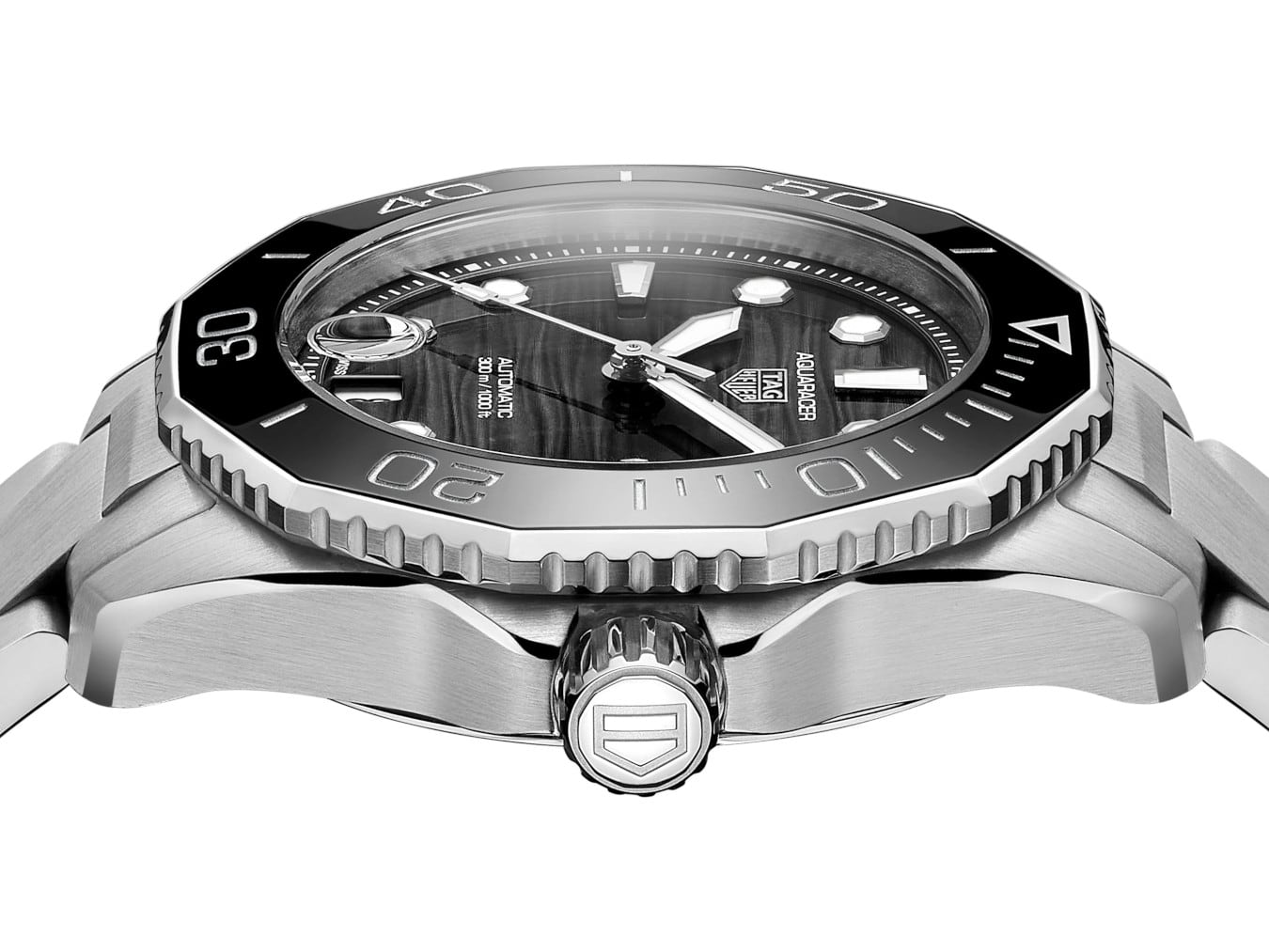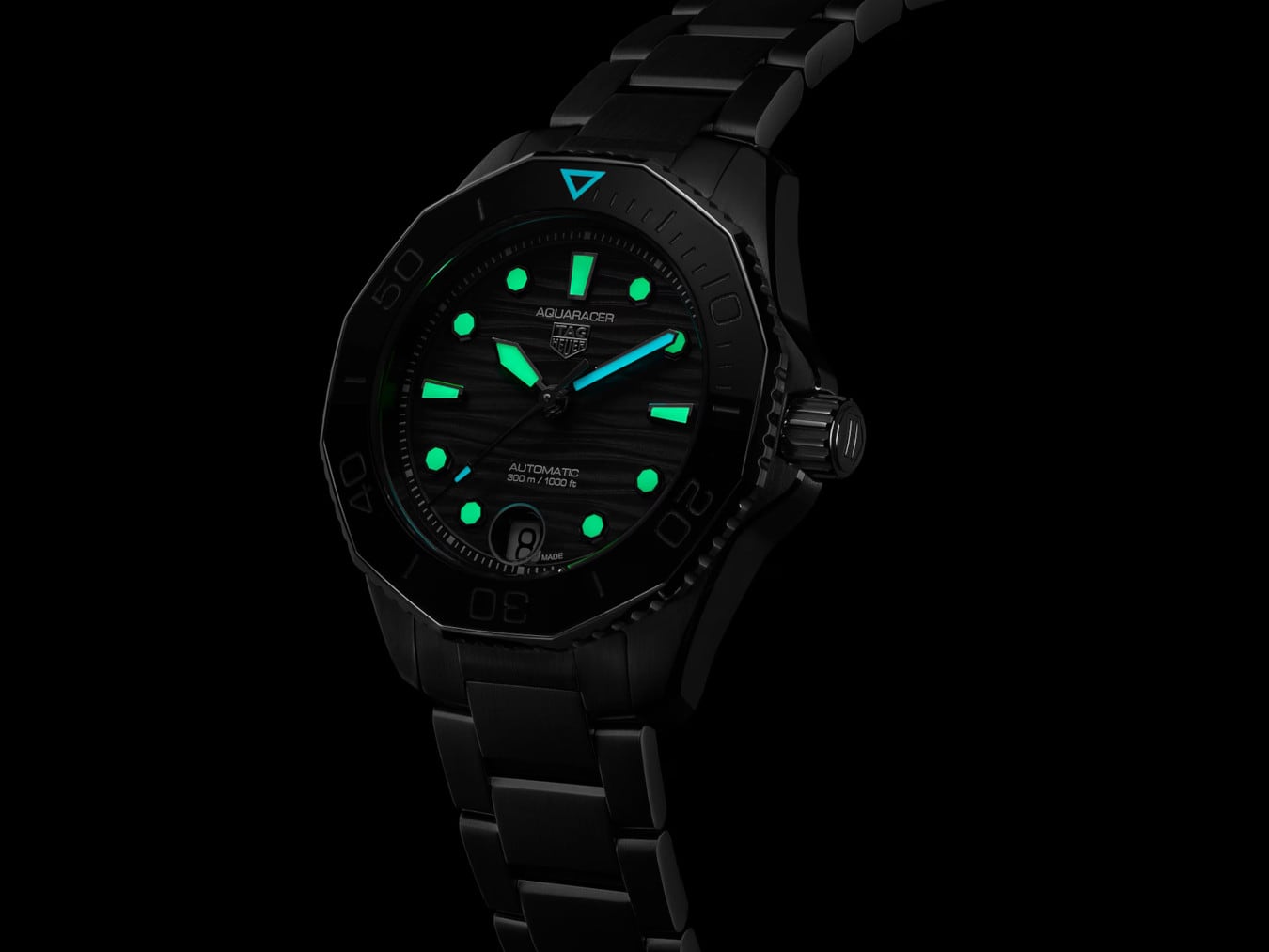 Technically robust with improved ergonomics, a unidirectional ceramic bezel with dive scale elegantly matches the dial and geometrical case features.