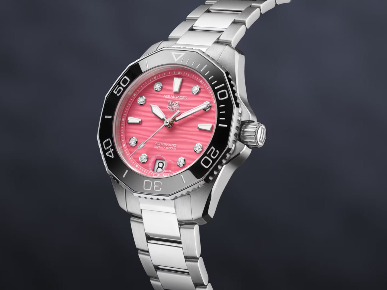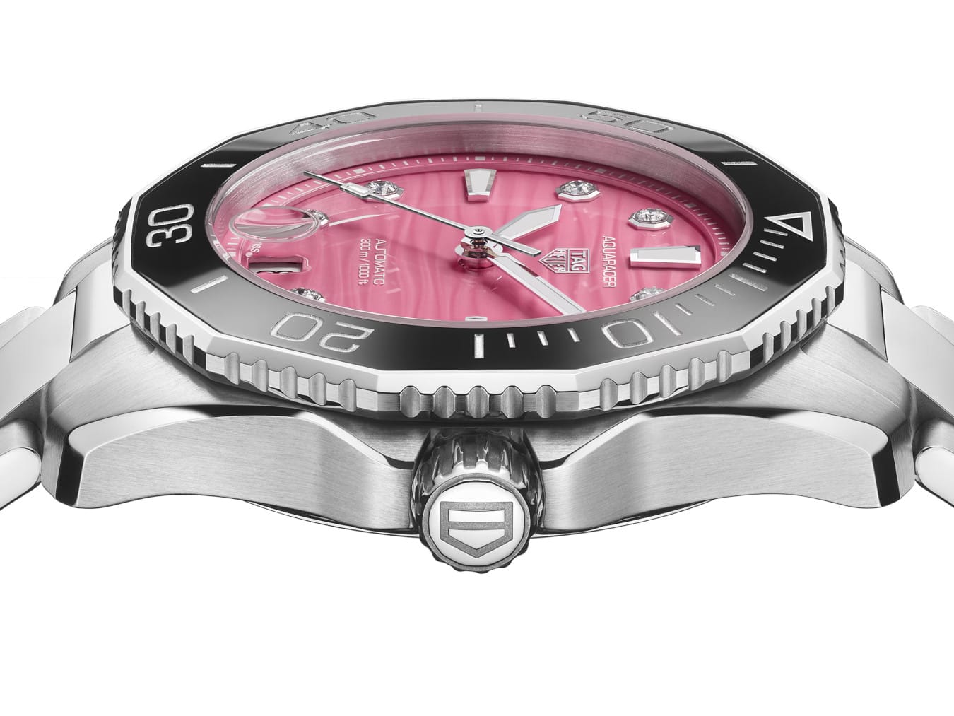 A true diving watch, this TAG Heuer Aquaracer makes a splash with its 36mm case and a fresh dial in bold pink. Featuring a wave motif, this pressure-proof professional model can endure any conditions and is an essential ally in your achievement.