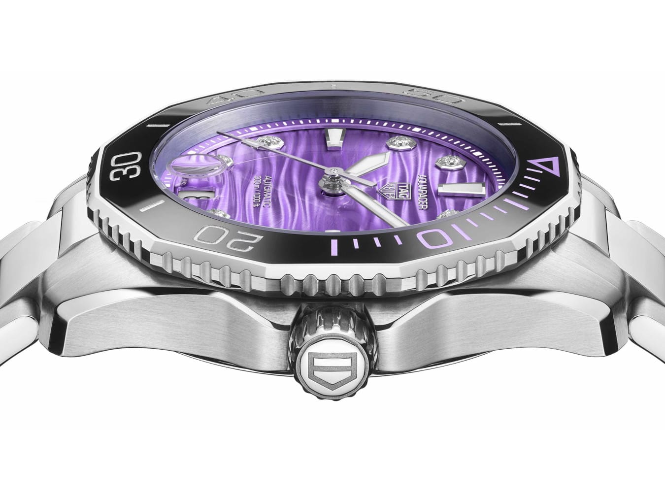 The TAG Heuer Aquaracer Professional 300 Date is inspired by the vivid colors of coral reefs found in the depths of the ocean. With its striking purple dial and diamond accents, this dive watch fuses elegance with rugged functionality, designed to thrive in the depths and dazzle onshore.