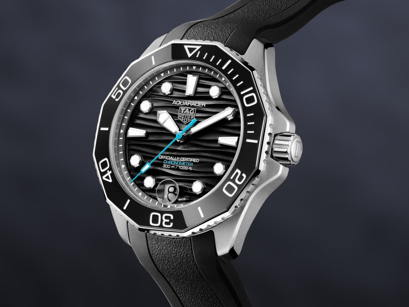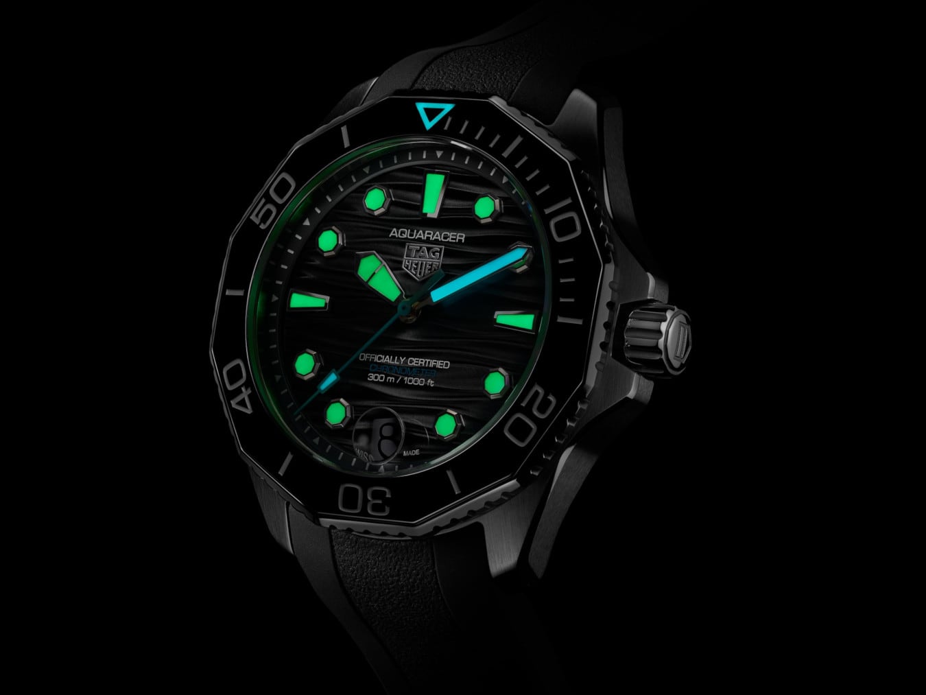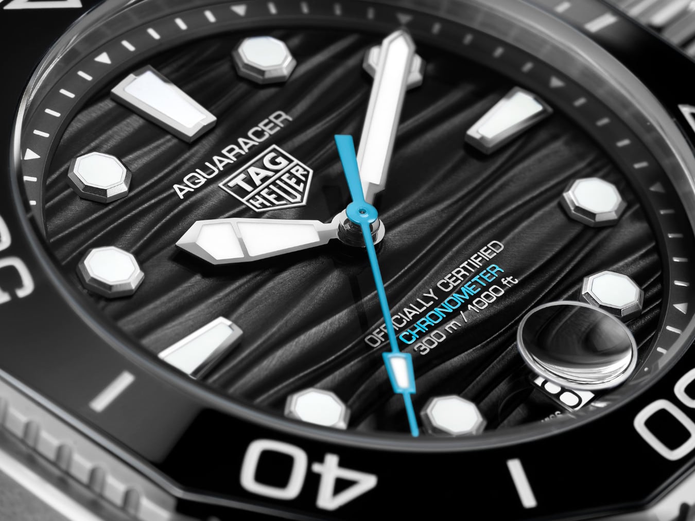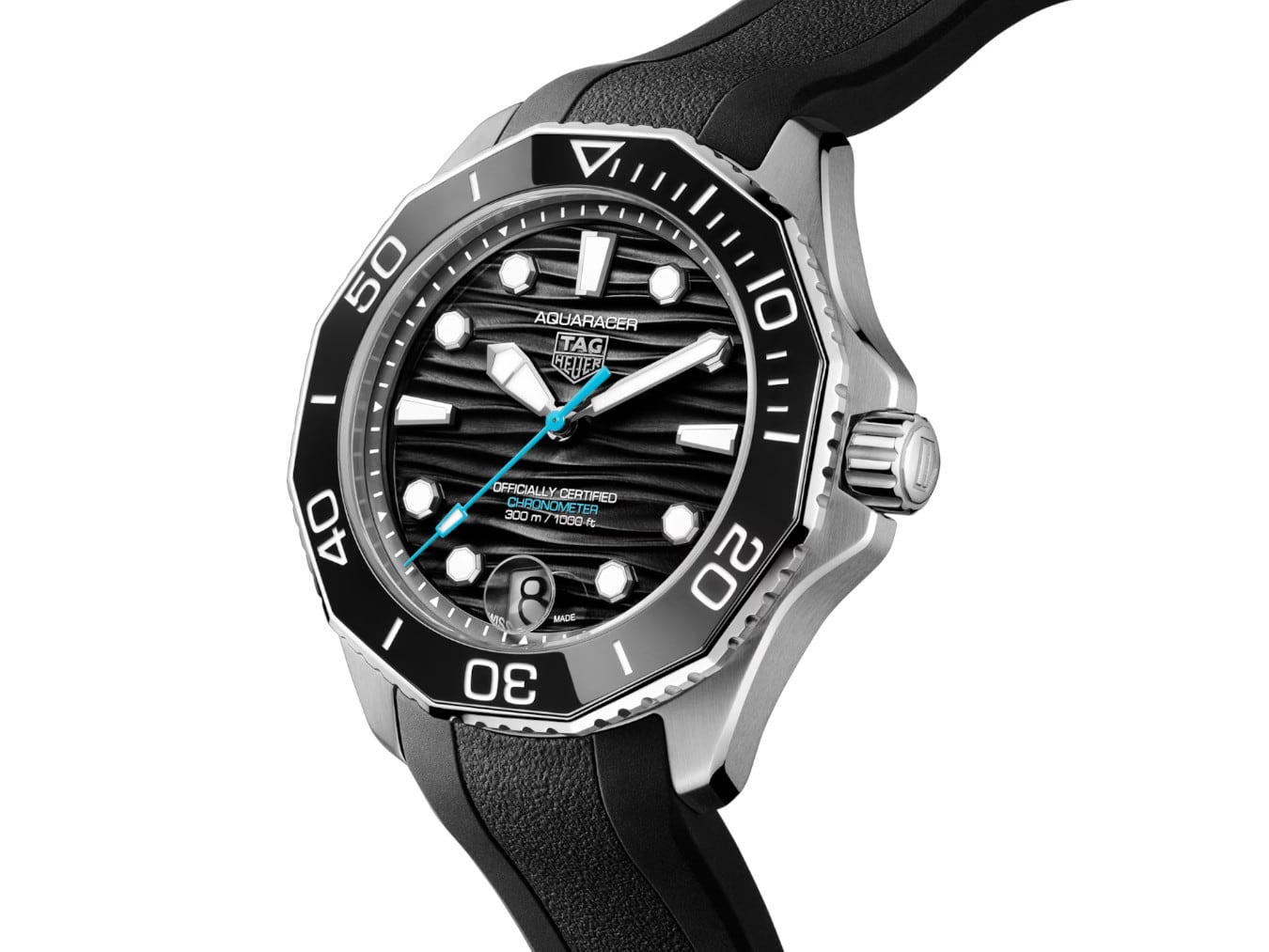 The black wavy pattern dial features luminescent indexes and hands and a light blue central hand evoking the hues of the deep sea. Bold Super-LumiNova® filled hands and octagonal hour markers, offering unrivaled legibility in the darkest. conditions.