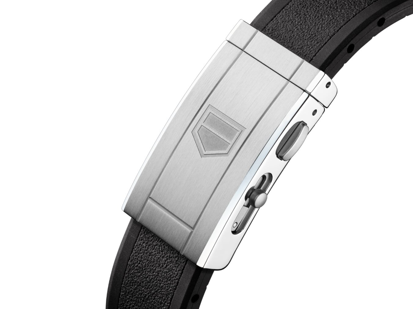 The resilient black rubber strap integrates a steel folding clasp with double safety push-buttons for absolute confidence in the most challenging odysseys.