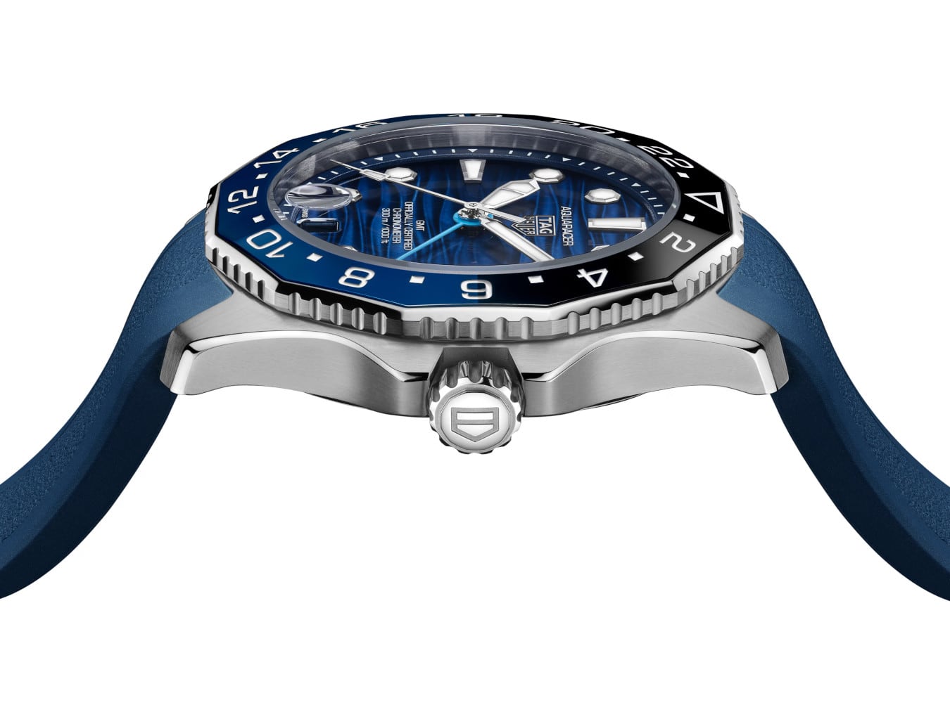 Draped in blue in a subtle nod to the ocean's mysteries, the dial shows luminous white Super-LumiNova®-filled hands and indexes and a light blue GMT hand.
