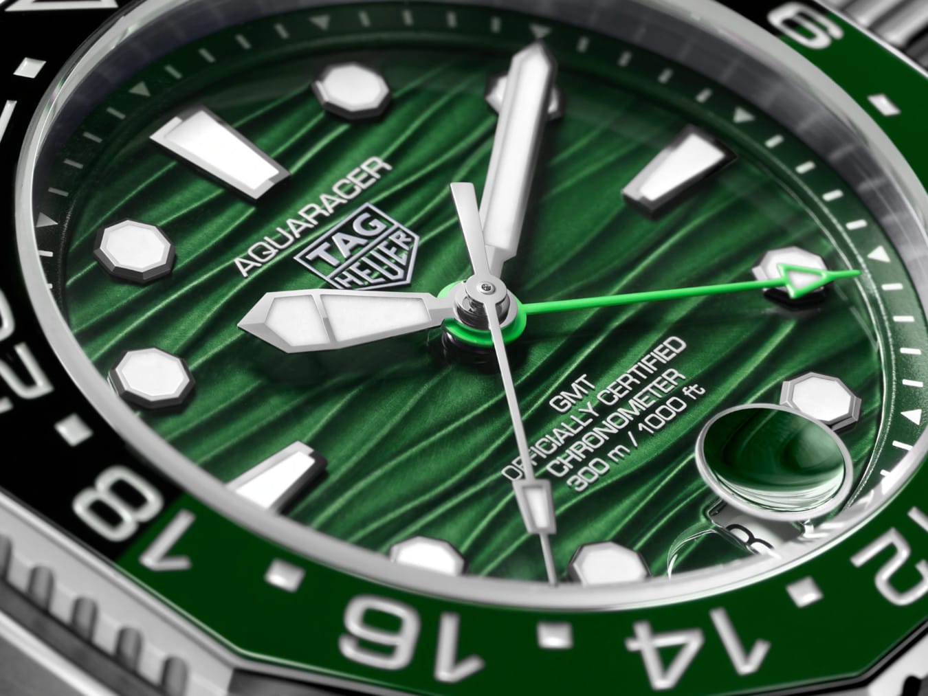 The intense green sunray brushed dial features luminous white Super-LumiNova®-filled hands and indexes, along with a distinctive vibrant light green GMT hand.