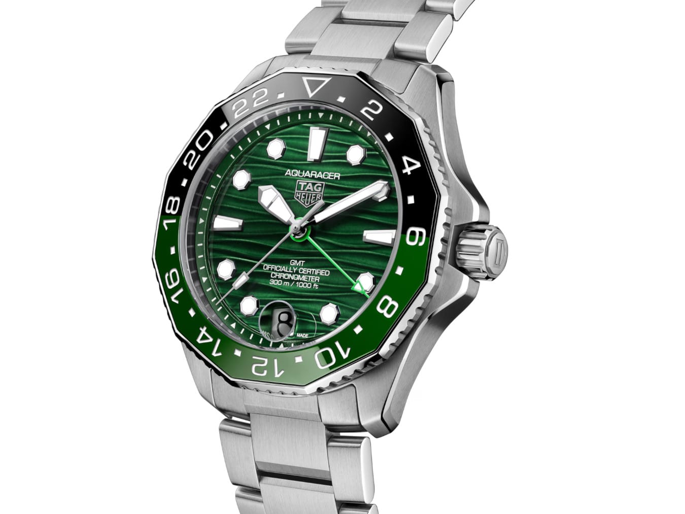 Encased in a fine-brushed, polished steel case, the bidirectional bezel features a highly ergonomic black and green ceramic inlay with a 24-hour scale.