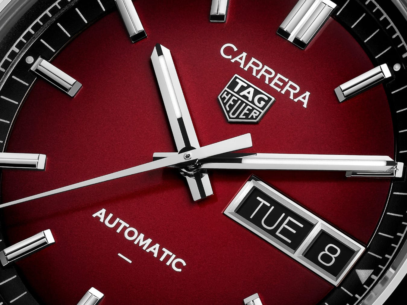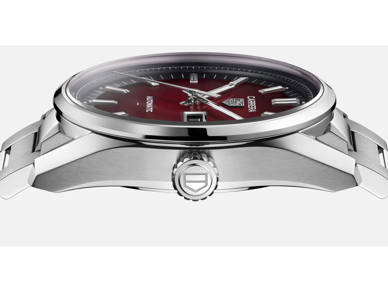 The smokey red opalin dial is a striking focal point, complemented by rhodium-plated hands and indexes, while the black flange adds depth, enhancing the overall design. The caseback proudly bears an engraved Victory Wreath, a symbol of the TAG Heuer Carrera collection’s success story.