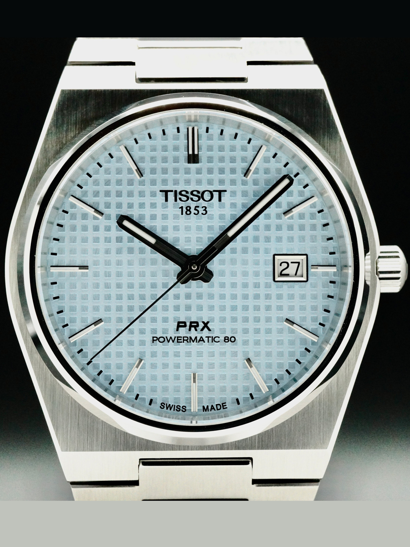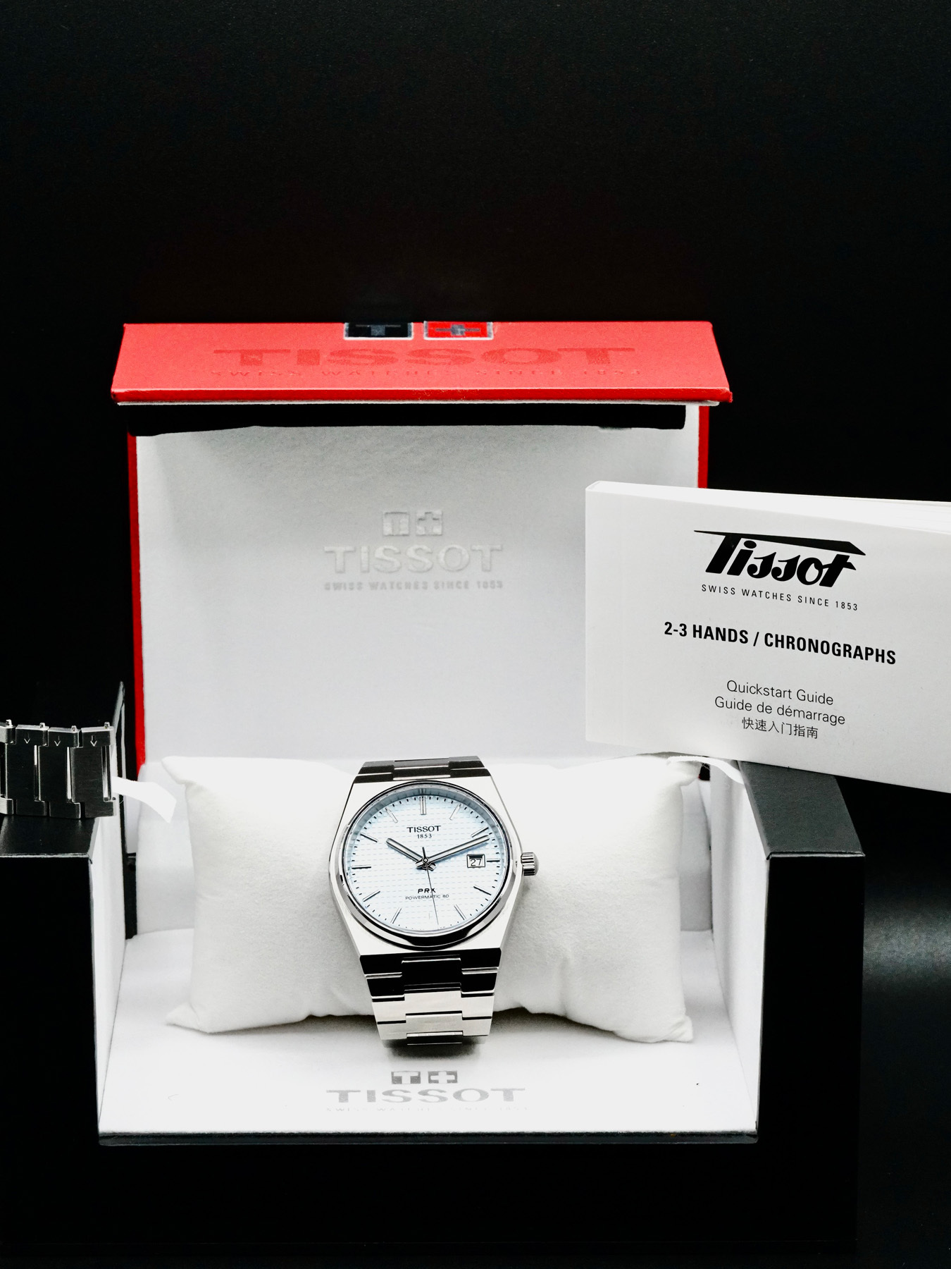 This Tissot T137.407.11.351.00 PRX Powermatic 80 Ice Blue is in Great condition. This watch includes its original box and instruction manual. No warranty card. Extra stainless steel bracelet links. This watch has been fully authenticated and certified by Exquisite Timepieces.