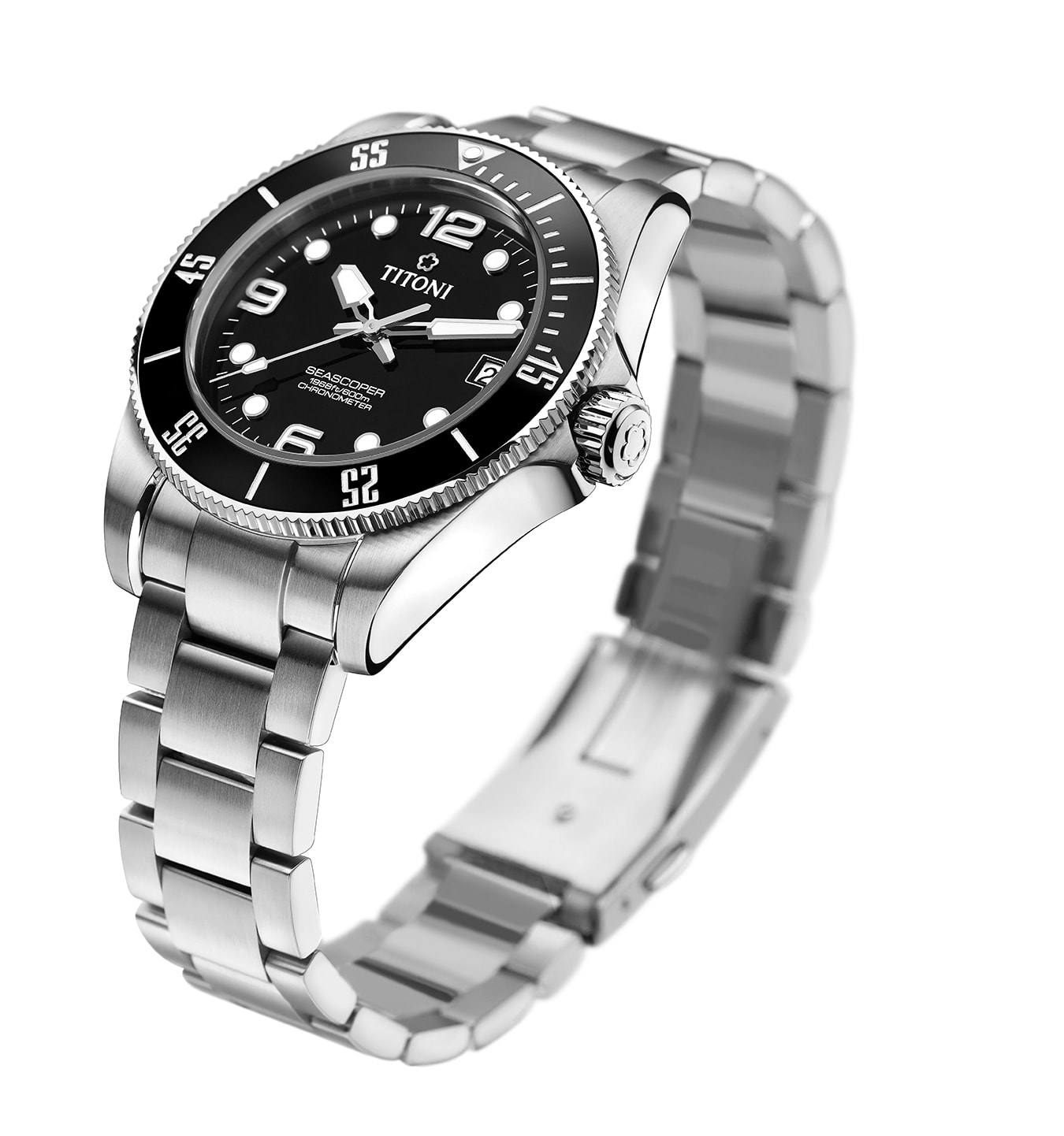 The folding clasp, designed specifically for this model, is another eye-catcher. With a clever diver’s extension, it not only guarantees the highest degree of wearing comfort and safety but also bears the quality seal of approval of every TITONI watch on its push-button, the plum blossom logo.