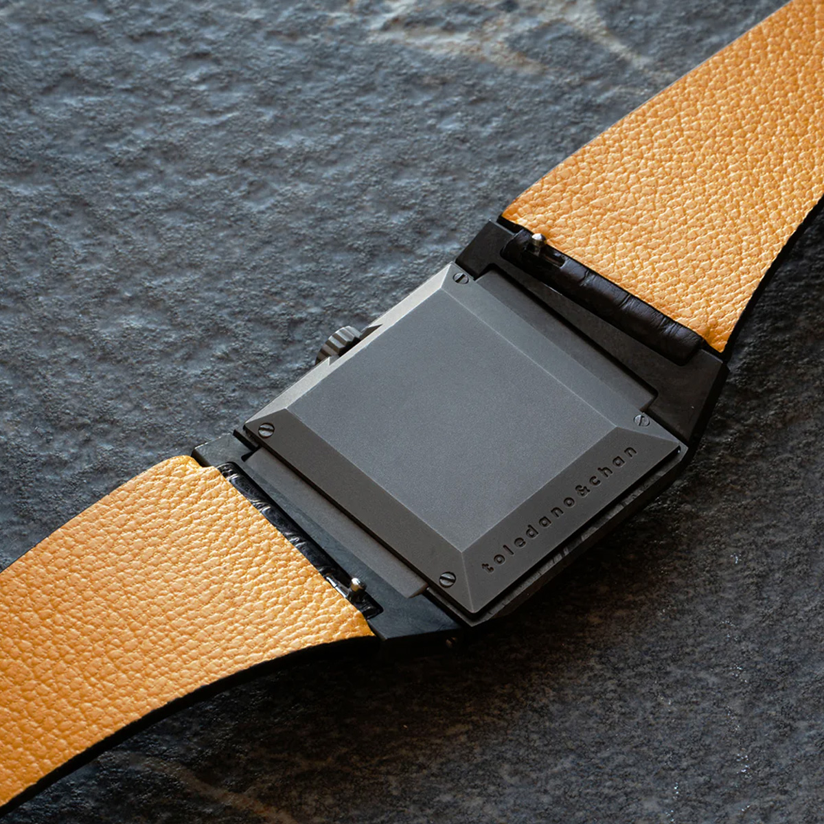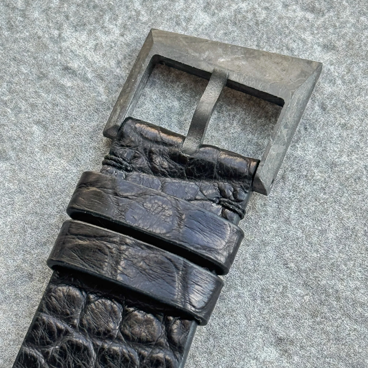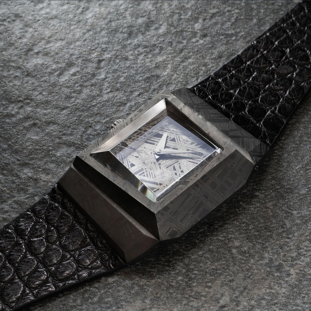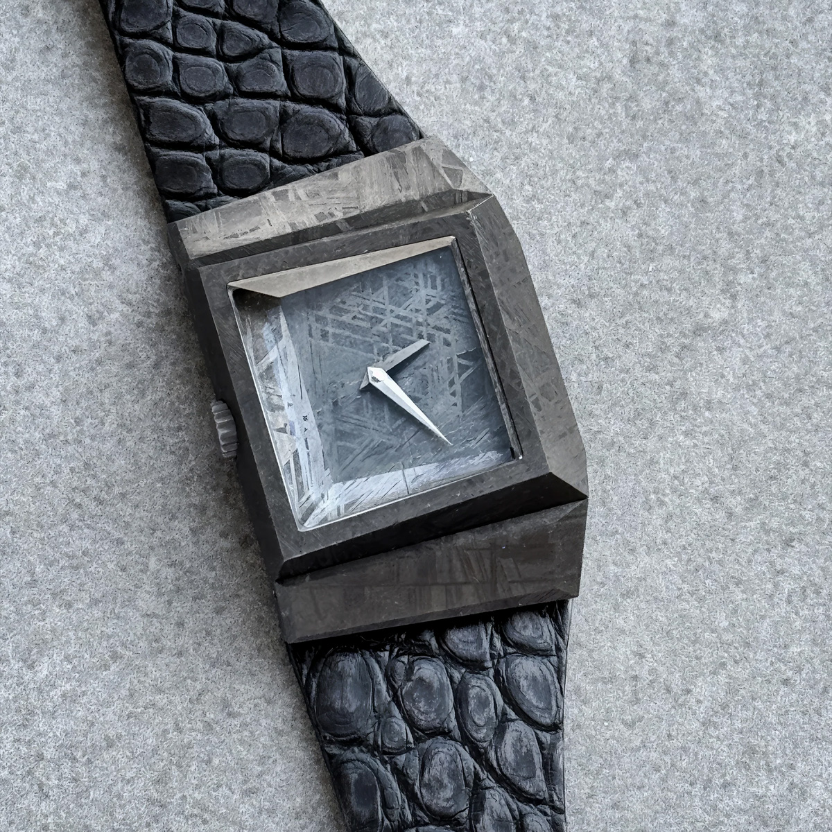 The production version of our all meteorite watch. Meteorite dial, meteorite case, meteorite lugs, and finally, a meteorite buckle. It comes on a black round scale crocodile strap, with a yellow backing. The b/1m is 32mm (1.5mm smaller than our previous models) It will be produced in 30 examples
