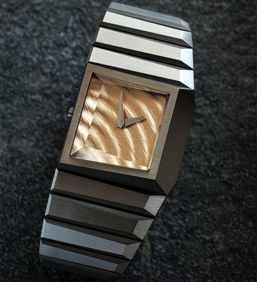 The B/1.3r is Toledano & Chan's most refined statement yet: a solid 18K yellow gold dial with hand-finished ripple pattern, housed in featherweight Grade 5 titanium. Where previous B/1 releases explored stone dials—lapis lazuli, meteorite—this fourth iteration turns inward, using precious metal to capture light in ways that shift with every angle of the wrist.