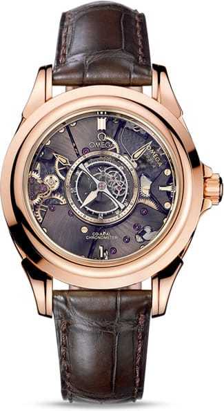 This numbered edition model, with its scratch-resistant sapphire crystal dial and gold-fashioned indexes, offers a captivating view into the working mechanics within the timepiece. The 18K gold seconds hand is fixed directly on the titanium tourbillon cage. The 38.7 mm 18K red gold case is presented on a brown leather strap. Powering this watchmaking wonder is the Co-Axial calibre 2635.