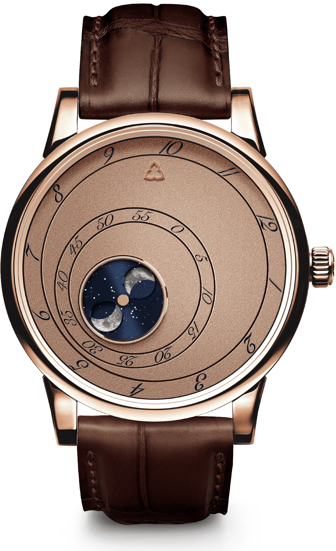 On a sand-blasted dial, Trilobe takes its eccentric complication one step further with a waltz of moons. A gear wheel with 59 cogs evokes the orbit of the Moon around the Earth, completing a full cycle of 29.5 days. Through this mechanism, the moons quietly reveal their age. For the first time, the moon phase is co-axially linked to the seconds wheel, under a dynamic and mesmerizing starry sky. Les Matinaux are thus honored: three rotating rings bear the Maison’s first complication.
